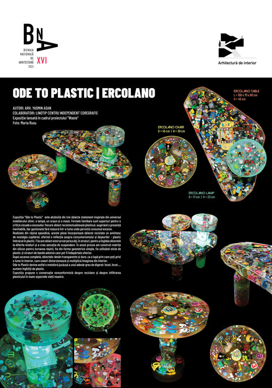 Expoziția “Ode to Plastic” este alcătuită din trei obiecte statement inspirate din universul mobilierului zilnic: o lampă, un scaun și o masă. Formele familiare sunt suporturi pentru o critică vizuală a excesului: fiecare obiect recontextualizează plasticul, sugerând o prezență inevitabilă, dar gestionată fără măsură, într-o lume unde persistă consumul excesiv.
