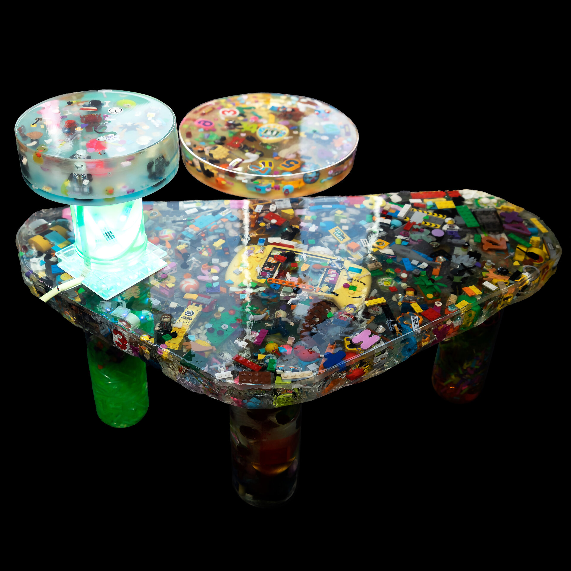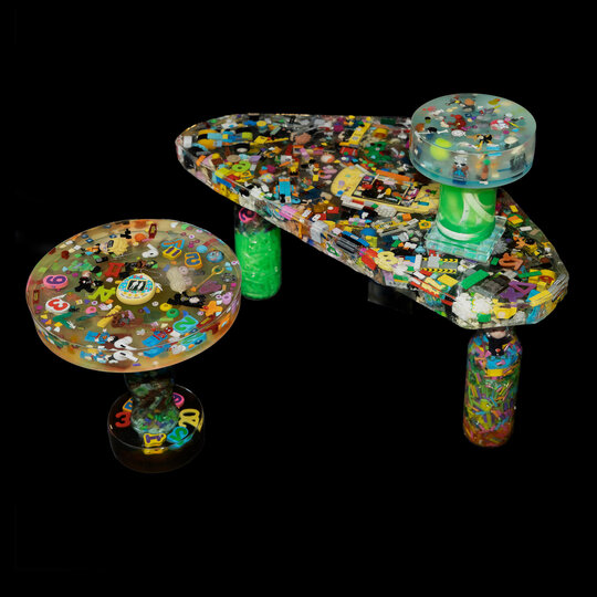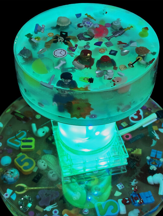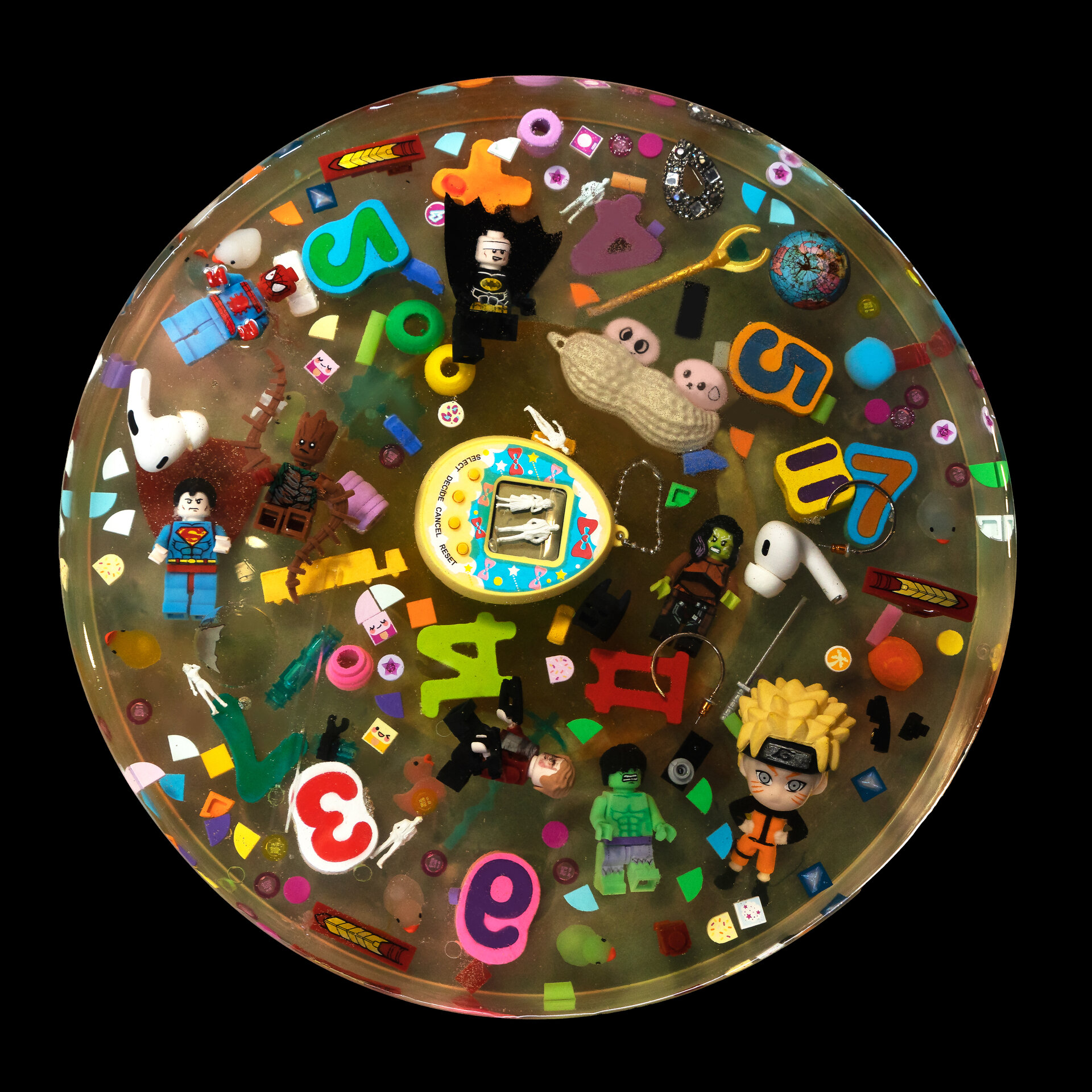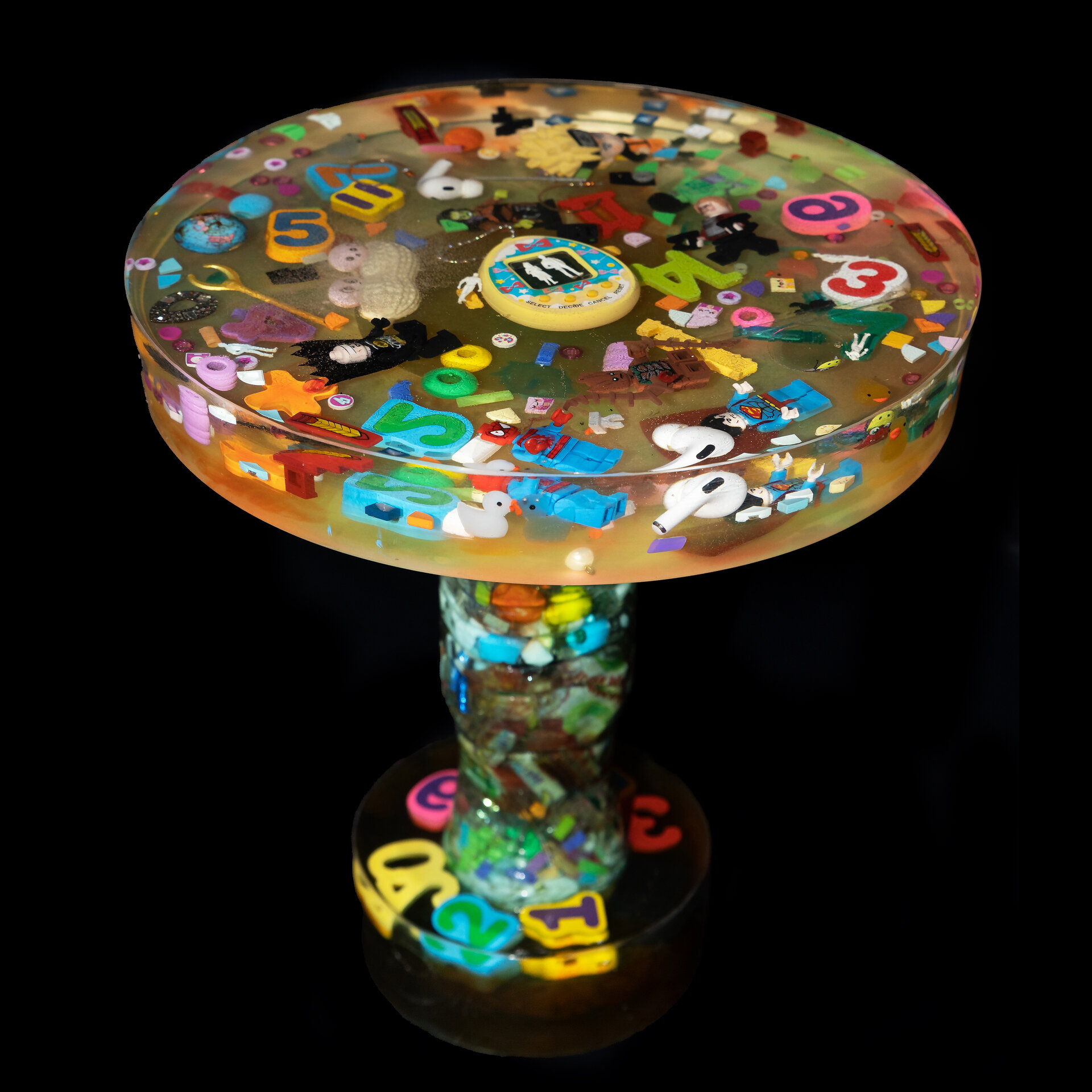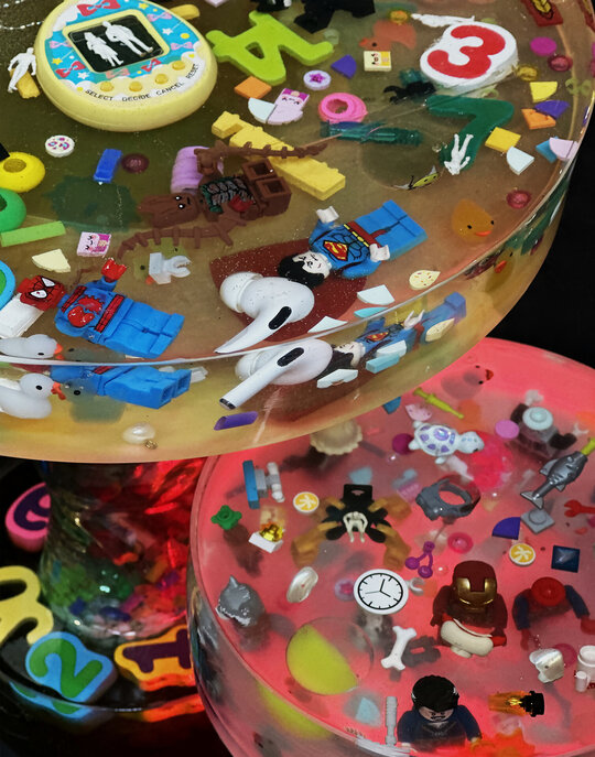 Realizate din rășină epoxidică, aceste piese încorporează obiecte reciclate ce amintesc de nostalgia copilăriei, oferind o reflecție asupra consumerismului și deșeurilor – plastic îmbrăcat în plastic.