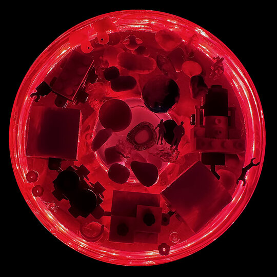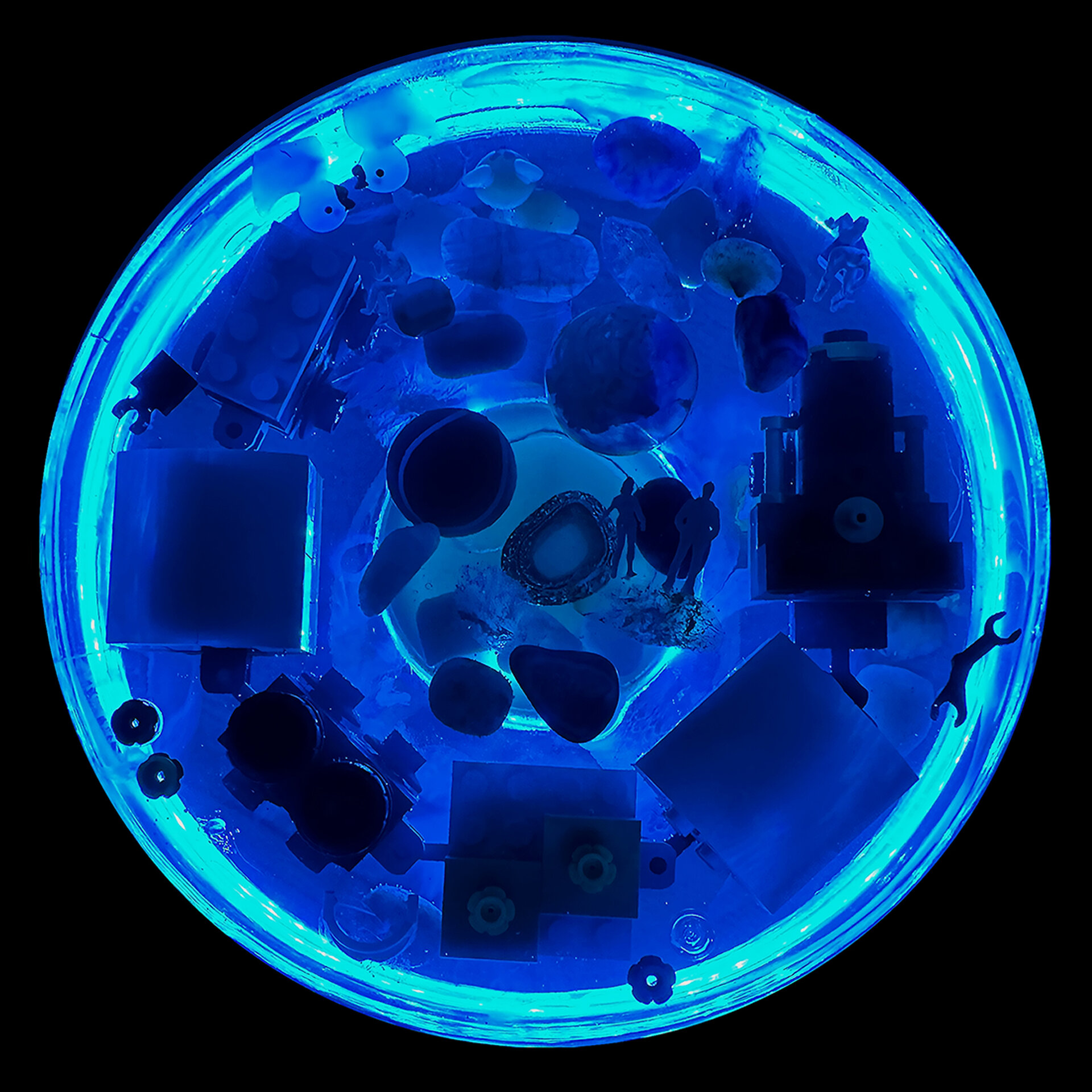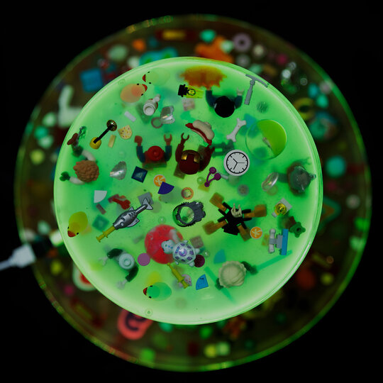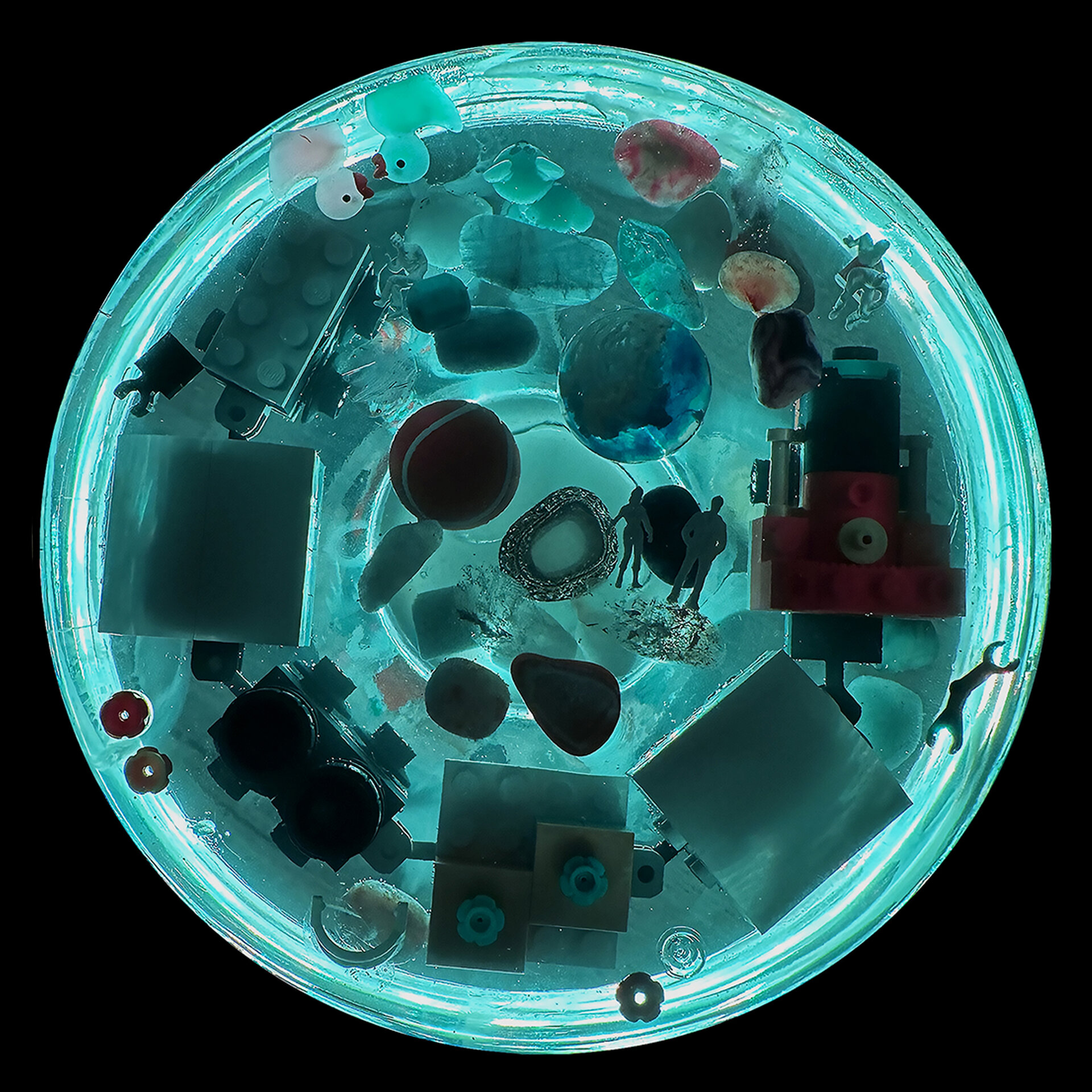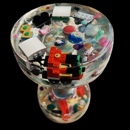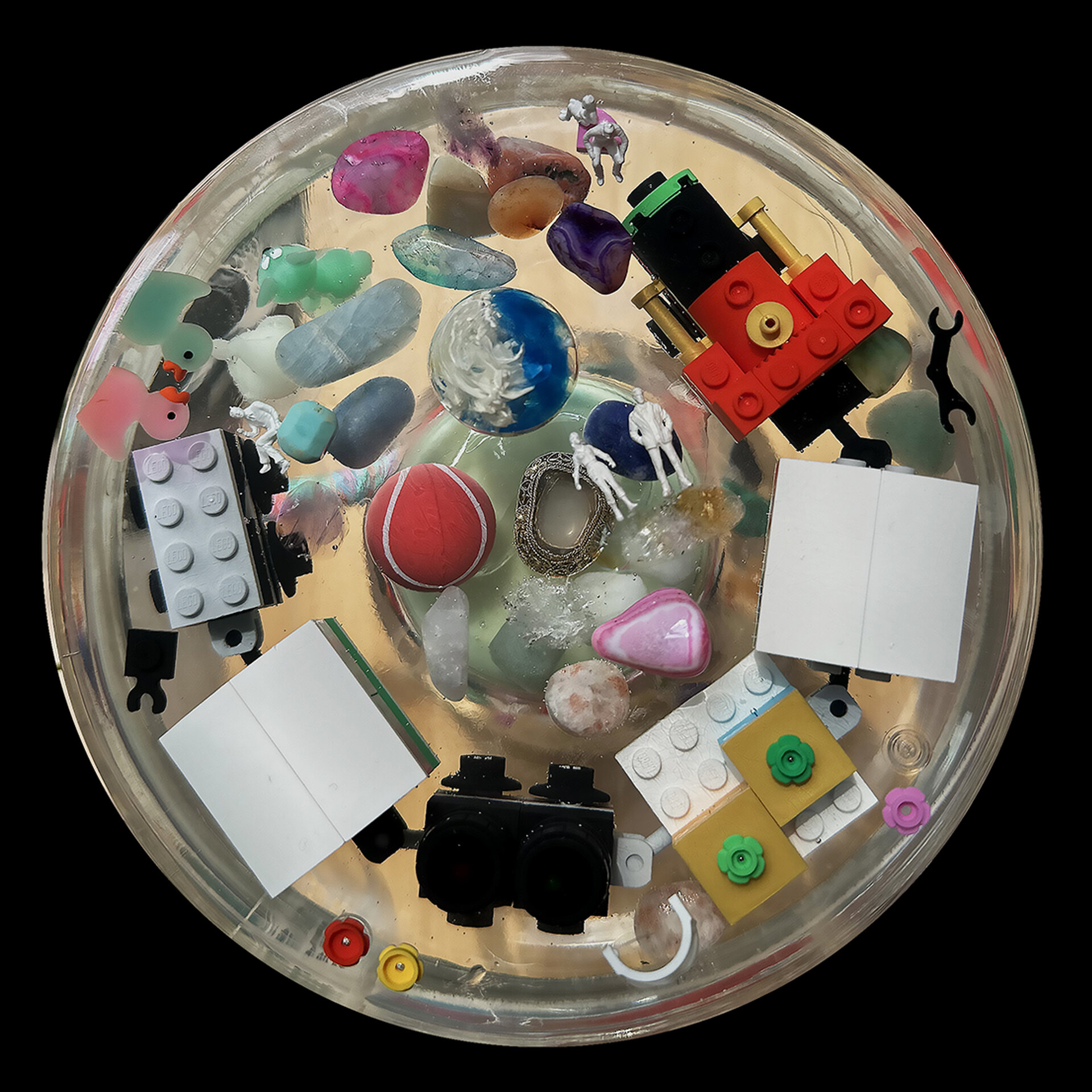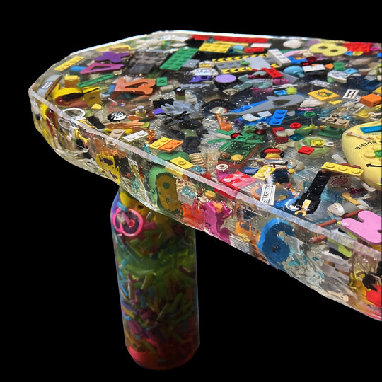 Realizate din rășină epoxidică, aceste piese încorporează obiecte reciclate ce amintesc de nostalgia copilăriei, oferind o reflecție asupra consumerismului și deșeurilor – plastic îmbrăcat în plastic.