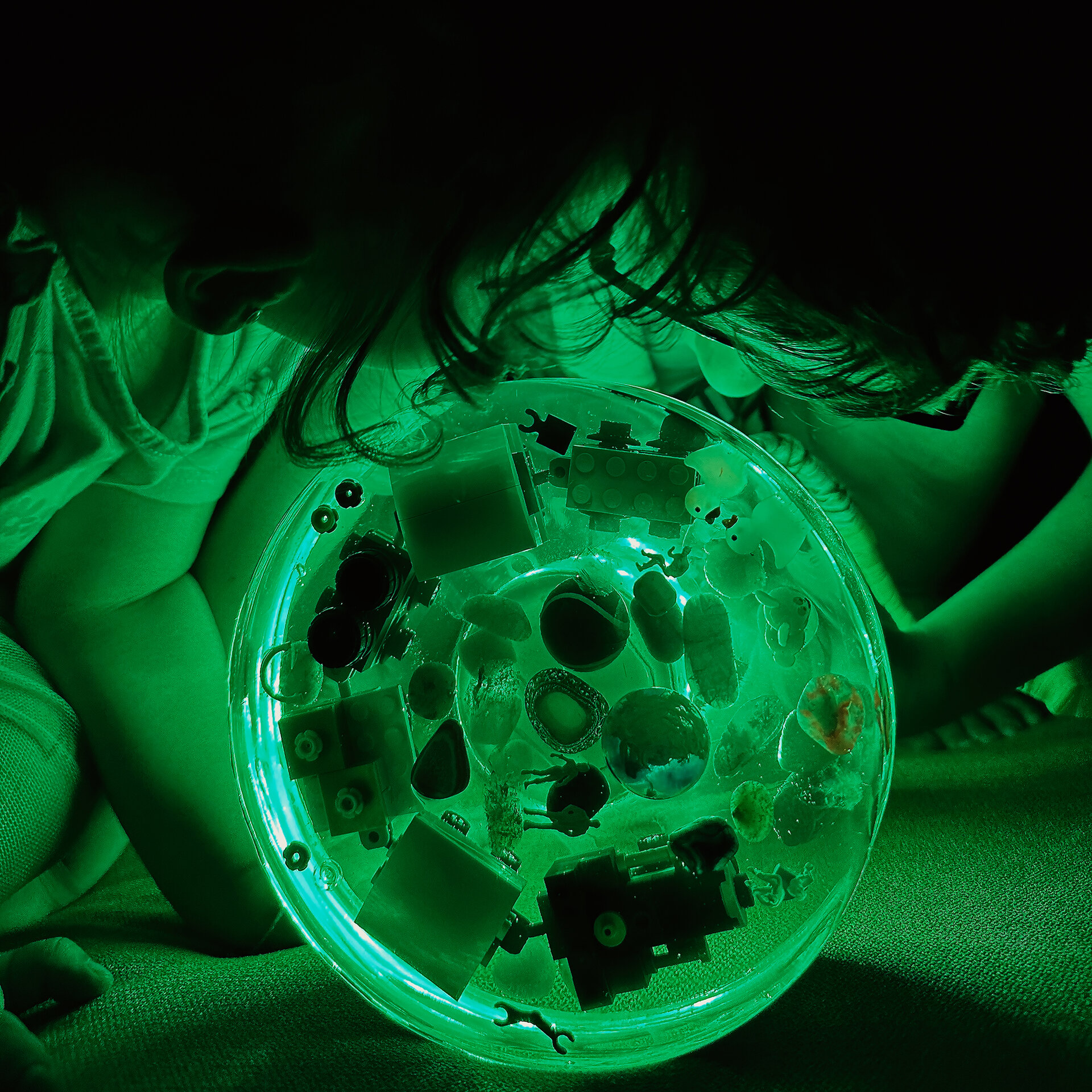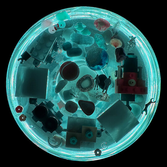 Fiecare obiect este turnat pe bucăți, în straturi, pentru a îngloba obiectele la diferite niveluri și a crea senzația de suspendare. În acest proces am construit matrițe din silicon pentru turnarea rășinii, fie din forme geometrice simple, fie utilizând sticle de plastic și straturi de bandă adezivă care pot fi îndepărtate ulterior. După uscarea completă, obiectele rămân transparente și dure, ca o lupă prin care poți privi o lume în interior, care uneori distorsionează și multiplică imaginea din interior.