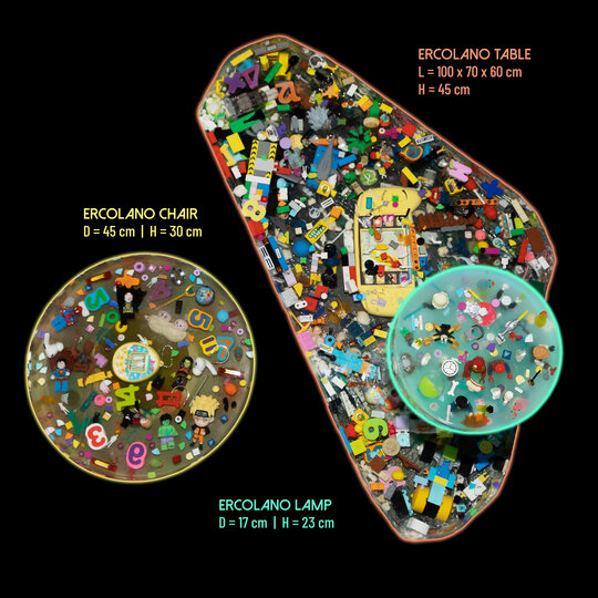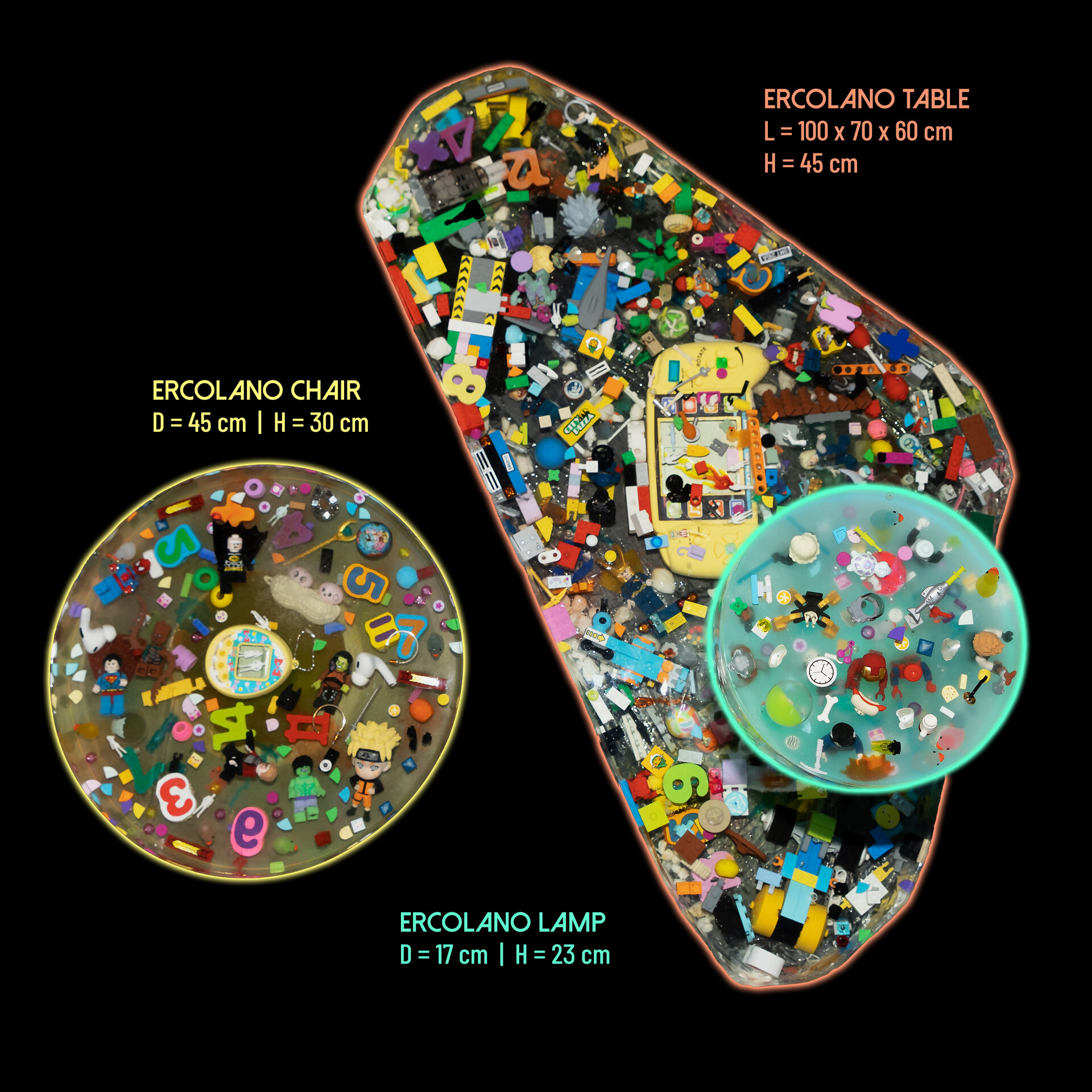 Parte din colecția “Ode to plastic”: Ercolano Table, Ercolano Lamp, Ercolano Chair.