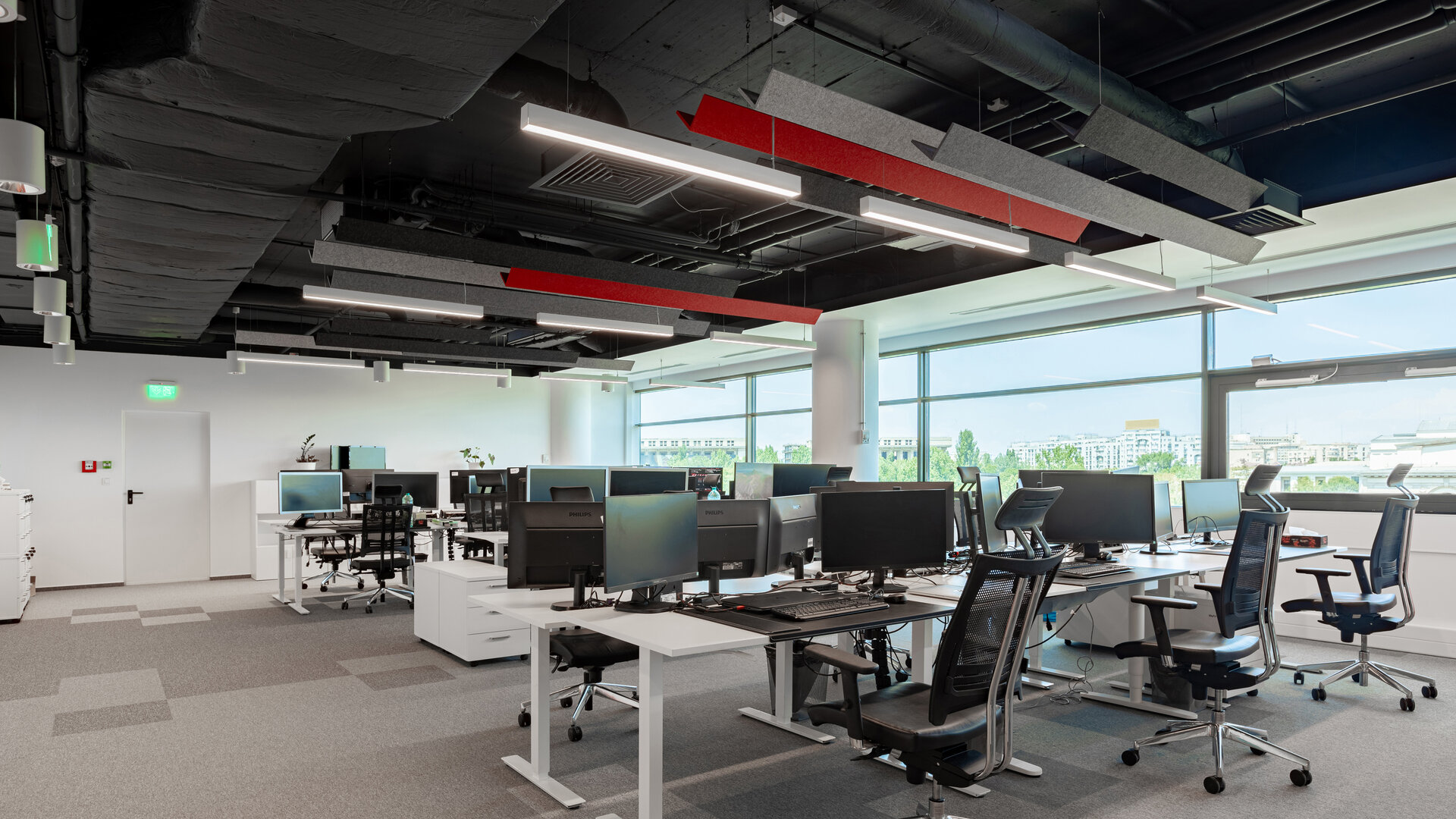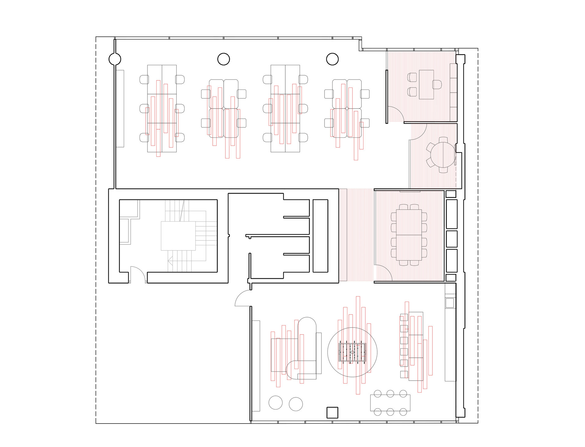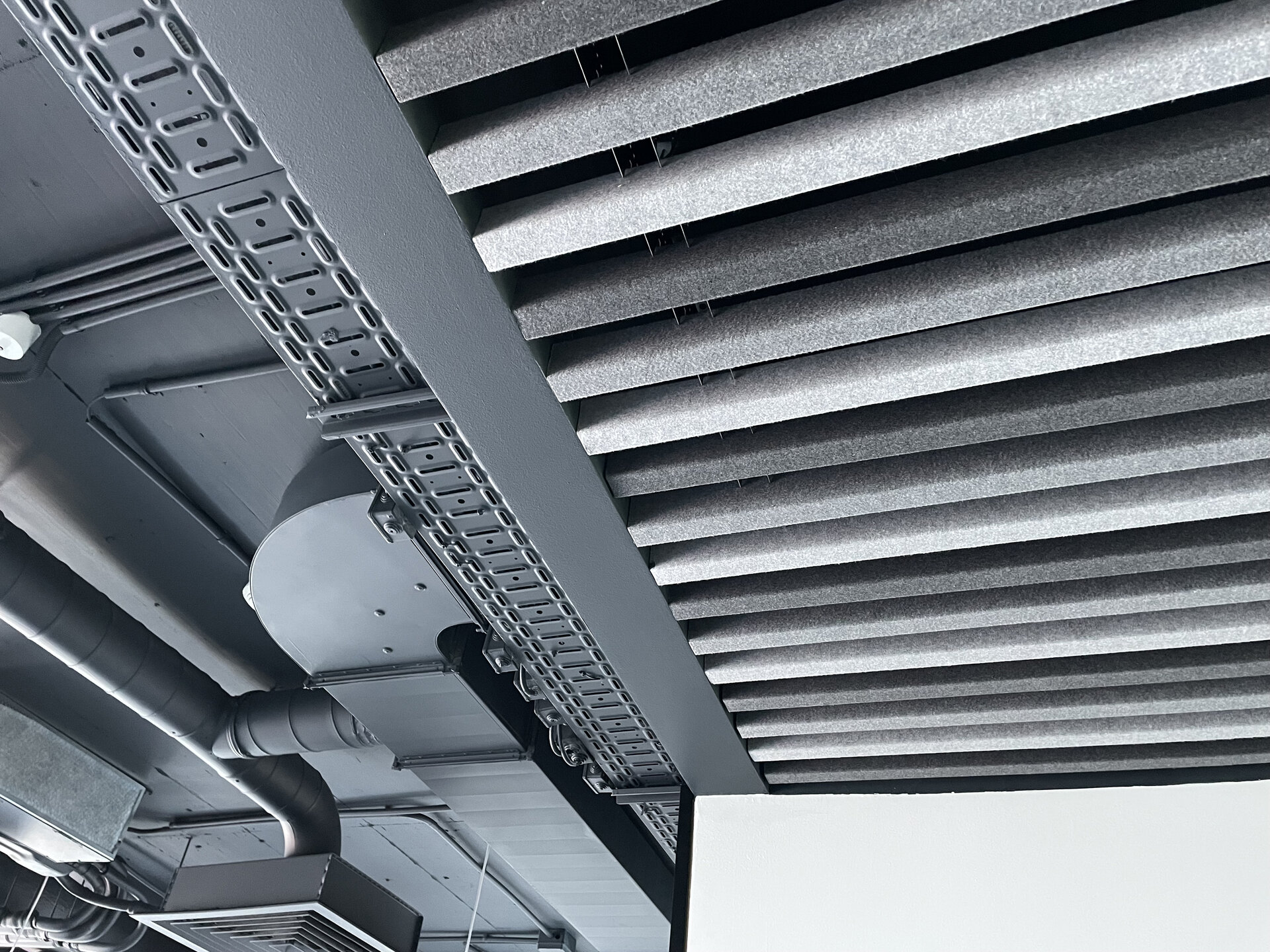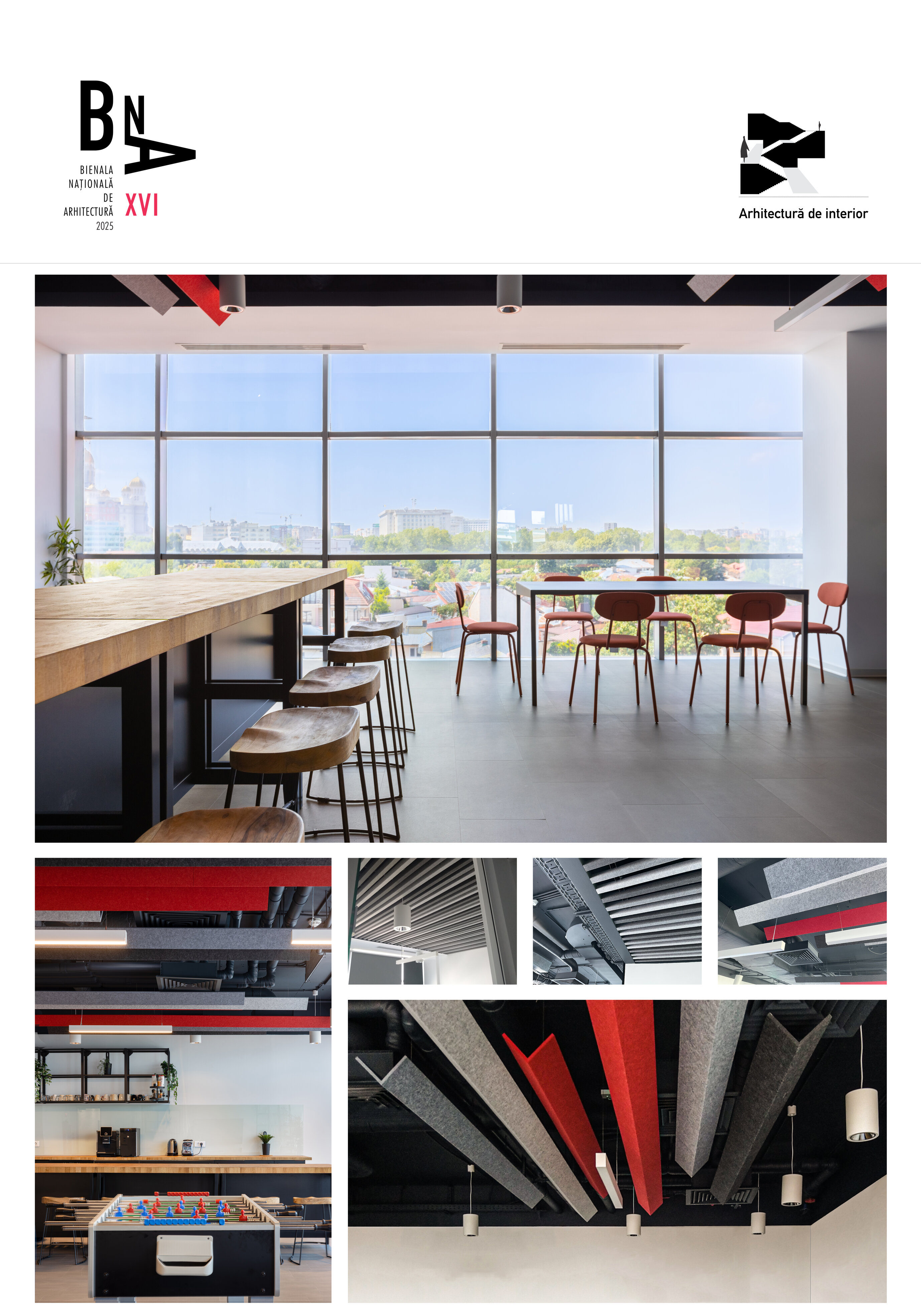 Amenajarea pornește de la infrastructura plafonului, dată de toate echipamentele și tubulaturile de instalații specifice unei clădiri de birouri. Deseori trecută cu vederea și ascunsă în spatele unui plafon obișnuit, această infrastructură, odată expusă, oferă o nouă profunzime spațiului. Într-un plan inferior, mai multe grupuri de lamele fonoizolante suspendate se proiectează pe acest fundal brut și devin accentele cromatice ale spațiului. Totodată, acestea ritmează dispunerea mobilierului, determinând și o identitate vizuală comună celor două zone ale amenajării.