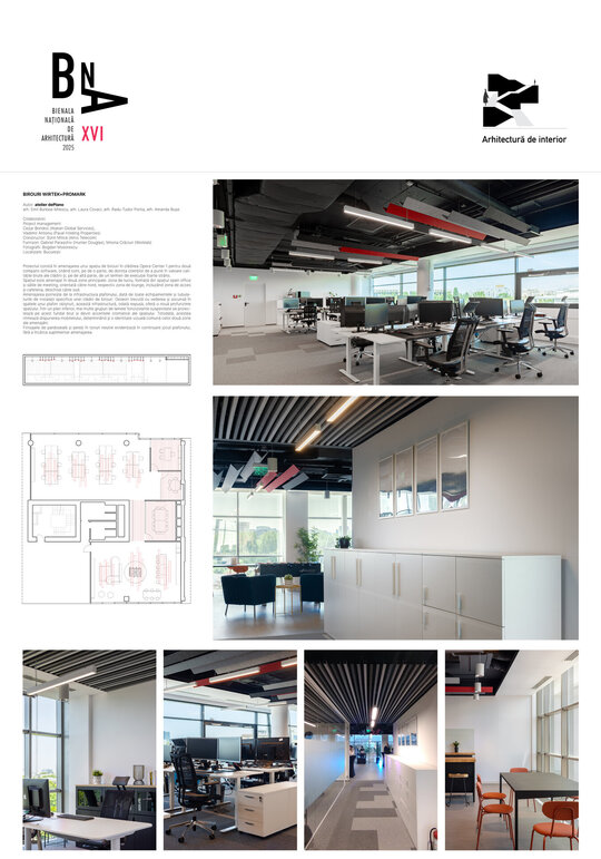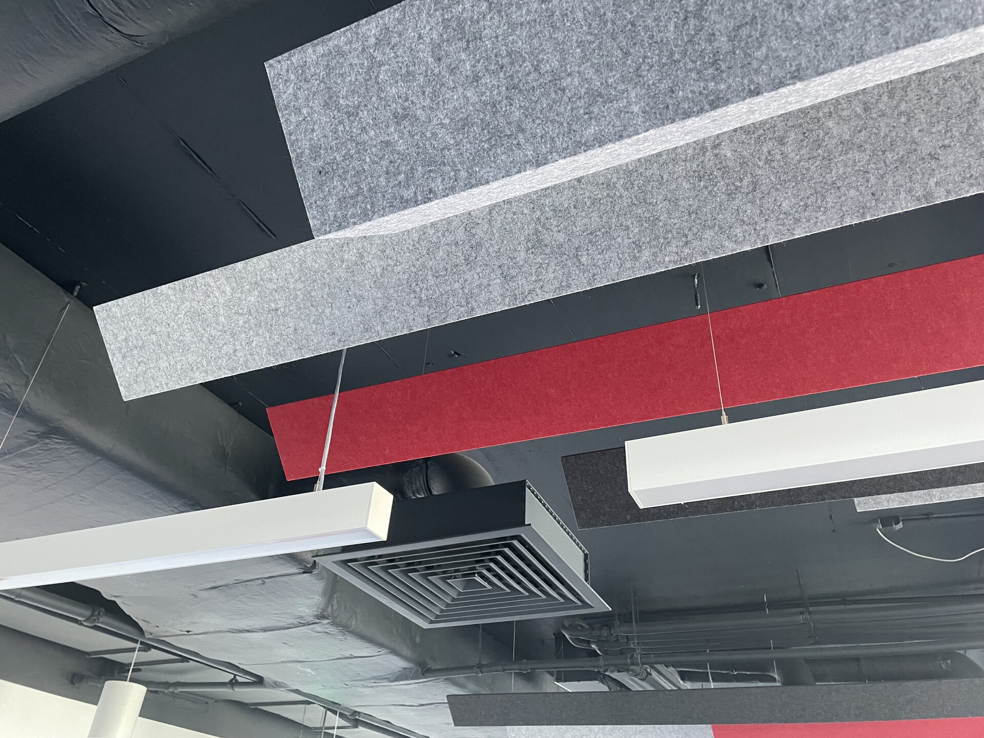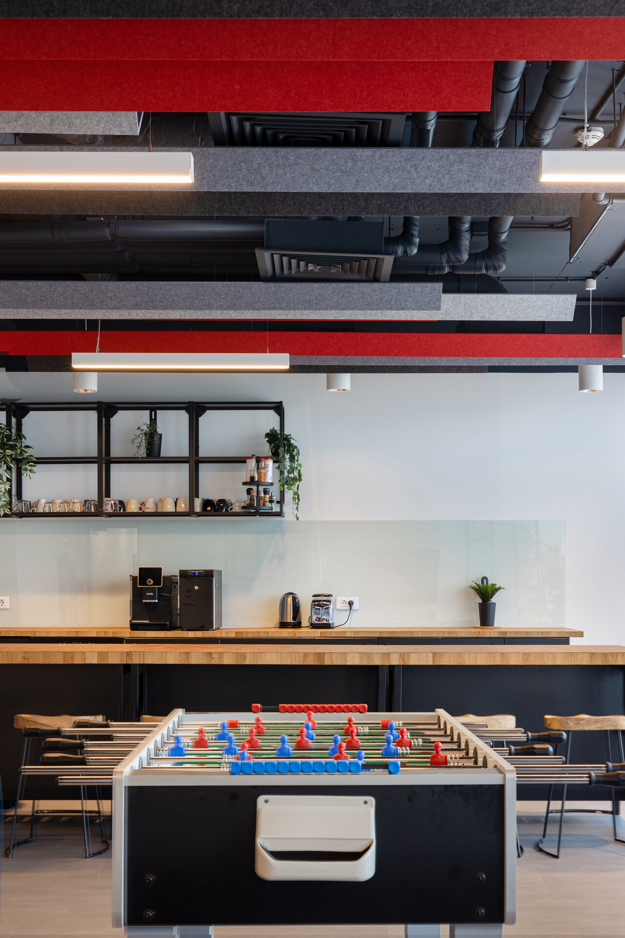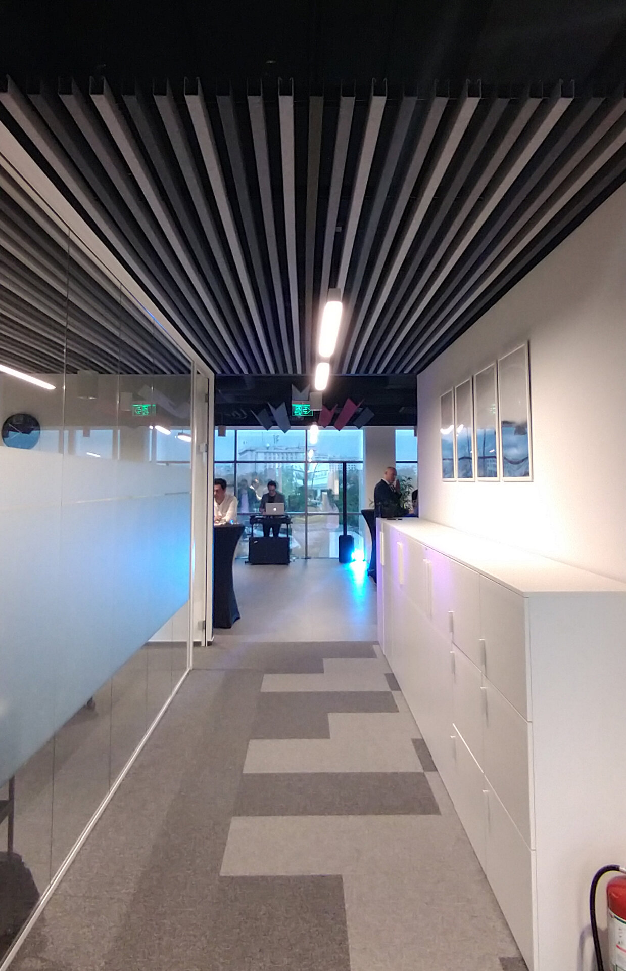 Amenajarea pornește de la infrastructura plafonului, dată de toate echipamentele și tubulaturile de instalații specifice unei clădiri de birouri. Deseori trecută cu vederea și ascunsă în spatele unui plafon obișnuit, această infrastructură, odată expusă, oferă o nouă profunzime spațiului. Într-un plan inferior, mai multe grupuri de lamele fonoizolante suspendate se proiectează pe acest fundal brut și devin accentele cromatice ale spațiului. Totodată, acestea ritmează dispunerea mobilierului, determinând și o identitate vizuală comună celor două zone ale amenajării.