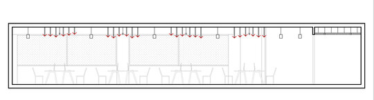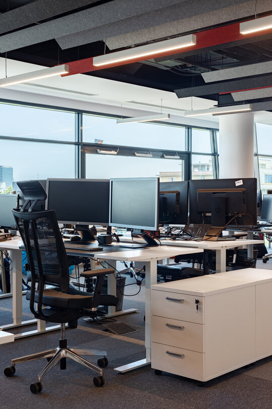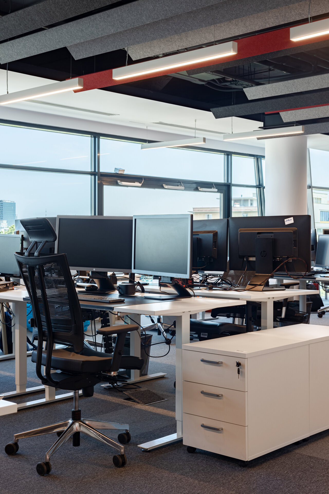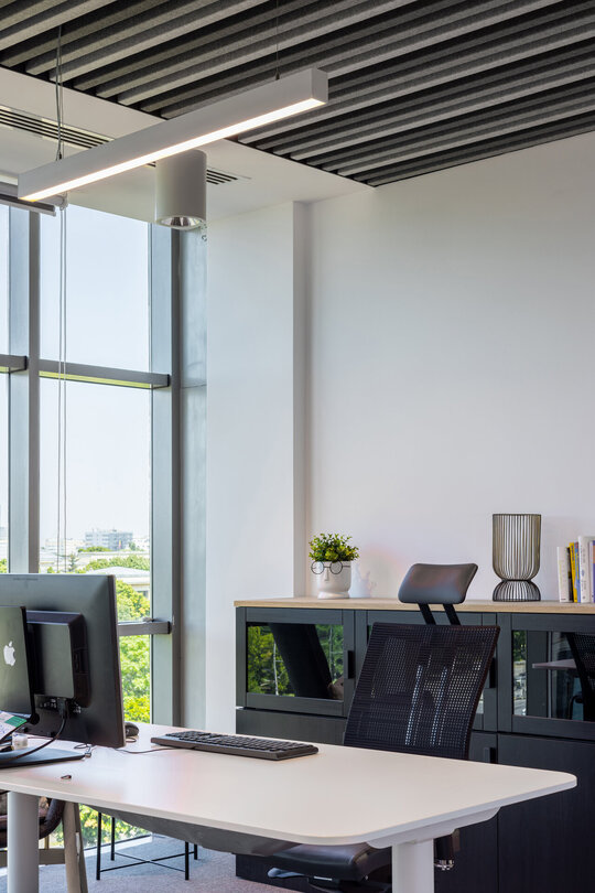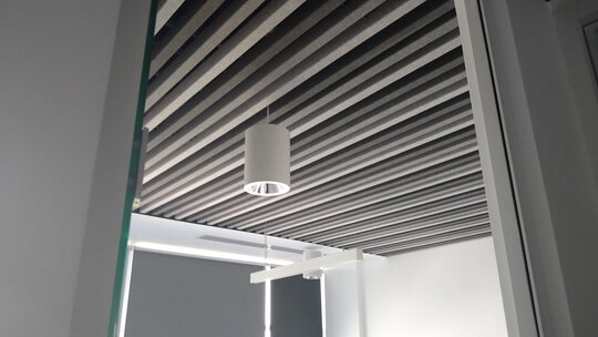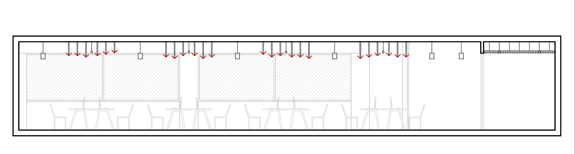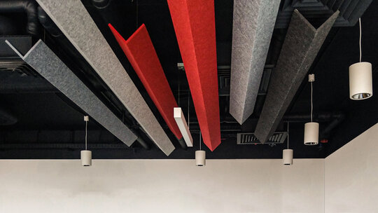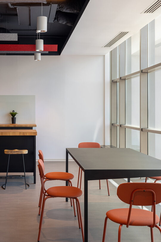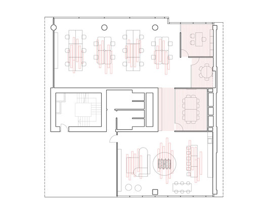 Amenajarea pornește de la infrastructura plafonului, dată de toate echipamentele și tubulaturile de instalații specifice unei clădiri de birouri. Deseori trecută cu vederea și ascunsă în spatele unui plafon obișnuit, această infrastructură, odată expusă, oferă o nouă profunzime spațiului. Într-un plan inferior, mai multe grupuri de lamele fonoizolante suspendate se proiectează pe acest fundal brut și devin accentele cromatice ale spațiului. Totodată, acestea ritmează dispunerea mobilierului, determinând și o identitate vizuală comună celor două zone ale amenajării.