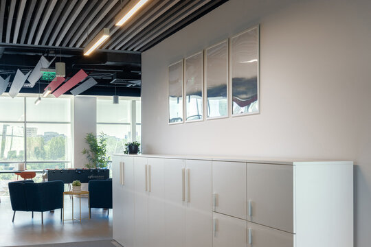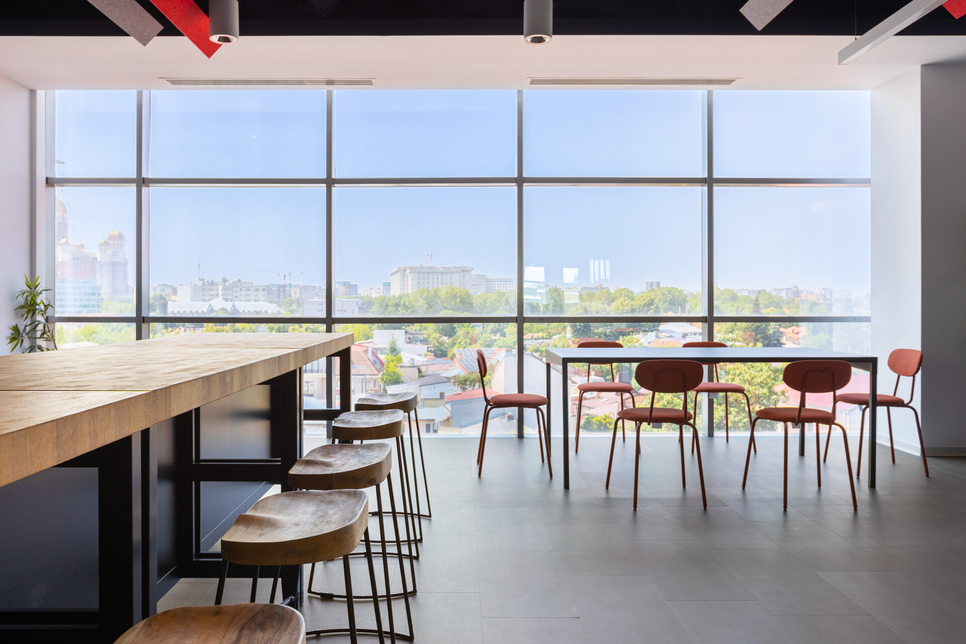 Spațiul este amenajat în două zone principale: zona de lucru, formată din spațiul open office și sălile de meeting, orientată către nord, respectiv zona de lounge, incluzând zona de acces și cafeteria, deschisă către sud.