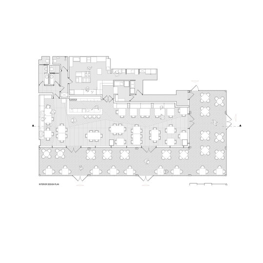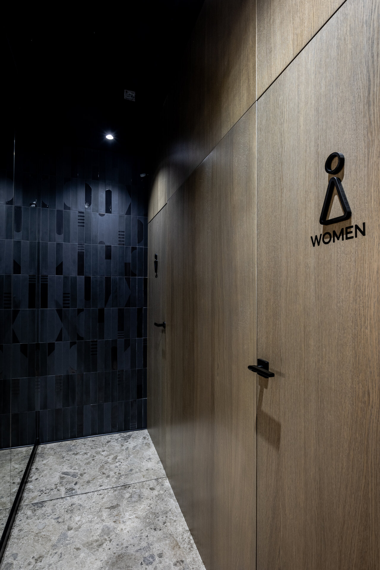Corpurile de iluminat suspendate, cu forme florale sculpturale, introduc un moment poetic într-un amenajare, devenind contrapuncte afective ale rigurozității. Proiectat pentru a camufla instalațiile, plafonul fals cu rigle metalice vopsite negru servește și ca platformă funcțională pentru integrarea unui sistem de iluminat inteligent, capabil să controleze ritmul și intensitatea luminii pentru a crea o ambianță variabilă.