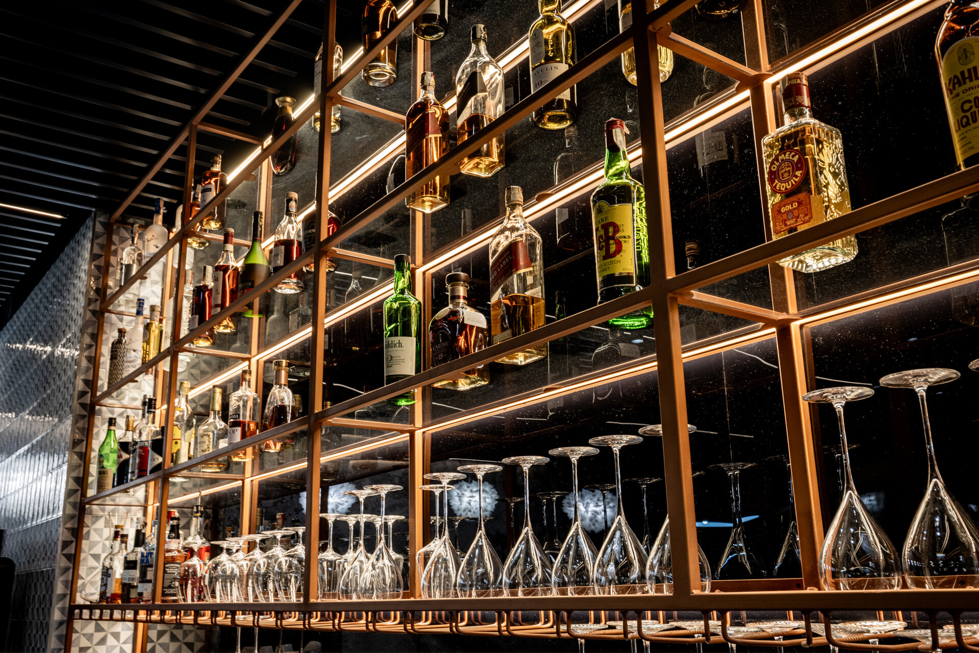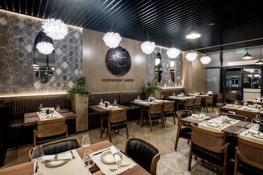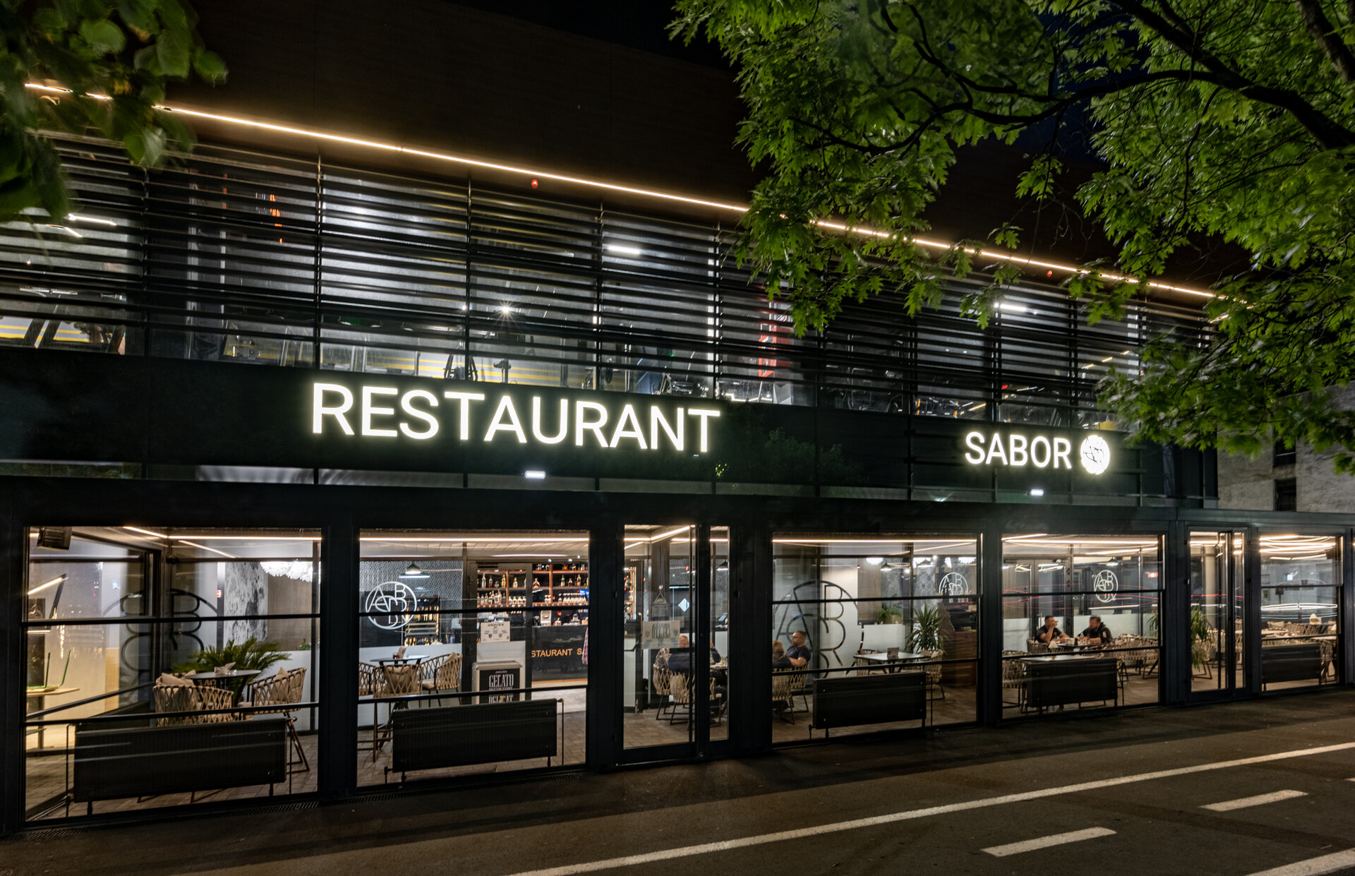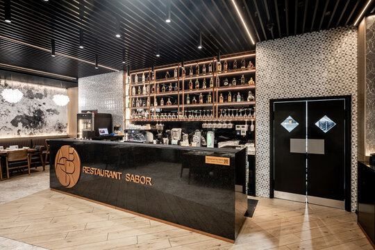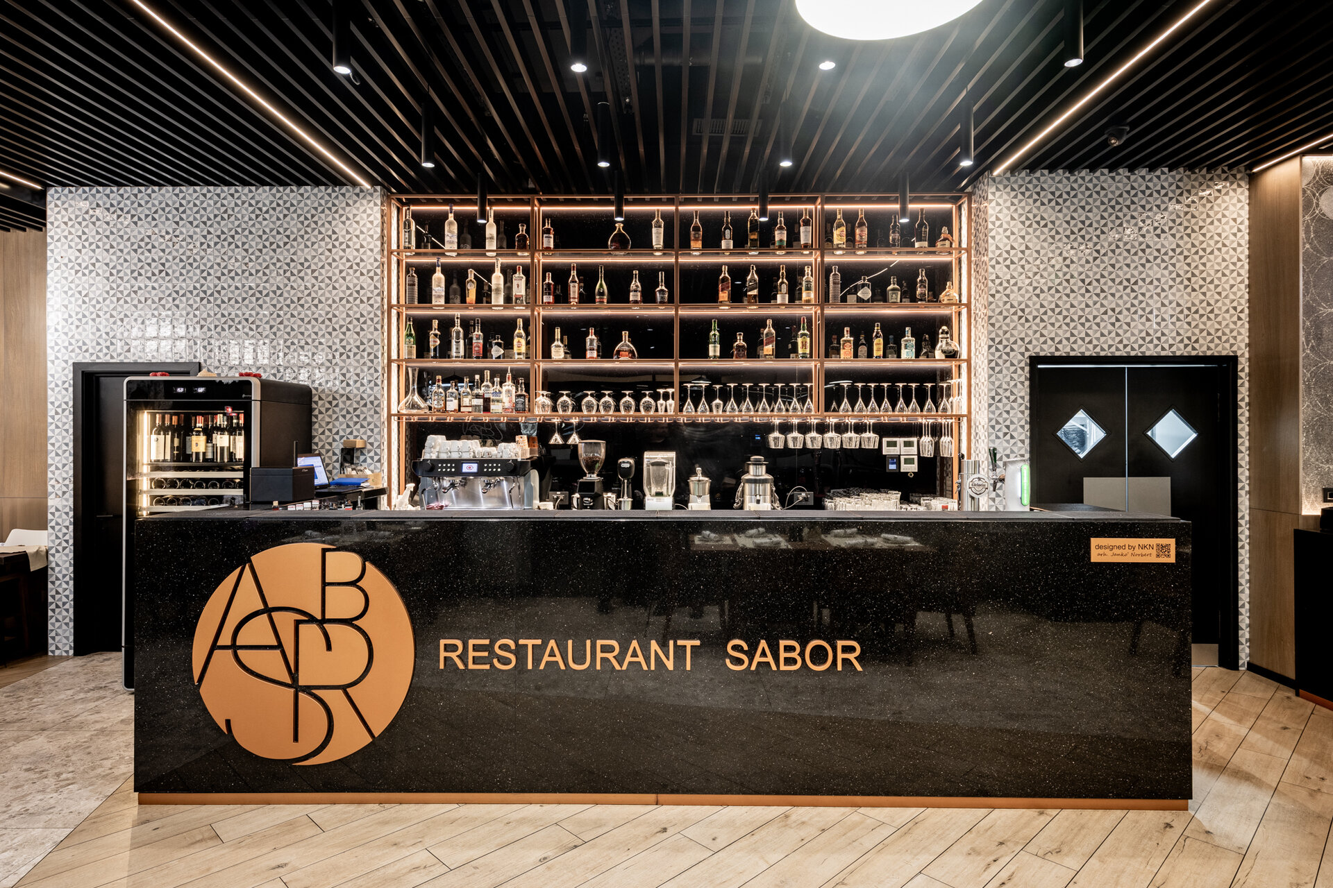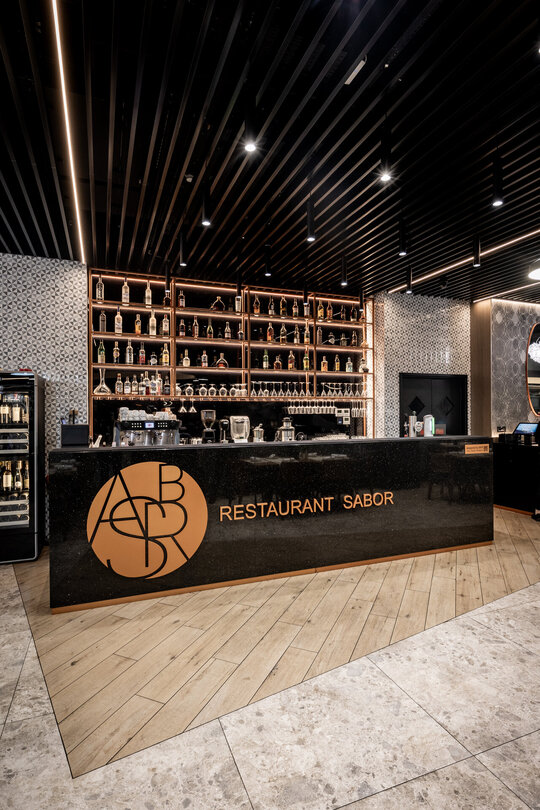 În centrul amenajării, barul este inima spațiului și semnătura sa identitară. Construit integral din quartz, obiectul are un caracter sculptural, funcțional și vizual, ce articulează spațiul și oferă un punct de reper clar în experiența utilizatorului. Identitatea vizuală a fost construită în jurul cuvântului spaniol „Sabor”, care înseamnă „gust”, „aromă”, „savoare”, iar monograma sa supradimensionată a fost integrată pe frontul barului, devenind un element central al designului.