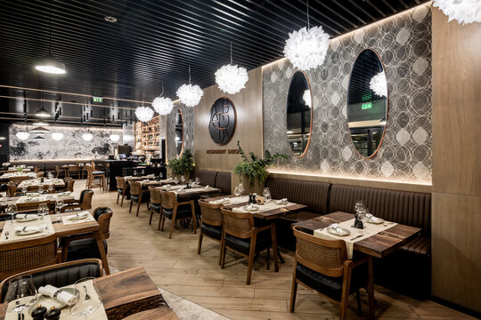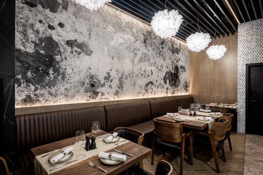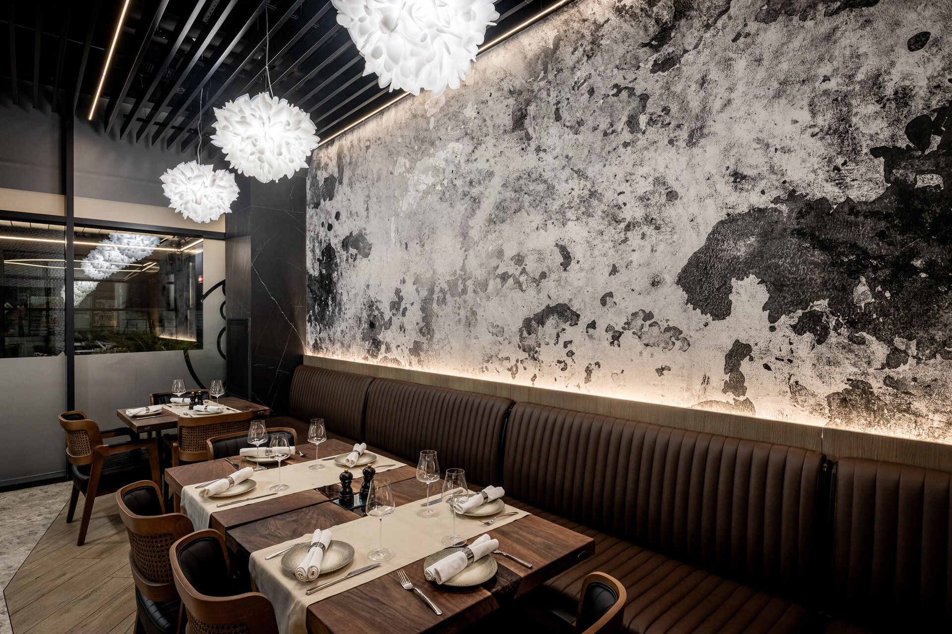 Amenajarea este concepută ca o poveste în straturi vizuale și tactile: pereții laterali sunt placați cu lemn texturat și tapet, într-un joc ritmat care adaugă profunzime și calm. Banchetele tapițate sunt create pentru a oferi un plus de confort, iar jardinierele creează micro-teritorii intime de-a lungul lor.