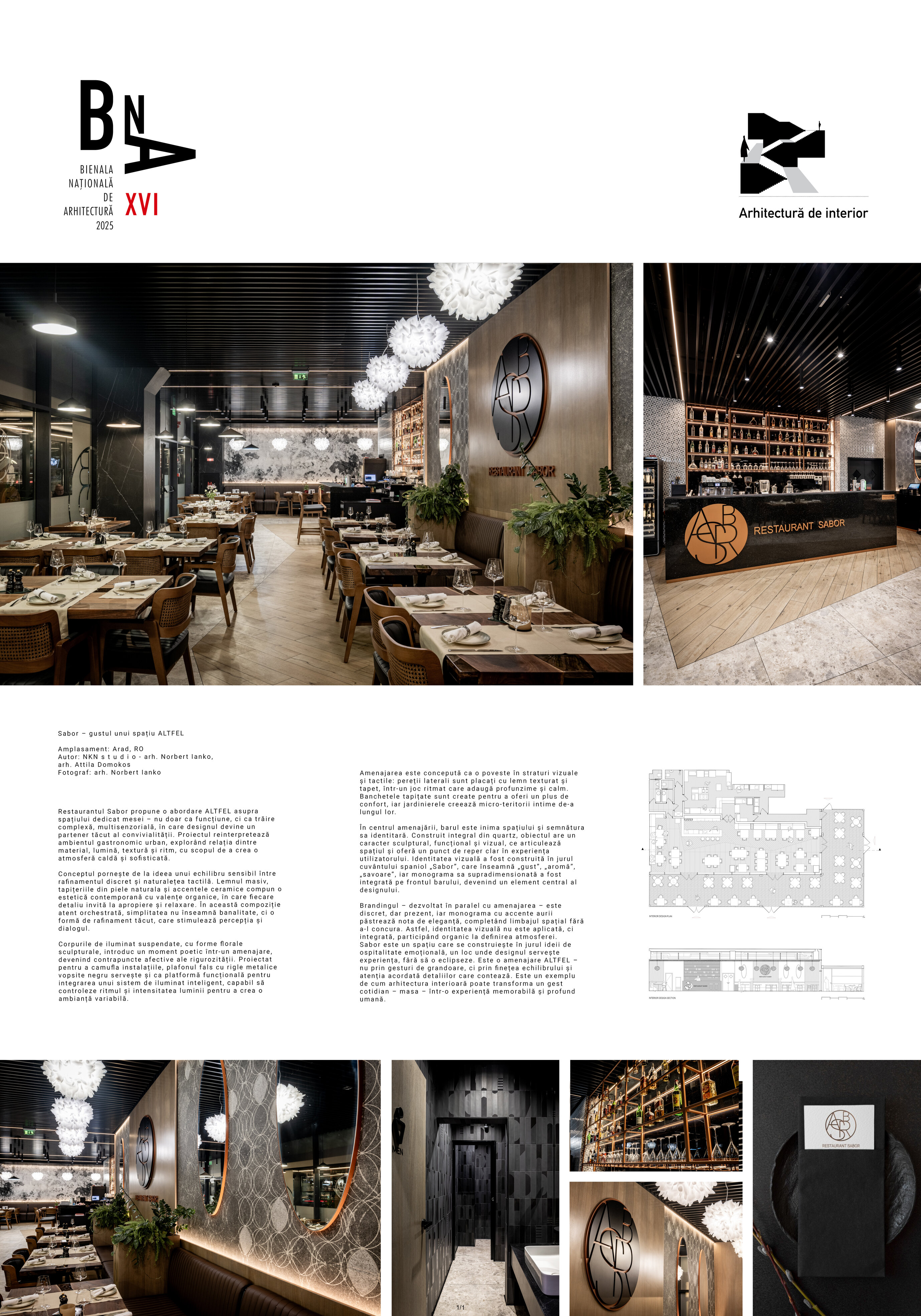 Restaurantul Sabor propune o abordare ALTFEL asupra spațiului dedicat mesei – nu doar ca funcțiune, ci ca trăire complexă, multisenzorială, în care designul devine un partener tăcut al convivialității. Proiectul reinterpretează ambientul gastronomic urban, explorând relația dintre material, lumină, textură și ritm, cu scopul de a crea o atmosferă caldă și sofisticată.