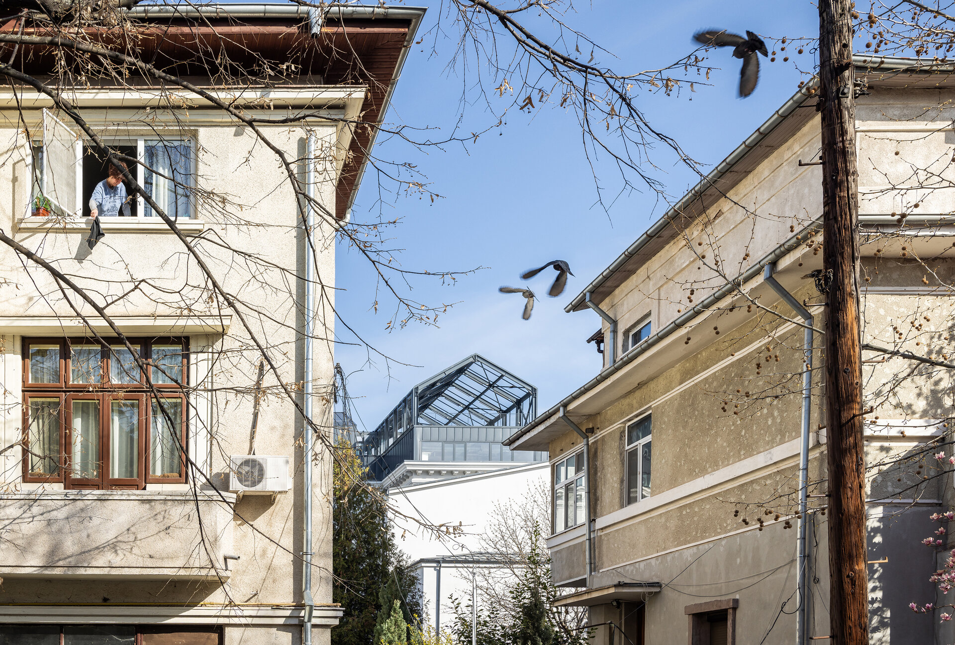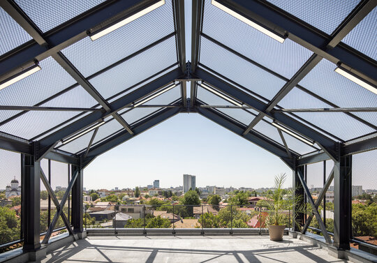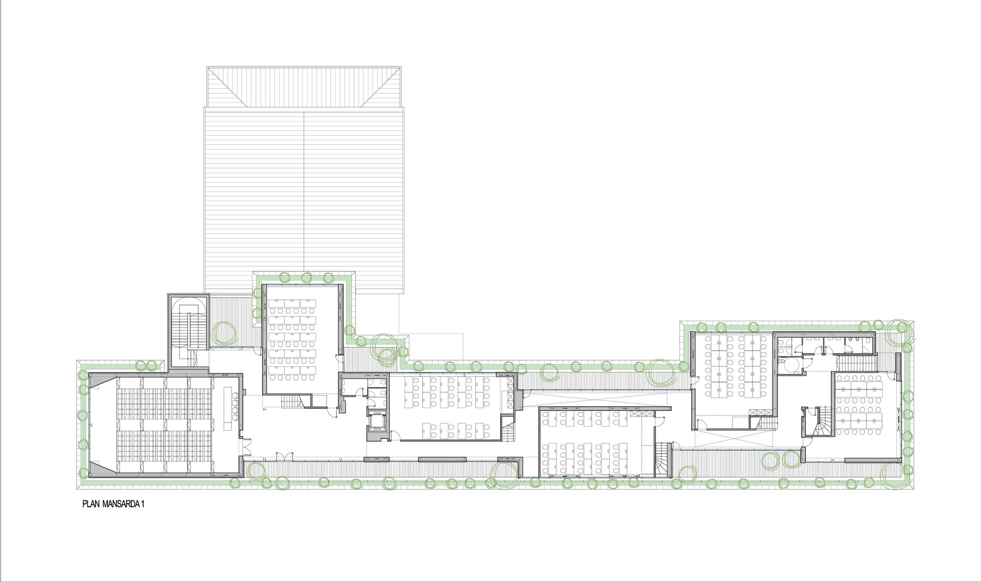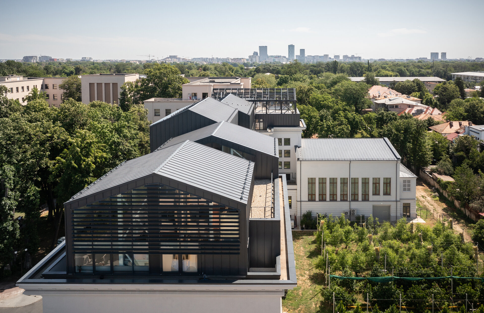 La interior, continuitatea spațială respectă reglementările ISU, adaptate configurației existente, fără a compromite parcursul coerent și plăcut între zonele de studiu, cercetare și socializare. La nivelul mansardei, o circulație fluidă, flancată de terase exterioare pe toate laturile, conectează amfiteatrul, atelierele, dar și nivelurile superioare ale volumelor mansardei, dintre care cel mai marcant fiind terasa-grădină. Aceasta, împreună cu cornișa clădirii, devenită o jardinieră perimetrală, vor acomoda plantațiile experimentale ale studenților, astfel arhitectura devenind parte integrantă din procesul educational. Volumul acoperit cu tablă expandată pe structură metalică, pe care vor crește plante agățătoare, ocupă un rol central la nivel arhitectural, marcând și accentuând intrarea principală a clădirii.