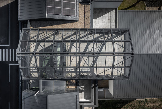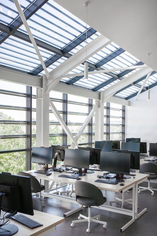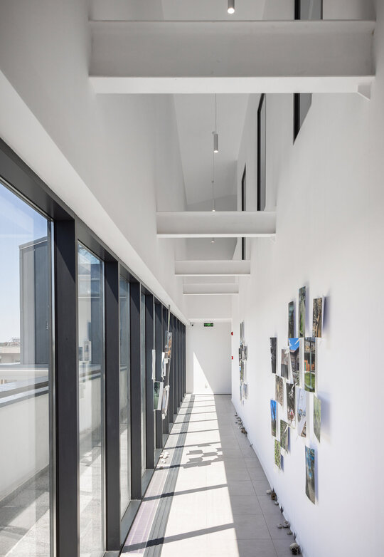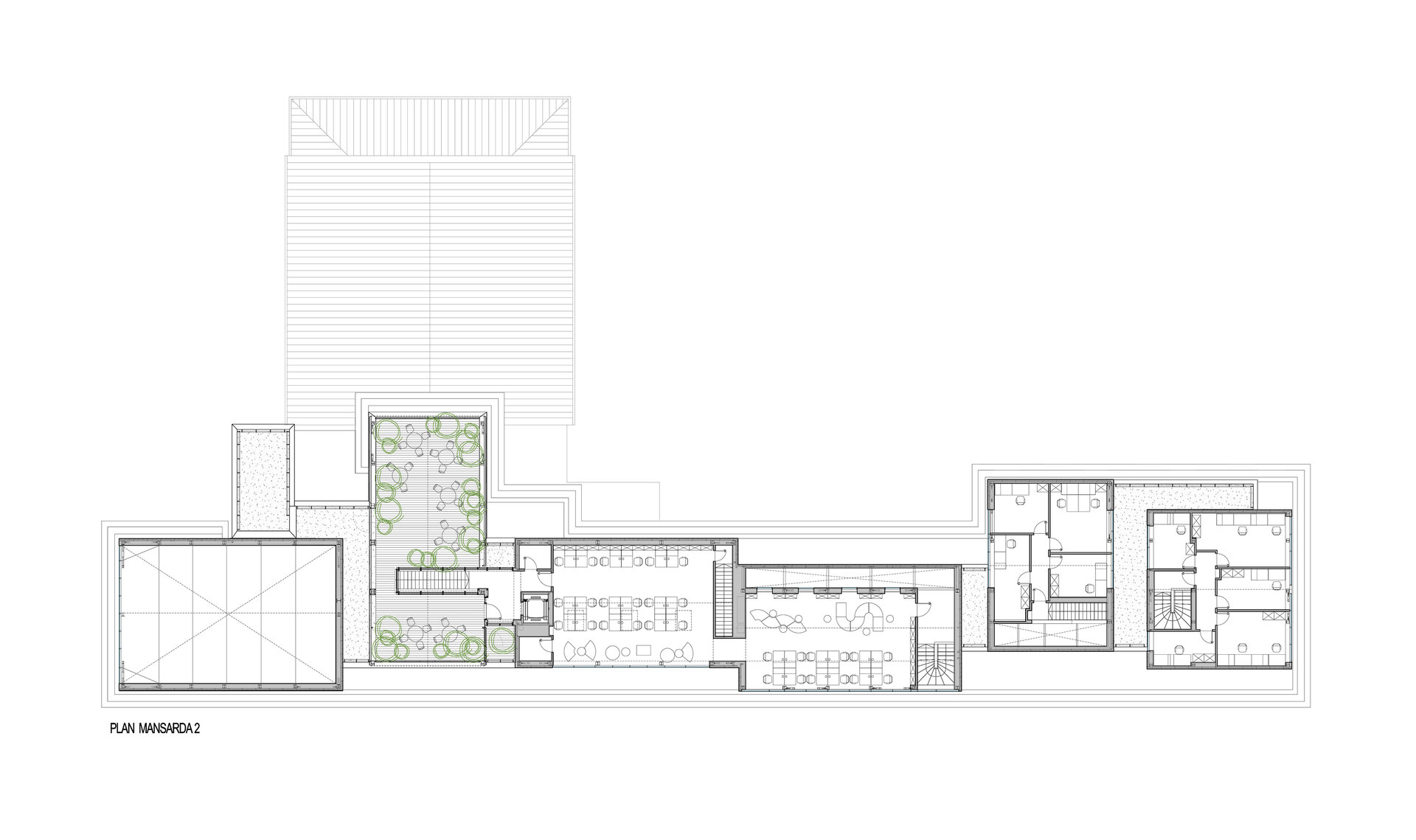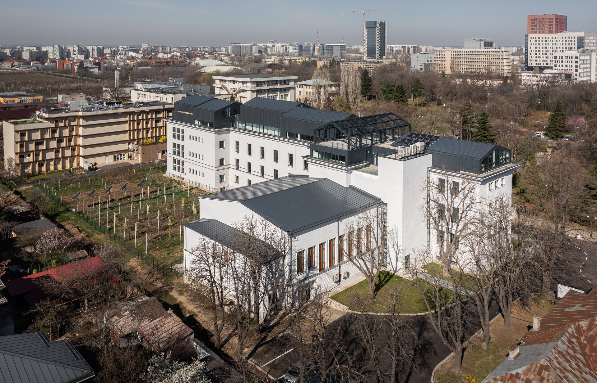 La interior, continuitatea spațială respectă reglementările ISU, adaptate configurației existente, fără a compromite parcursul coerent și plăcut între zonele de studiu, cercetare și socializare. La nivelul mansardei, o circulație fluidă, flancată de terase exterioare pe toate laturile, conectează amfiteatrul, atelierele, dar și nivelurile superioare ale volumelor mansardei, dintre care cel mai marcant fiind terasa-grădină. Aceasta, împreună cu cornișa clădirii, devenită o jardinieră perimetrală, vor acomoda plantațiile experimentale ale studenților, astfel arhitectura devenind parte integrantă din procesul educational. Volumul acoperit cu tablă expandată pe structură metalică, pe care vor crește plante agățătoare, ocupă un rol central la nivel arhitectural, marcând și accentuând intrarea principală a clădirii.