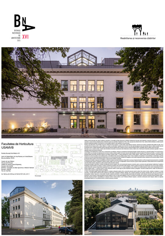Clădirea supusă intervenției este sediul Facultății de Horticultură a Universității de Științe Agronomice și Medicină Veterinară din București, parte integrantă a campusului „Agronomie” – un ansamblu universitar cu valoare istorică și identitară pentru învățământul superior de specialitate. Realizată între 1952 și 1954, după planurile arhitectei Ianola Trișcu, clădirea reflectă sobrietatea și echilibrul specific arhitecturii instituționale postbelice. Deși situată într-o zonă protejată, clădirea nu este clasificată ca monument istoric.