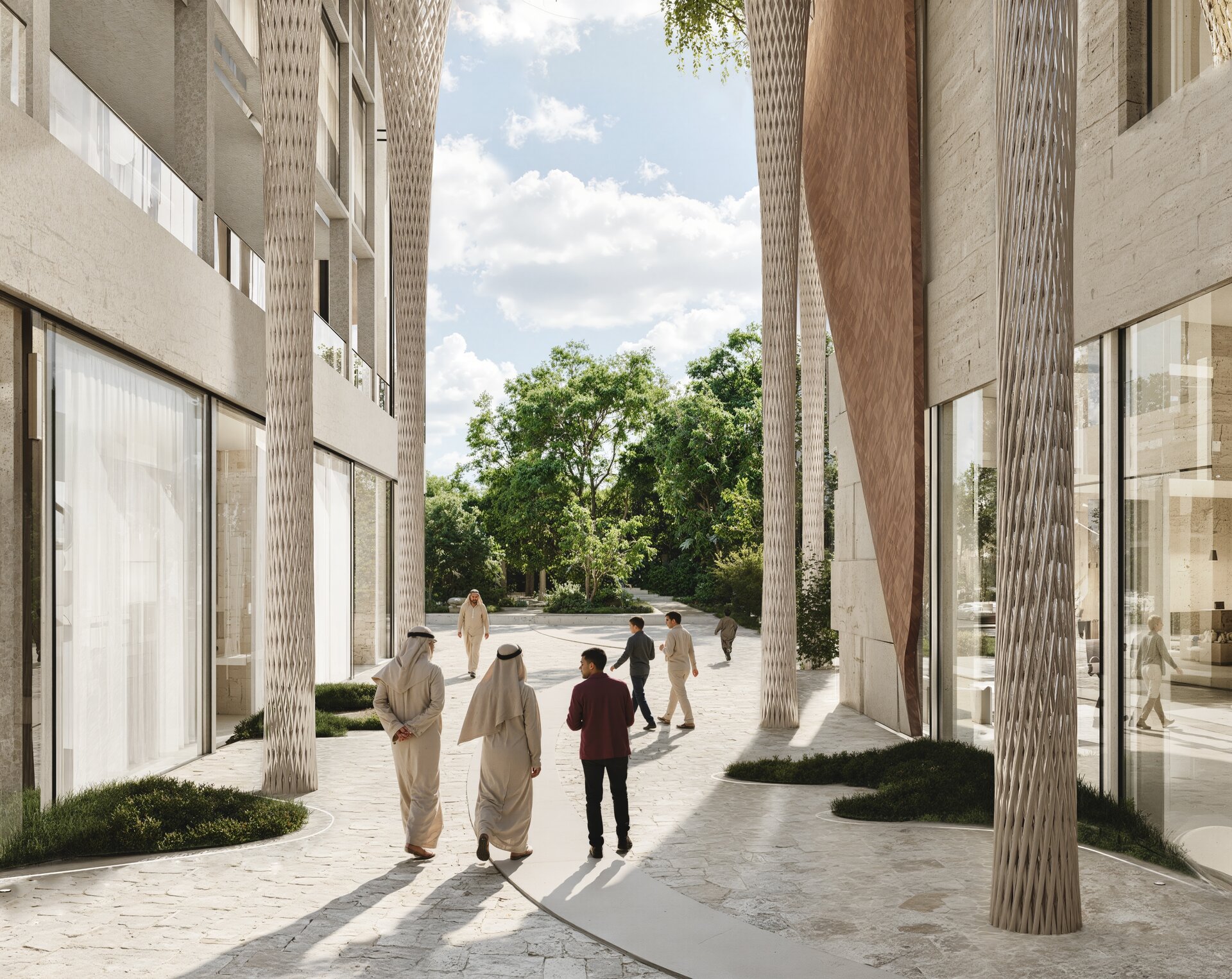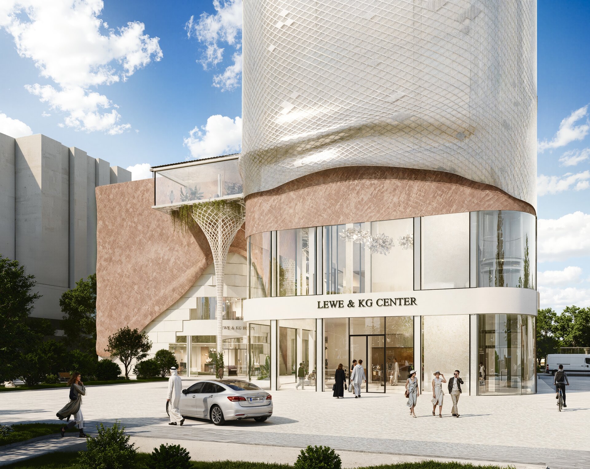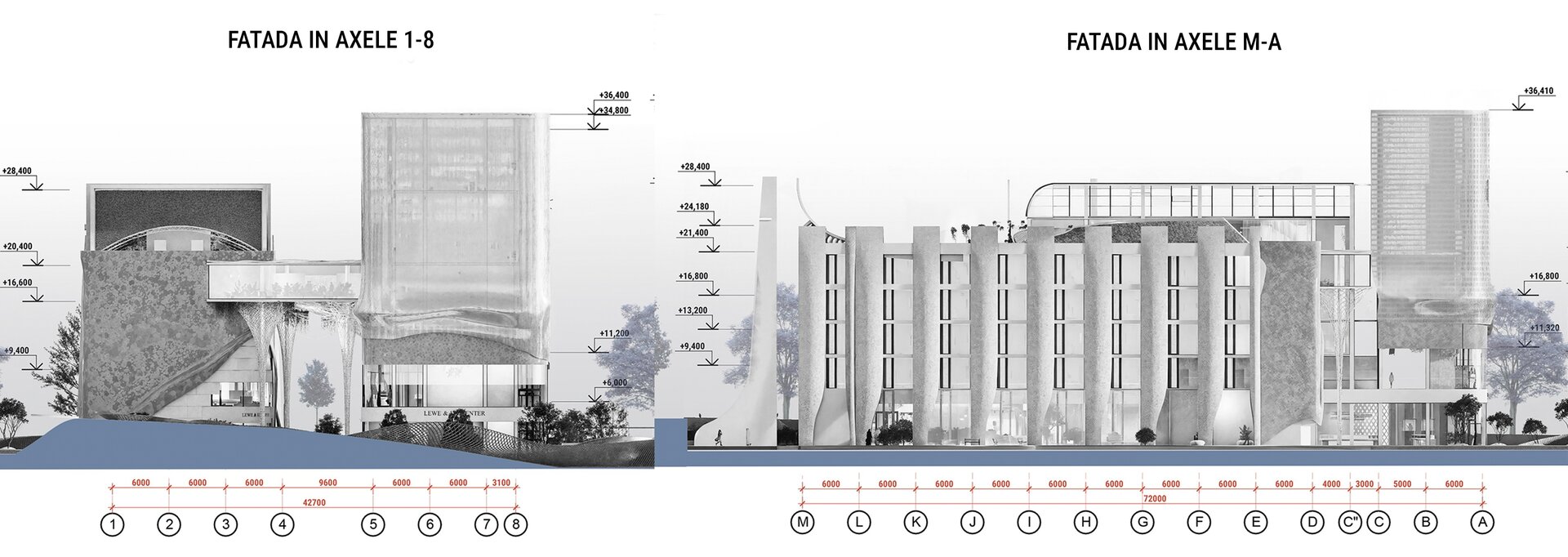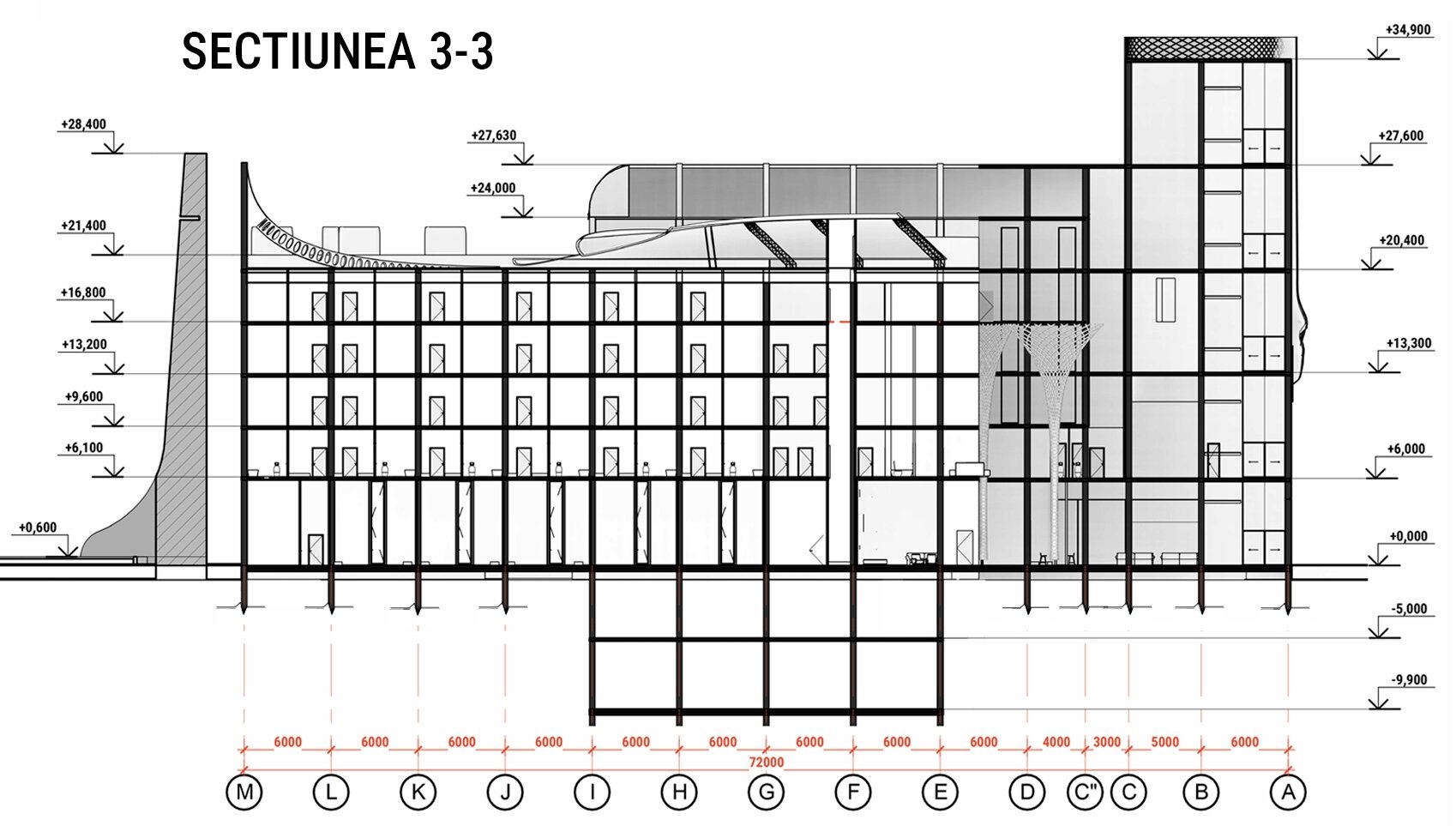 Un aspect esențial al proiectului este integrarea armonioasă a zonelor verzi. Terasele plantate, grădinile suspendate și spațiile de promenadă sunt gândite ca un sistem ecologic integrat, menit să reducă efectul de insulă termică urbană și să ofere un microclimat sănătos. Vegetația are rol estetic, dar și funcțional – filtrează aerul, asigură umbrire și creează un contrast natural cu texturile brute ale clădirii.