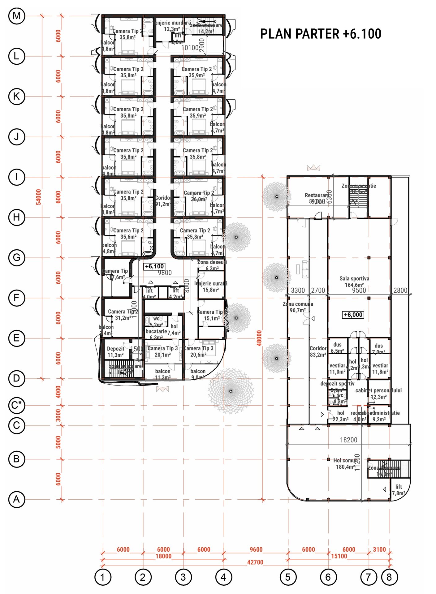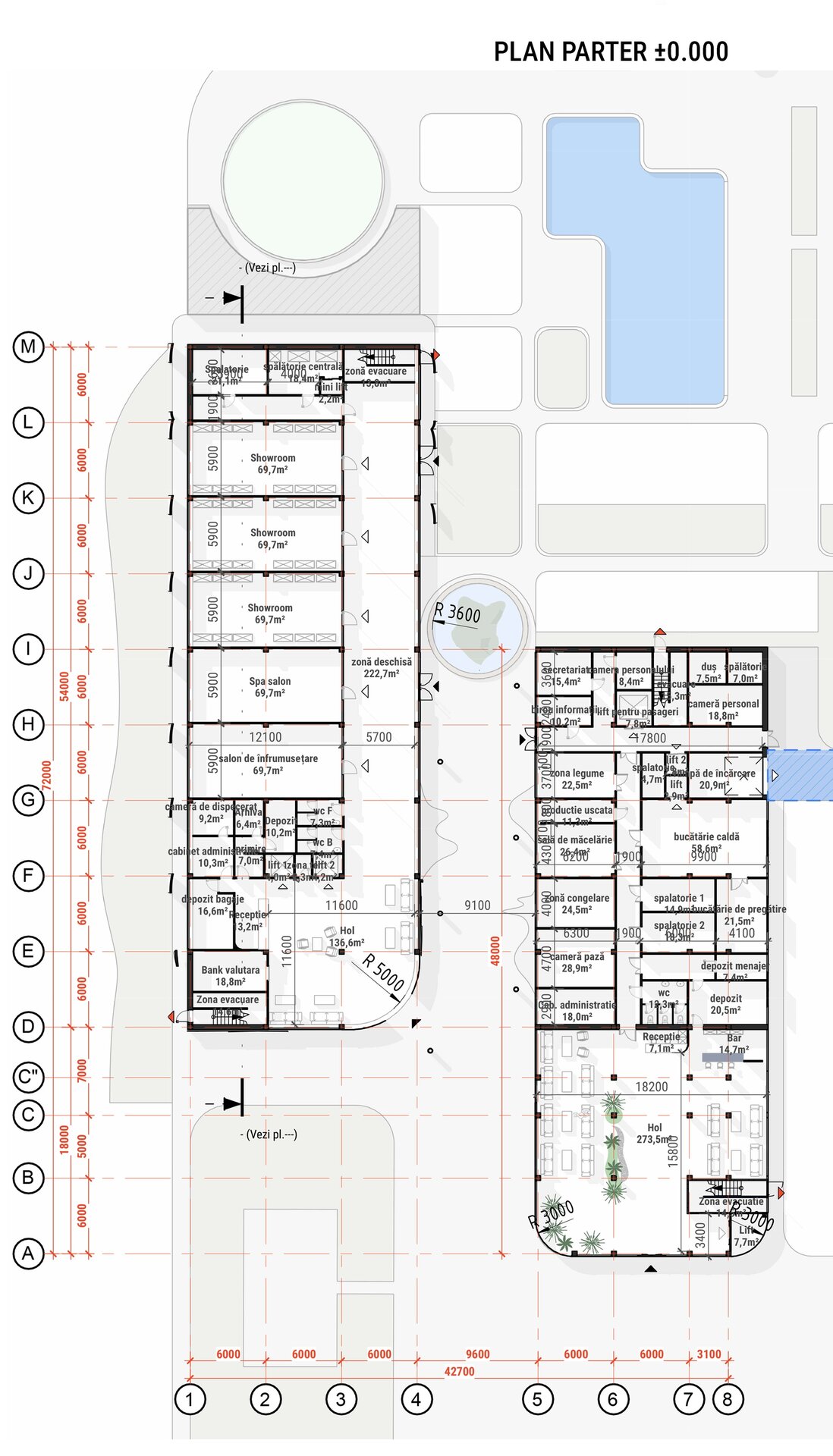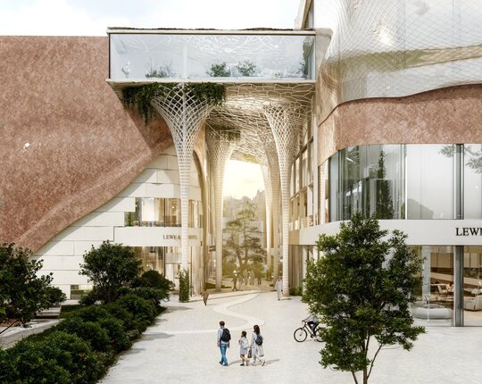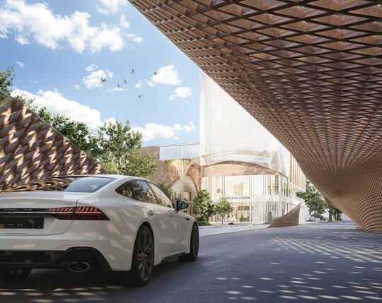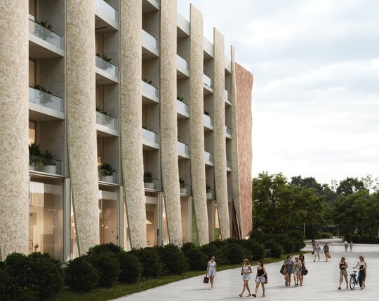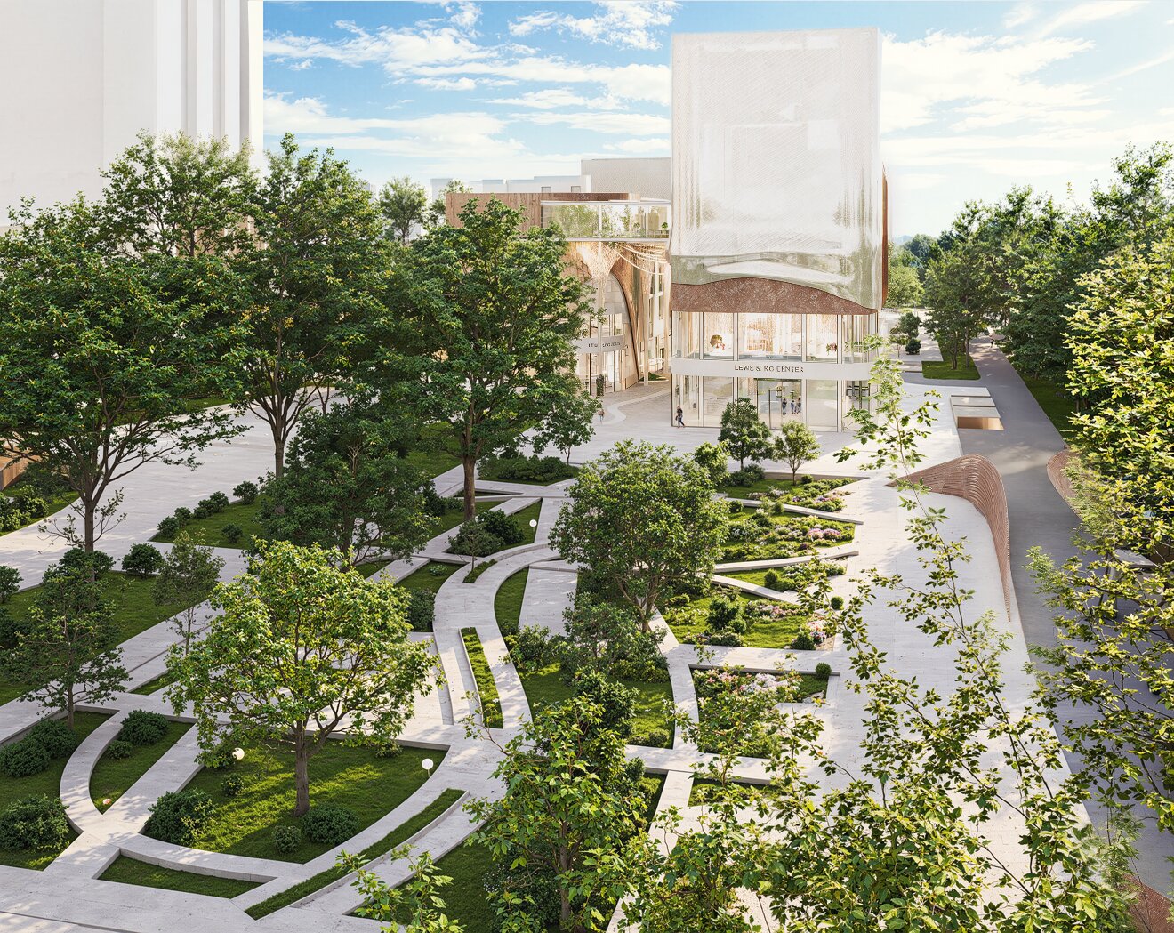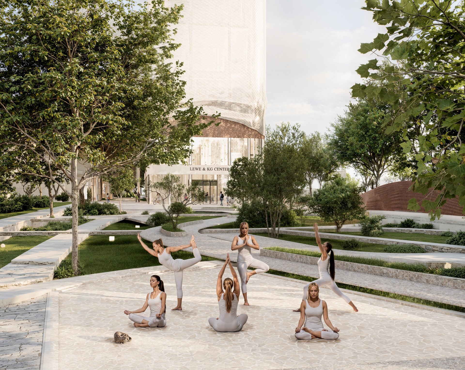 Un aspect esențial al proiectului este integrarea armonioasă a zonelor verzi. Terasele plantate, grădinile suspendate și spațiile de promenadă sunt gândite ca un sistem ecologic integrat, menit să reducă efectul de insulă termică urbană și să ofere un microclimat sănătos. Vegetația are rol estetic, dar și funcțional – filtrează aerul, asigură umbrire și creează un contrast natural cu texturile brute ale clădirii.