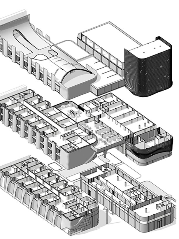 Volumetria proiectului îmbină elemente de clasicism, brutalism și forme bionice, creând o arhitectură care transmite simultan forță și armonie. Fațadele masive, realizate din suprafețe texturate și materiale naturale, evocă stabilitate și siguranță, în timp ce inserțiile bionice, fluide și organice, dau dinamism și vitalitate ansamblului. Brutalismul este reprezentat prin proporții masive și texturi brute, apropiate construcțiilor de piatră, iar aspectele bionice fac trimitere la formele vii ale naturii, inspirate din cultura Oceanului Pacific.