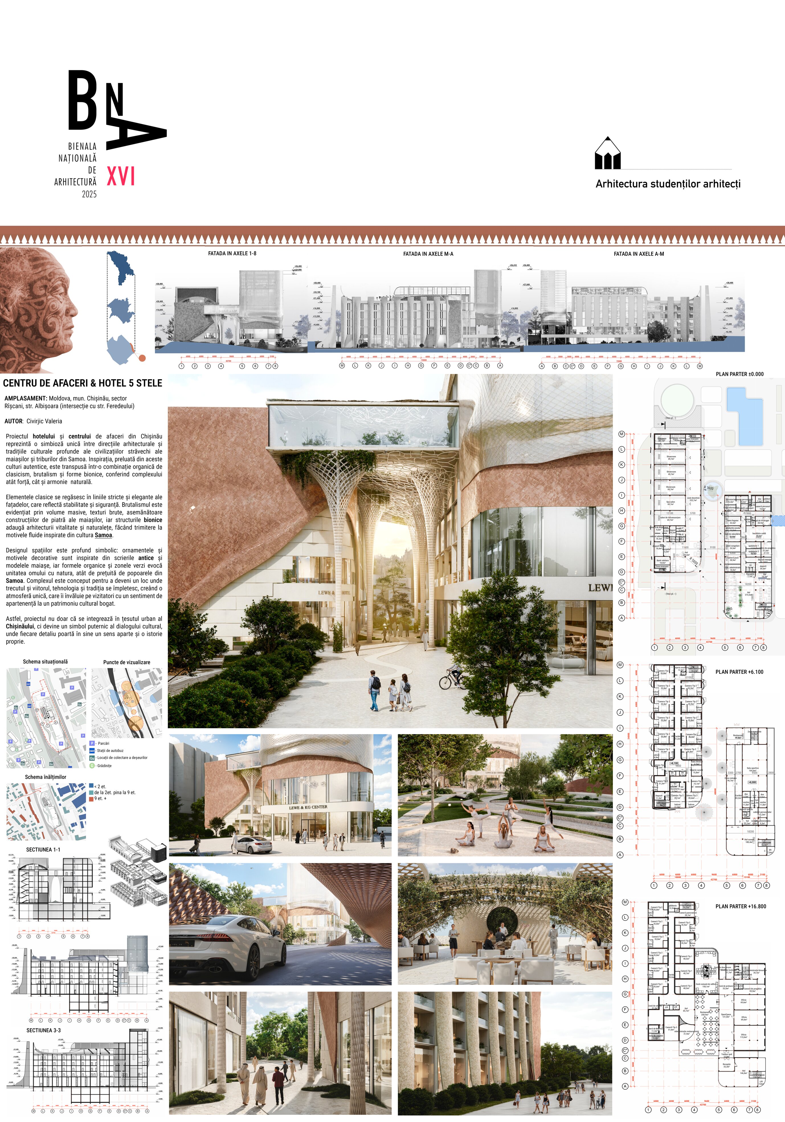 Proiectul hotelului și al centrului de afaceri din Chișinău propune o viziune arhitecturală care depășește limitele unei construcții funcționale și se transformă într-un reper cultural și urbanistic. Complexul este gândit ca o simbioză între direcții arhitecturale contemporane și tradițiile culturale profunde ale civilizațiilor străvechi, în special ale maiașilor și triburilor din Samoa. Această sursă de inspirație oferă un fundament identitar puternic, care se reflectă în materialitate, formă și expresivitate.
