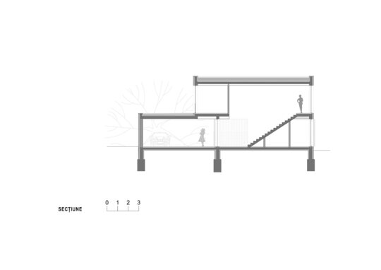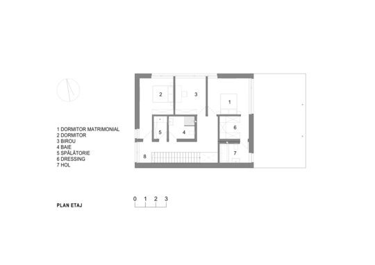 Construcția se desfășoară pe parter și etaj, deservind drept locuință unifamiliala. Accesul se realizează printr-o terasă acoperită, excavată în volum. Holul de acces în locuință face distribuția în spațiile principale de la parter și spre nivelul superior prin intermediul scării. La intrare, vizitatorul este întâmpinat de o compartimentare atent gândită, care pune accent pe conexiunea dintre spațiile de locuit și curtea din spate. Parterul este proiectat asemenea unui plan liber. Compartimentarea locuinței a fost gândită pentru a sprijini obiceiurile de zi cu zi ale familiei, iar fluxul de mișcare între camere este optimizat pentru a permite o utilizare flexibilă a fiecărei zone. Inima casei este bucătăria, care funcționează ca un nucleu central, legând strategic livingul de zona de luat masa. Acest design, nu doar că amplifică senzația de spațiu liber, dar încurajează și o tranziție fluidă între diferitele zone funcționale, stimulând interacțiunea și conexiunea dintre membrii familiei. Fiecare spațiu este deservit de o terasă acoperită, excavată în volum.