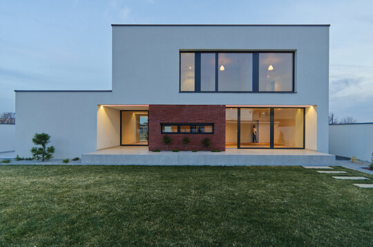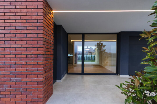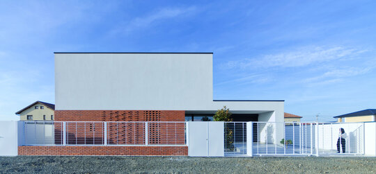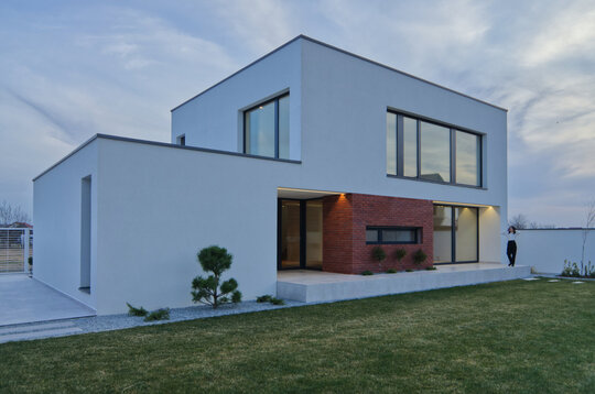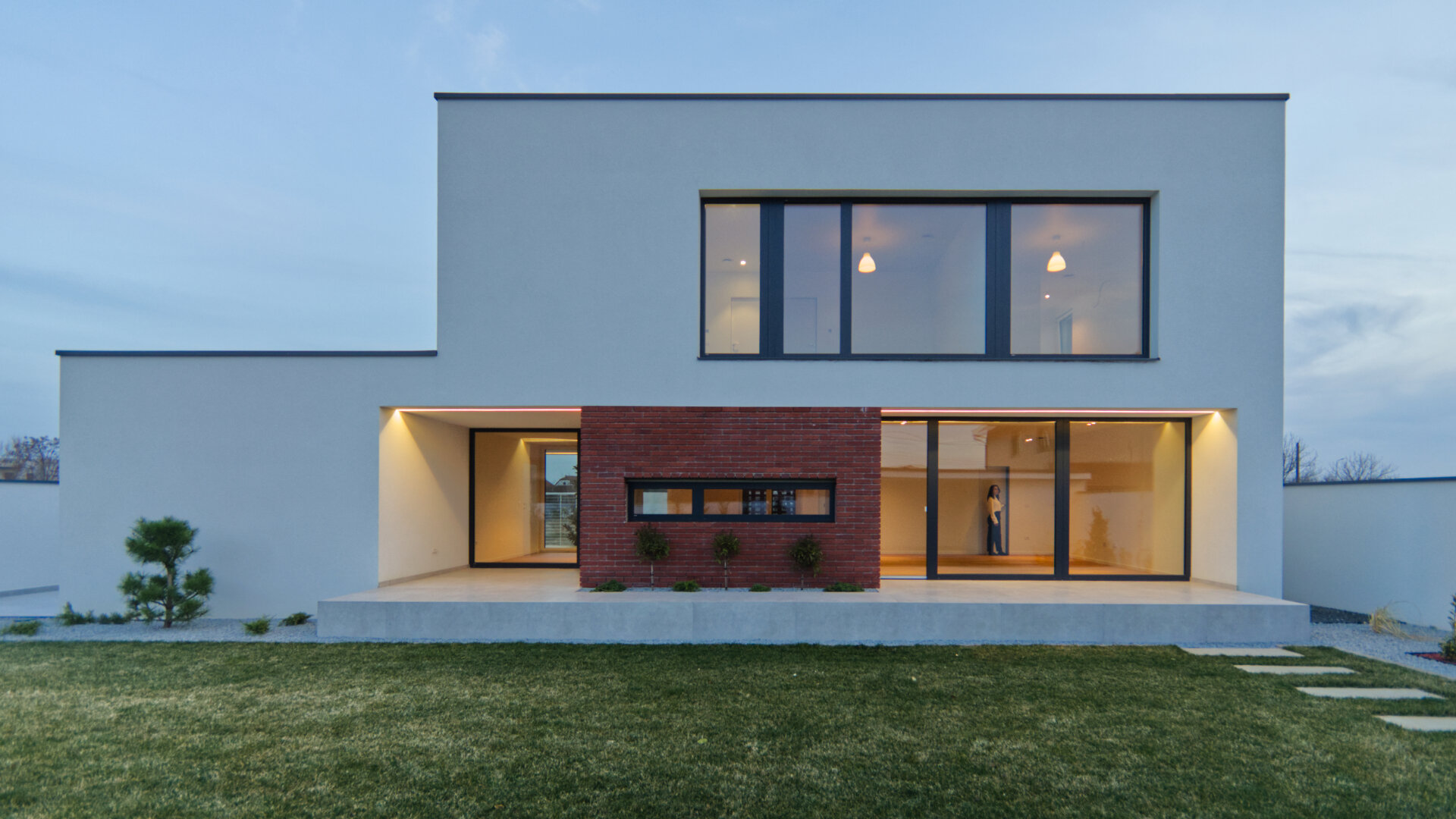 Exteriorul reședinței afișează o estetică simplă, dar elegantă, caracterizată printr-un volum sobru, decorat la parter cu o fațadă din cărămidă aparentă. Cărămizile, cu tonurile lor pământii, conferă nu doar un sentiment de durabilitate, ci evocă și o legătură cu bogata moștenire arhitecturală a regiunii Banatului. Partea superioară a fațadei principale, spre limita de sud, este lipsită de ornamente și goluri pentru a conferi intimitate spațiului interior, protejându-l de lumea exterioară și creând un sanctuar liniștit și privat.