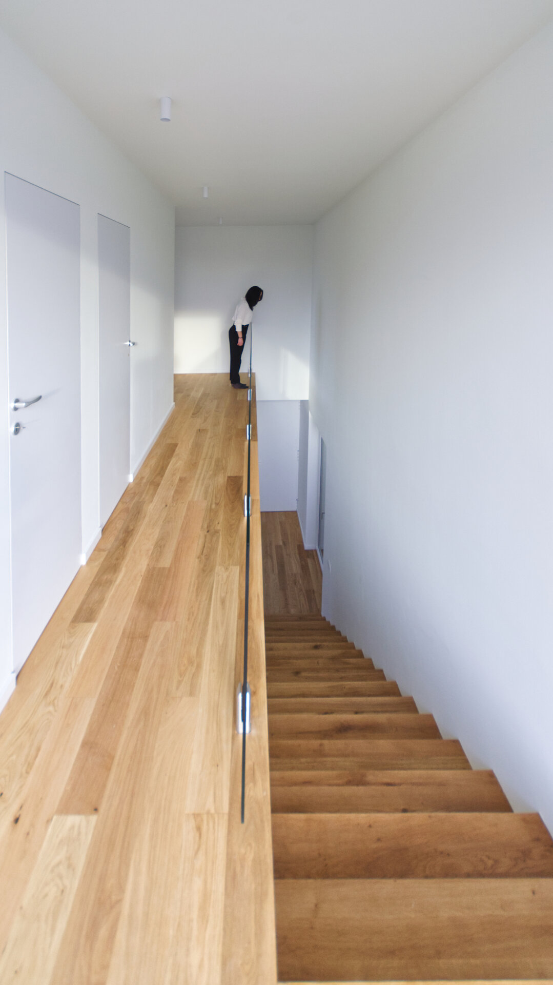 Nivelul superior este accesat prin intermediul scării din holul de intrare și dezvăluie un refugiu, gândit pentru odihnă și activități private. Etajul adăpostește două dormitoare, un spațiu de birou, o zonă de dressing, două băi și o spălătorie. Dormitoarele și biroul sunt orientate strategic spre curtea posterioară pentru a oferi intimitate și liniște. Ferestrele mari încadrează priveliști pitorești ale peisajului înconjurător, inundând fiecare cameră cu lumină naturală și conectând locatarii cu frumusețea naturii. Abordarea minimalistă a designului continuă și la acest nivel, asigurând o atmosferă coerentă și liniștitoare, propice odihnei și relaxării.