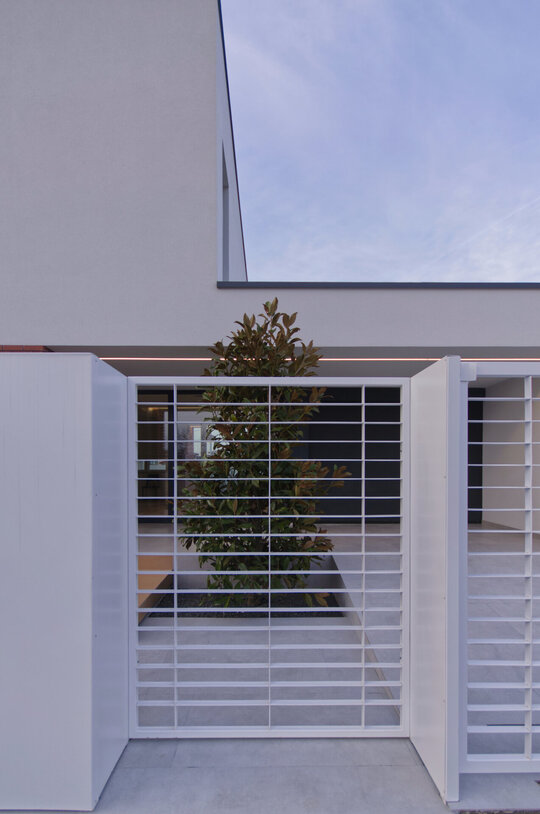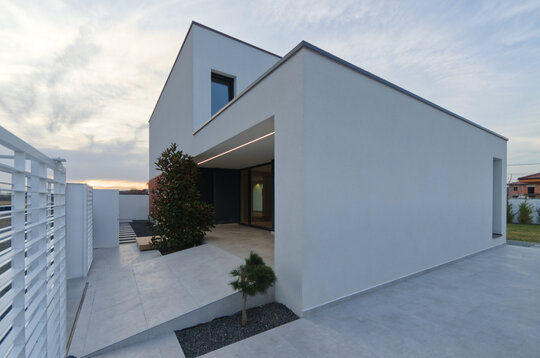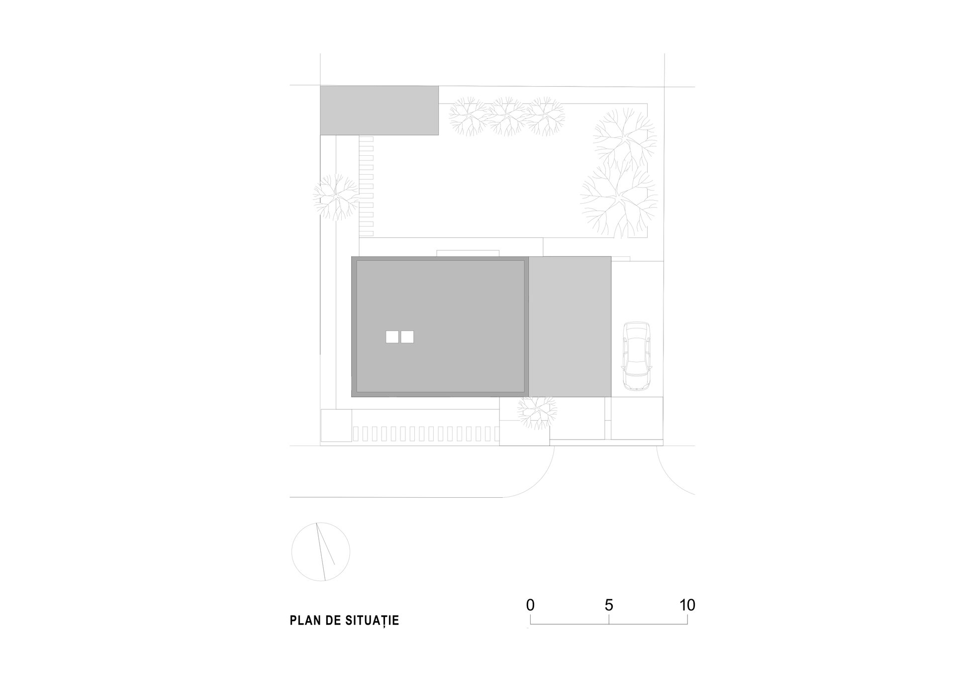 Volumul construcției urmărește linii și unghiuri drepte, dezvoltandu-se ca o prismă dreptunghiulară. Acesta este excavat pentru generarea unor buzunare de acces în locuința propriu-zisa și în garaj, dar și buzunare cu rol de terase, orientate spre curtea din spate, aflate în relație directă cu camera de zi, bucătăria și zona de luat masa. La nivelul etajului, construcția se suprapune perfect peste amprenta parterului, retrăgându-se cu aproximativ 5 m față de muchia estică.