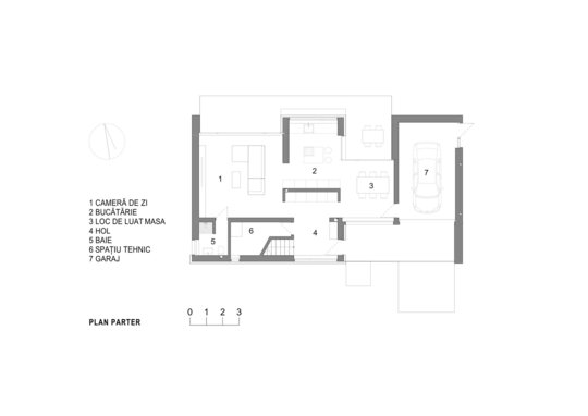 De asemenea, parterul găzduiește și spațiile servante ale casei, precum garajul, spațiul tehnic și o baie. Acestea sunt amplasate pe perimetrul casei, în jurul spațiilor servite.