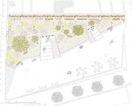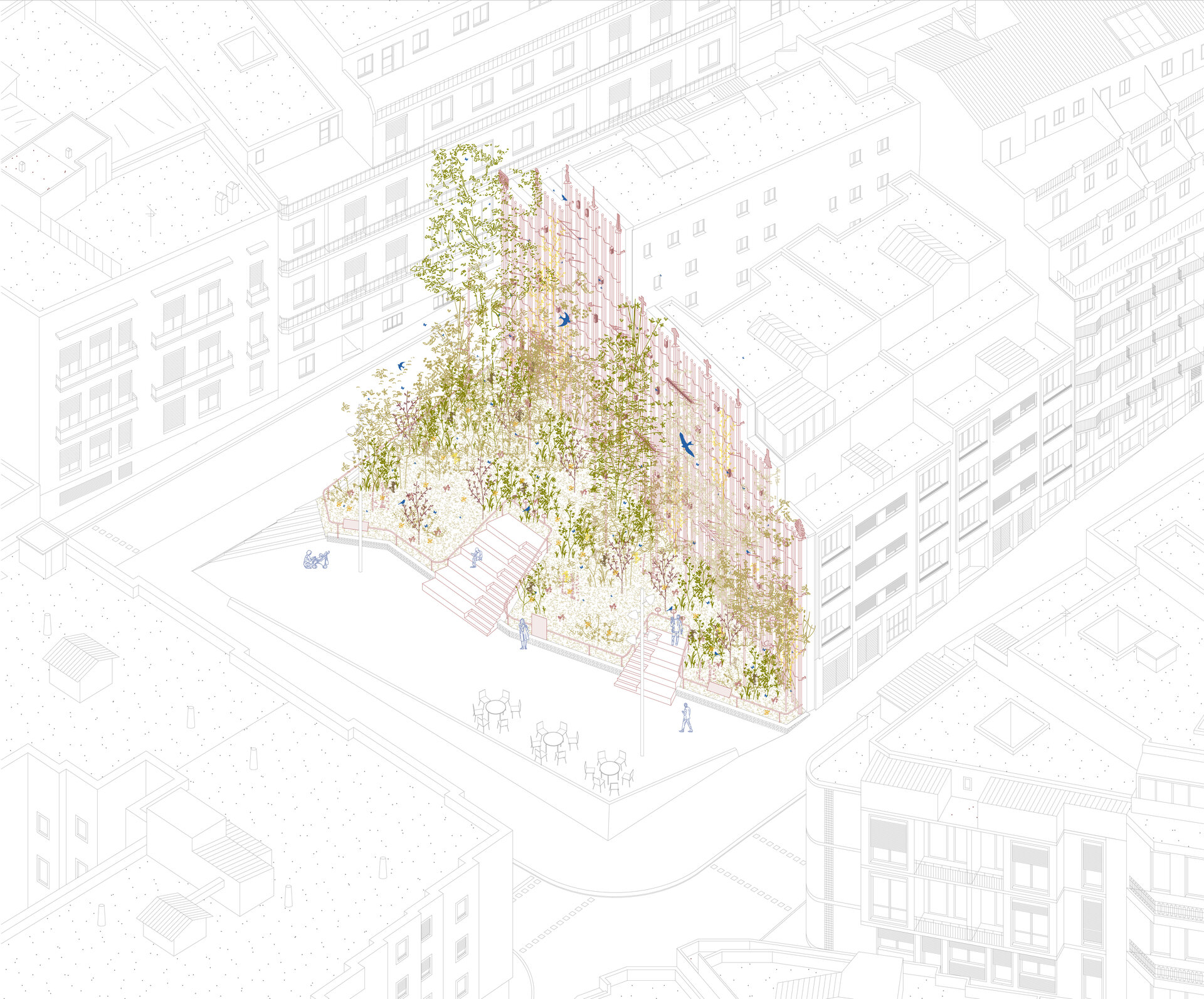 Terenul situat la intersecția dintre Carrer del Pantà de Tremp și Carrer de Moratín / Carrer de Dante Alighieri este unul dintre puținele loturi neconstruite din acest cartier foarte dens, creând astfel oportunitatea ca natura să îl revendice într-o manieră unică. Acest concept a apărut pornind de la o mică masă de pământ cu câțiva copaci existenți deja, având ca fundal calcanul. O zonă verde ușor înălțată, câteva bănci și terasa unui restaurant/bar din apropiere sugerează specificul locului. Calcanul rămâne un fundal în fața căruia o structură metalică preia rolul de a susține și de a stimula dezvoltarea unei zone de biodiversitate în oraș.