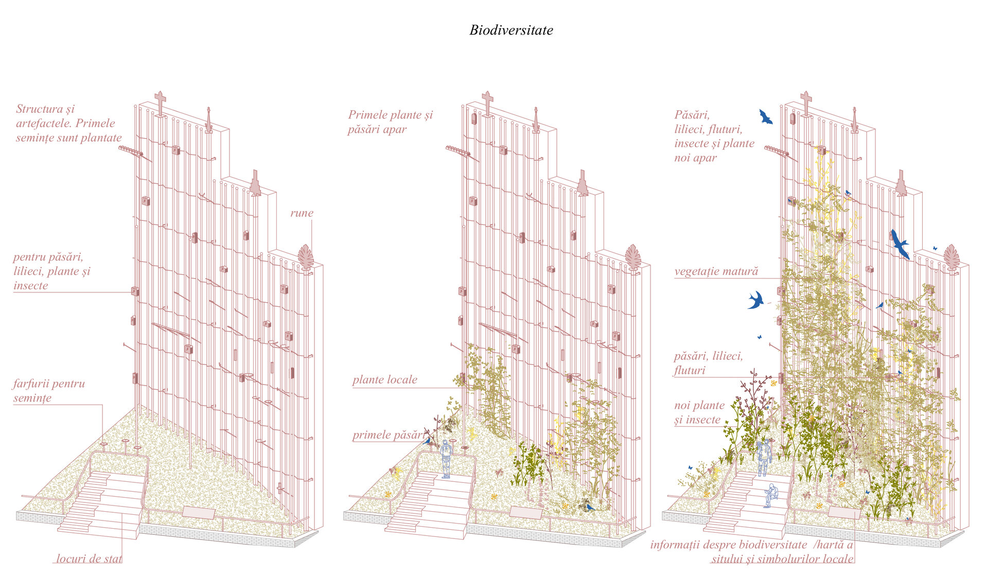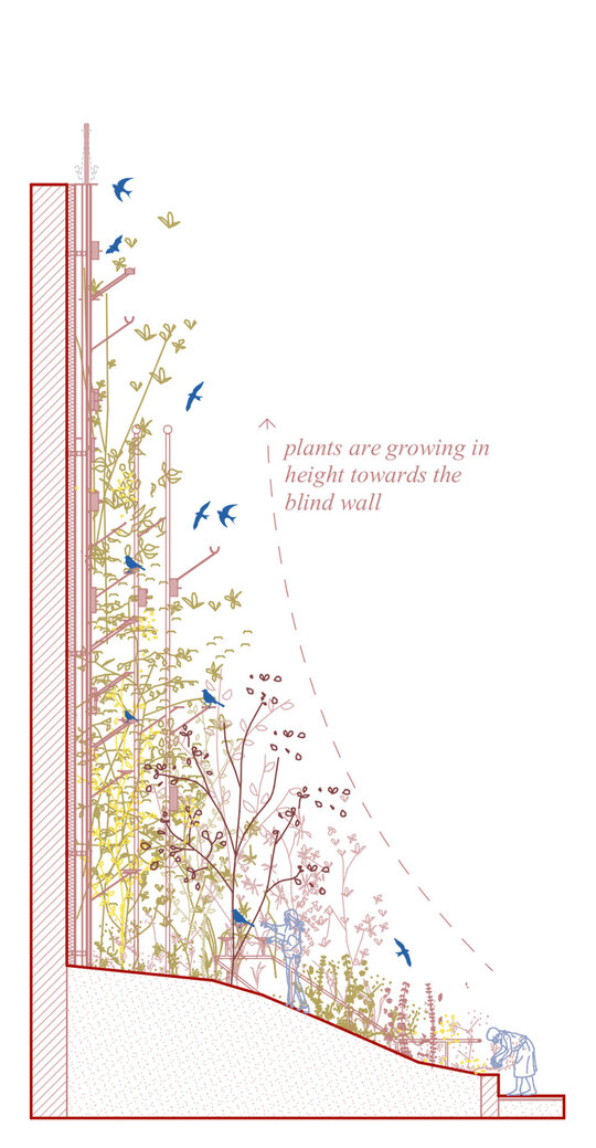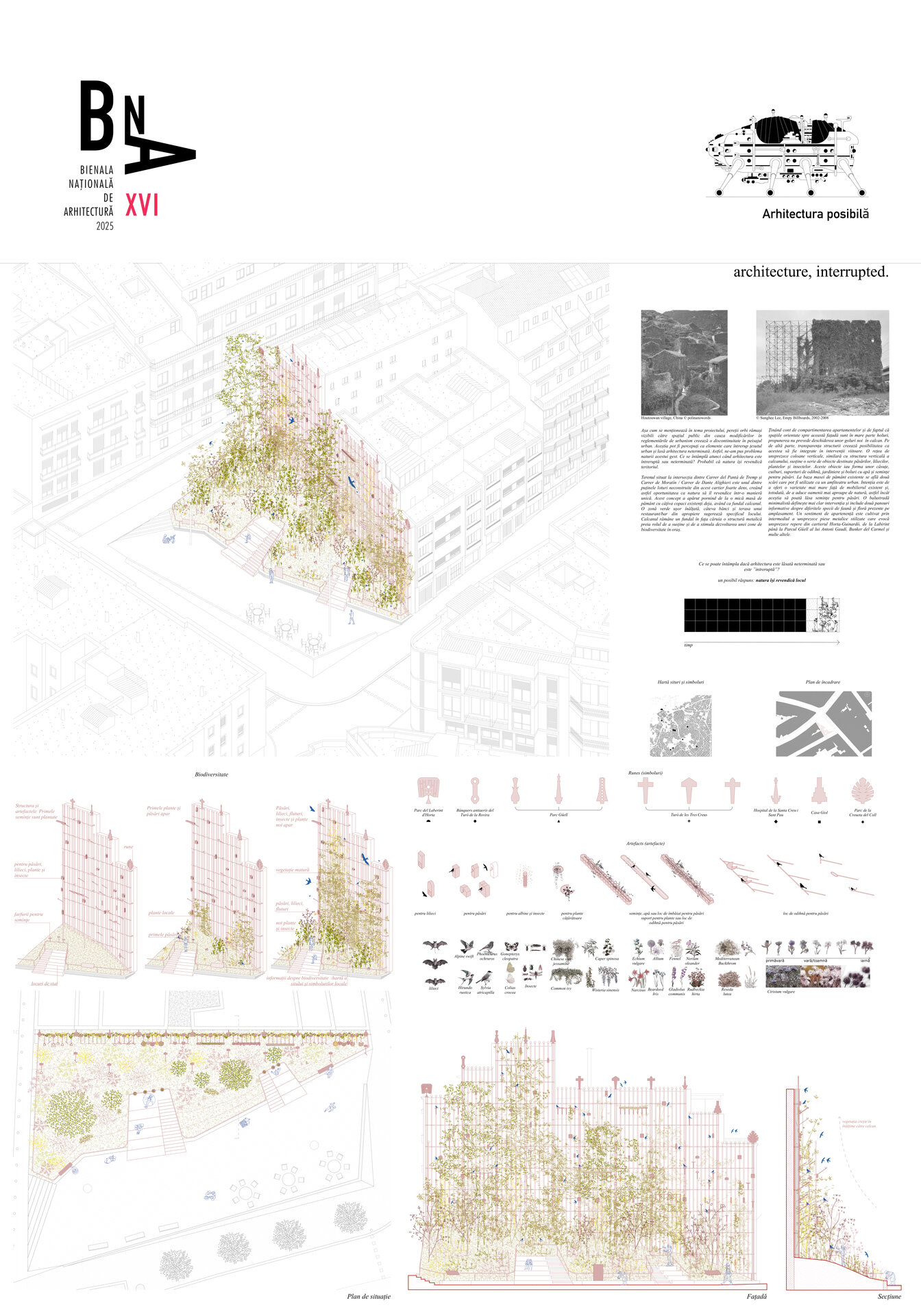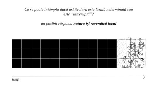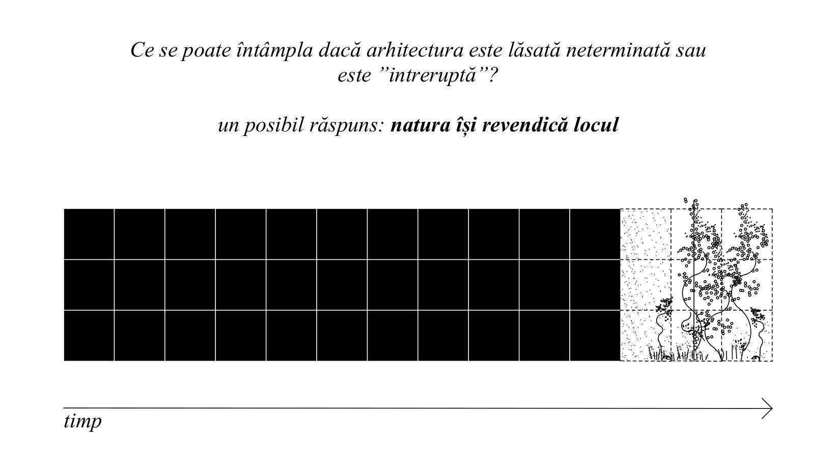 Așa cum se menționează în tema proiectului, pereții orbi rămași vizibili către spațiul public din cauza modificărilor în reglementările de urbanism creează o discontinuitate în peisajul urban. Aceștia pot fi percepuți ca elemente care întrerup țesutul urban și lasă arhitectura neterminată. Astfel, ne-am pus problema naturii acestui gest. Ce se întâmplă atunci când arhitectura este întreruptă sau neterminată? Probabil că natura își revendică teritoriul.