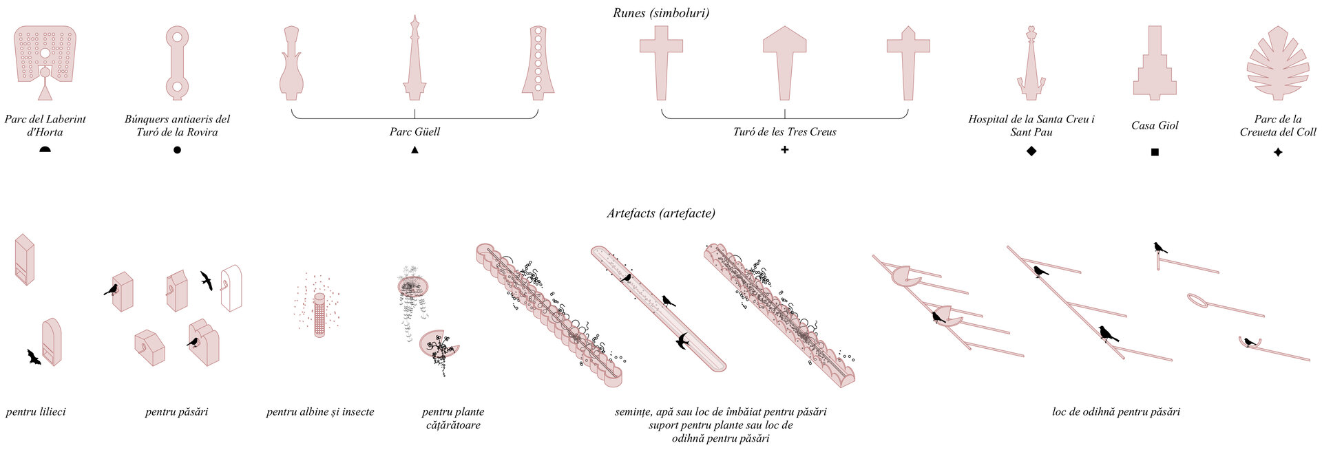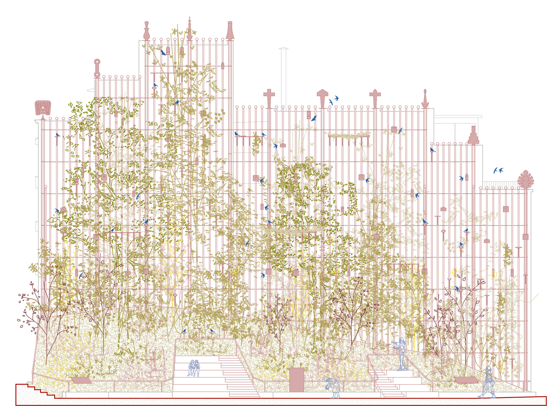 Ținând cont de compartimentarea apartamentelor și de faptul că spațiile orientate spre această fațadă sunt în mare parte holuri, propunerea nu prevede deschiderea unor goluri noi în calcan. Pe de altă parte, transparența structurii creează posibilitatea ca acestea să fie integrate în intervenții viitoare. O rețea de unsprezece coloane verticale, similară cu structura verticală a calcanului, susține o serie de obiecte destinate păsărilor, liliecilor, plantelor și insectelor. Aceste obiecte iau forma unor căsuțe, cuiburi, suporturi de odihnă, jardiniere și boluri cu apă și semințe pentru păsări. La baza masei de pământ existente se află două scări care pot fi utilizate ca un amfiteatru urban. Intenția este de a oferi o varietate mai mare față de mobilierul existent și, totodată, de a aduce oamenii mai aproape de natură, astfel încât aceștia să poată lăsa semințe pentru păsări. O balustradă minimalistă definește mai clar intervenția și include două panouri informative despre diferitele specii de faună și floră prezente pe amplasament. Un sentiment de apartenență este cultivat prin intermediul a unsprezece piese metalice stilizate care evocă unsprezece repere din cartierul Horta-Guinardó, de la Labirint până la Parcul Güell al lui Antoni Gaudí, Bunker del Carmel și multe altele.