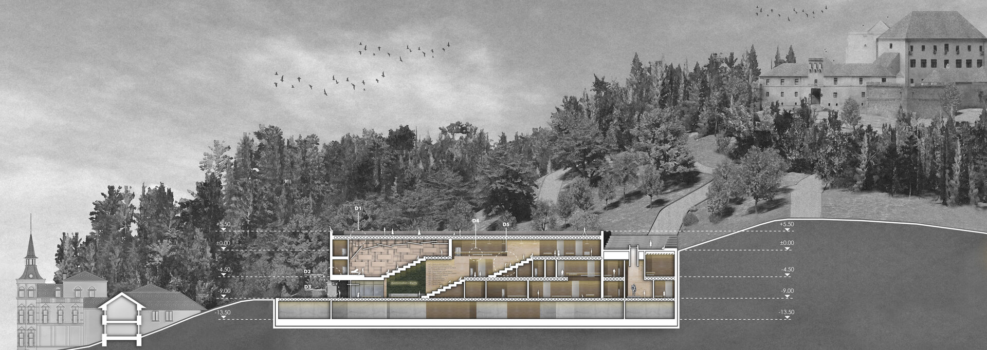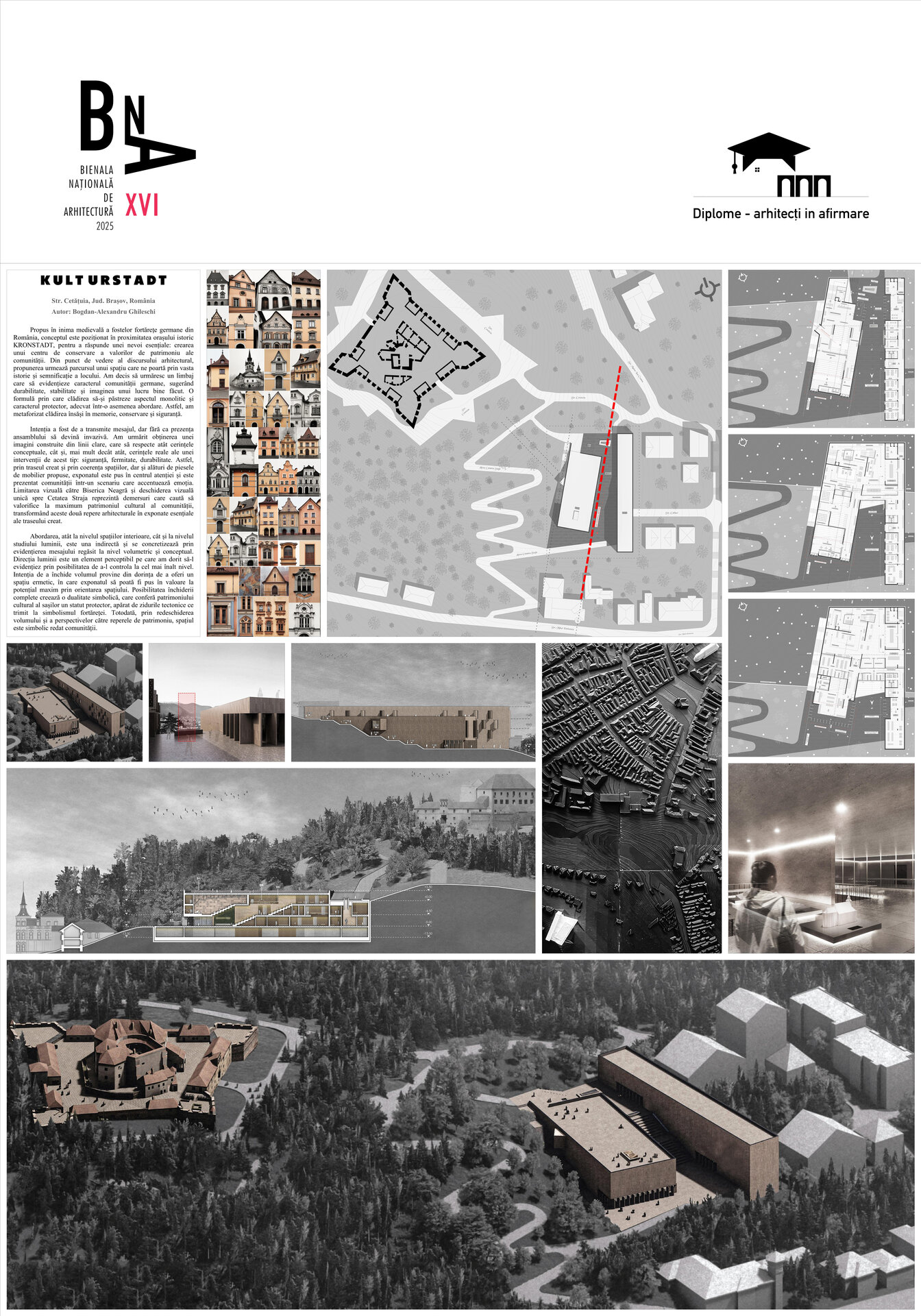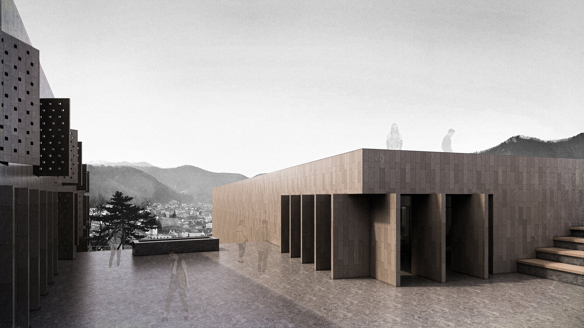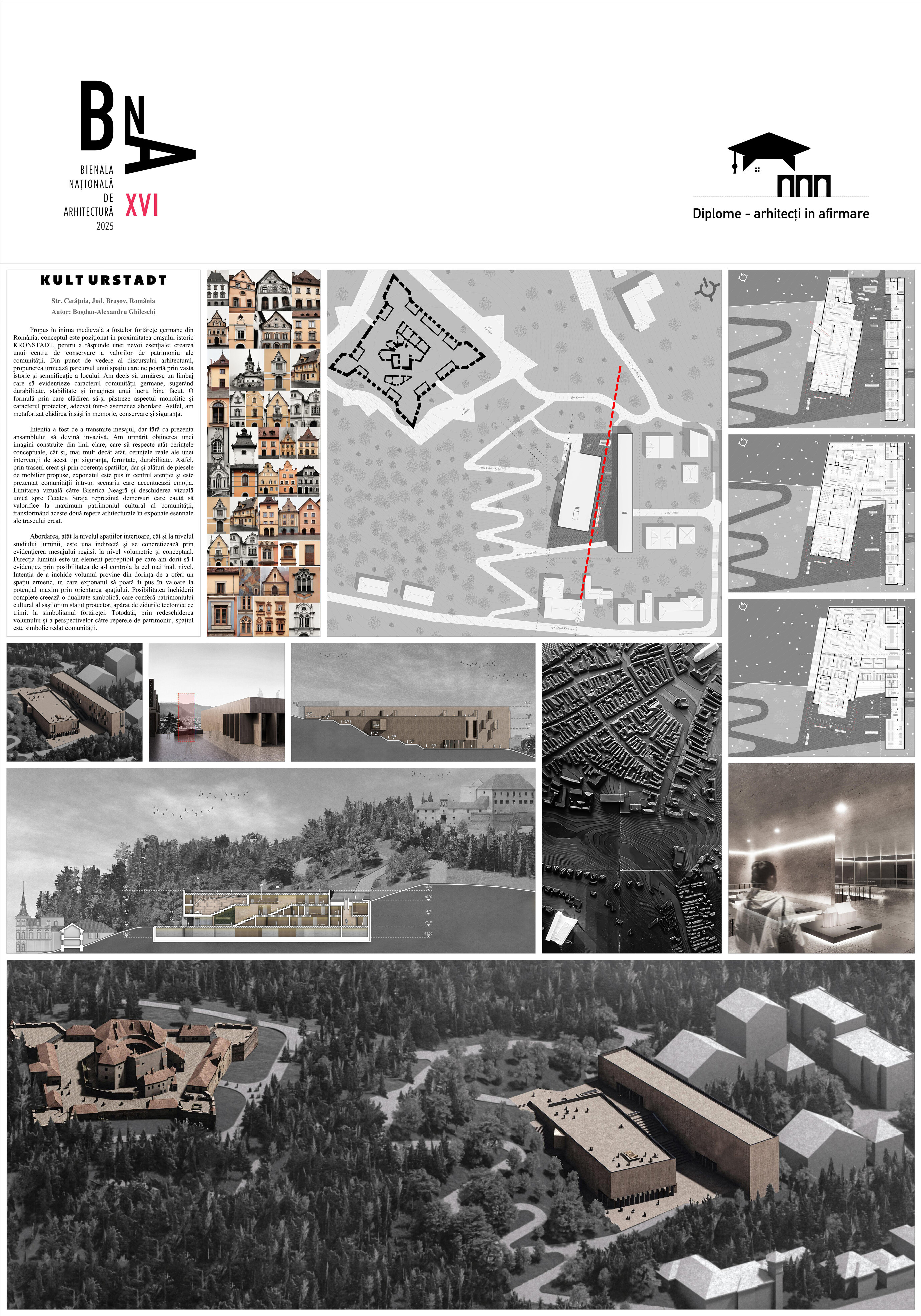 Propus în inima medievală a fostelor fortărețe germane din România, conceptul este poziționat în proximitatea orașului istoric KRONSTADT, pentru a răspunde unei nevoi esențiale: crearea unui centru de conservare a valorilor de patrimoniu ale comunității. Din punct de vedere al discursului arhitectural, propunerea urmează parcursul unui spațiu care ne poartă prin vasta istorie și semnificație a locului. Am decis să urmăresc un limbaj care să evidențieze caracterul comunității germane, sugerând durabilitate, stabilitate și imaginea unui lucru bine făcut. O formulă prin care clădirea să-și păstreze aspectul monolitic și caracterul protector, adecvat într-o asemenea abordare. Astfel, am metaforizat clădirea însăși în memorie, conservare și siguranță.