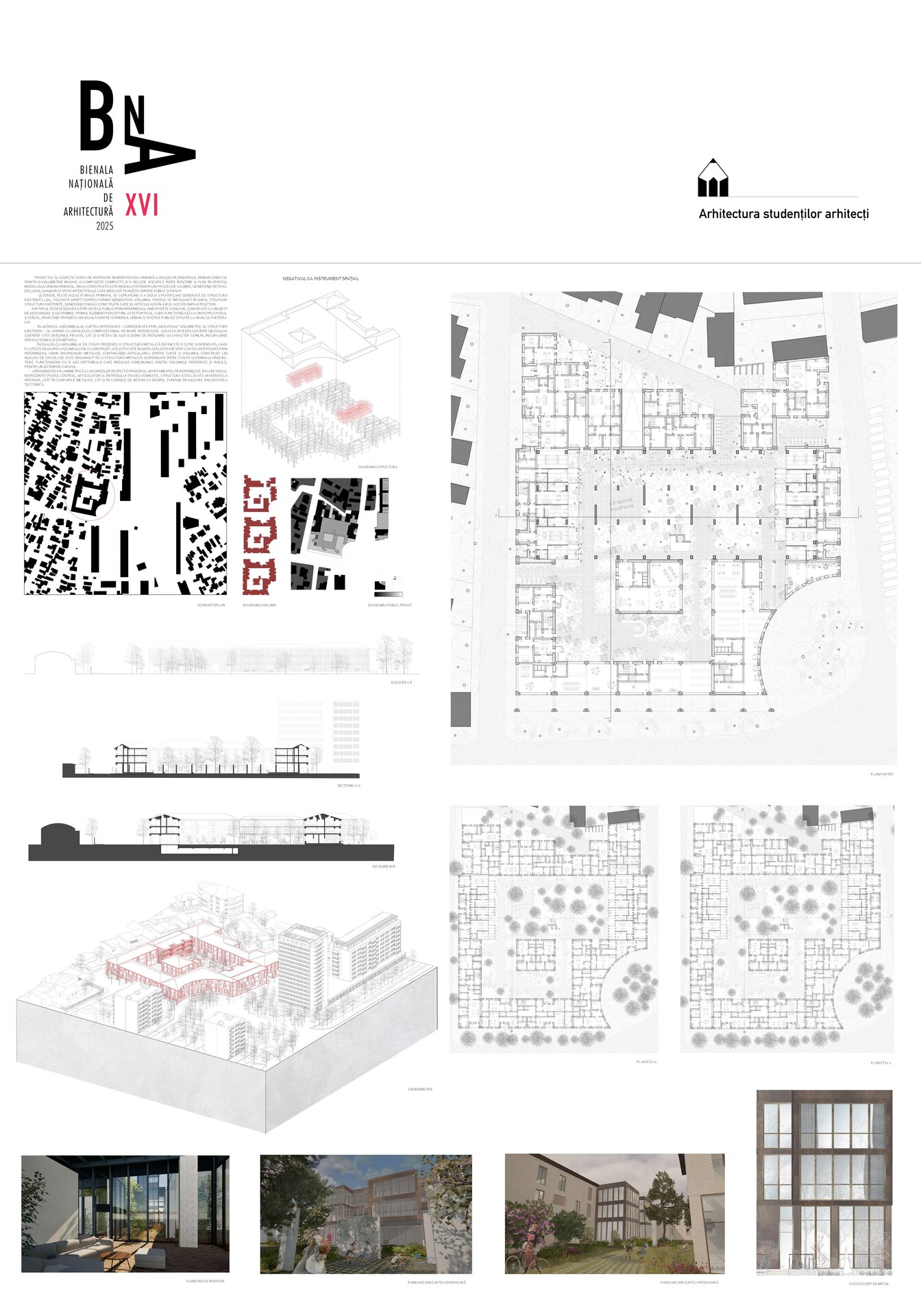 În adâncul ansamblului, curtea interioară – configurată prin „negativul” volumetric al structurii existente – se afirmă ca un nucleu compozițional de mare intensitate. Aceasta integrează într-un dialog coerent atât grădinile private, cât și o rețea de alei și zone de întâlnire cu caracter comun, încurajând interacțiunea și coabitarea.
