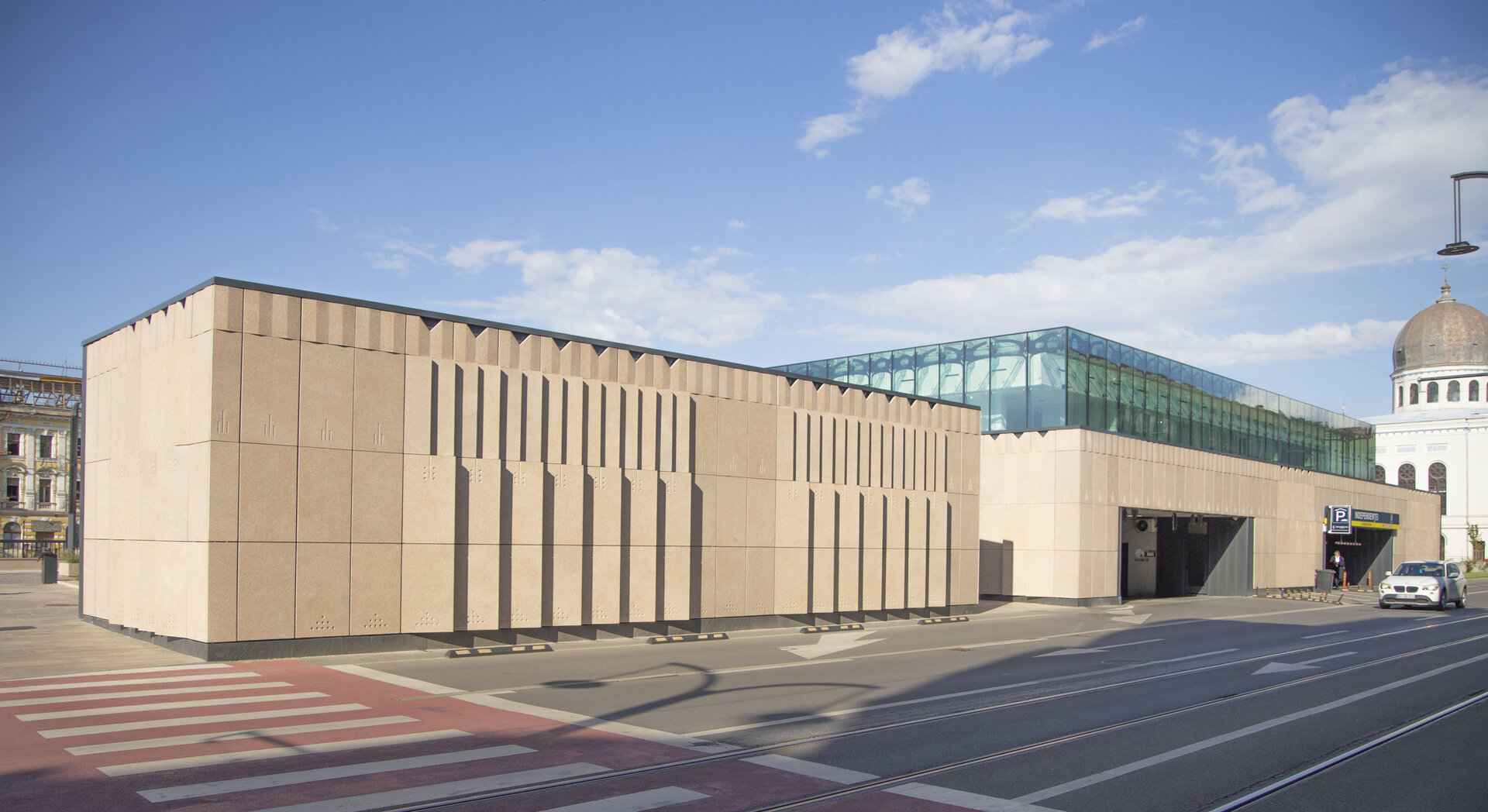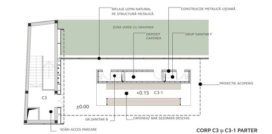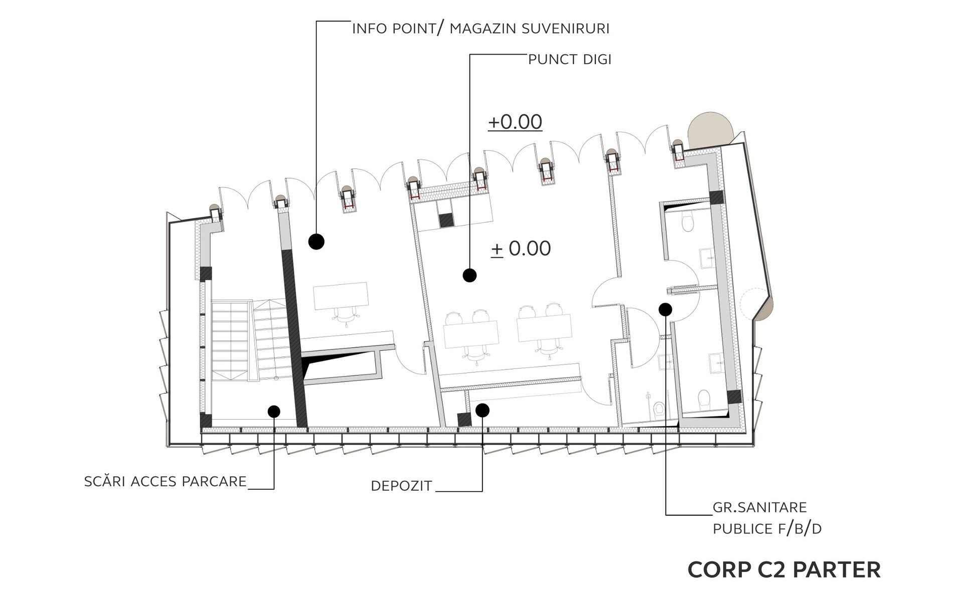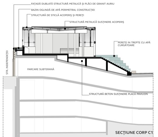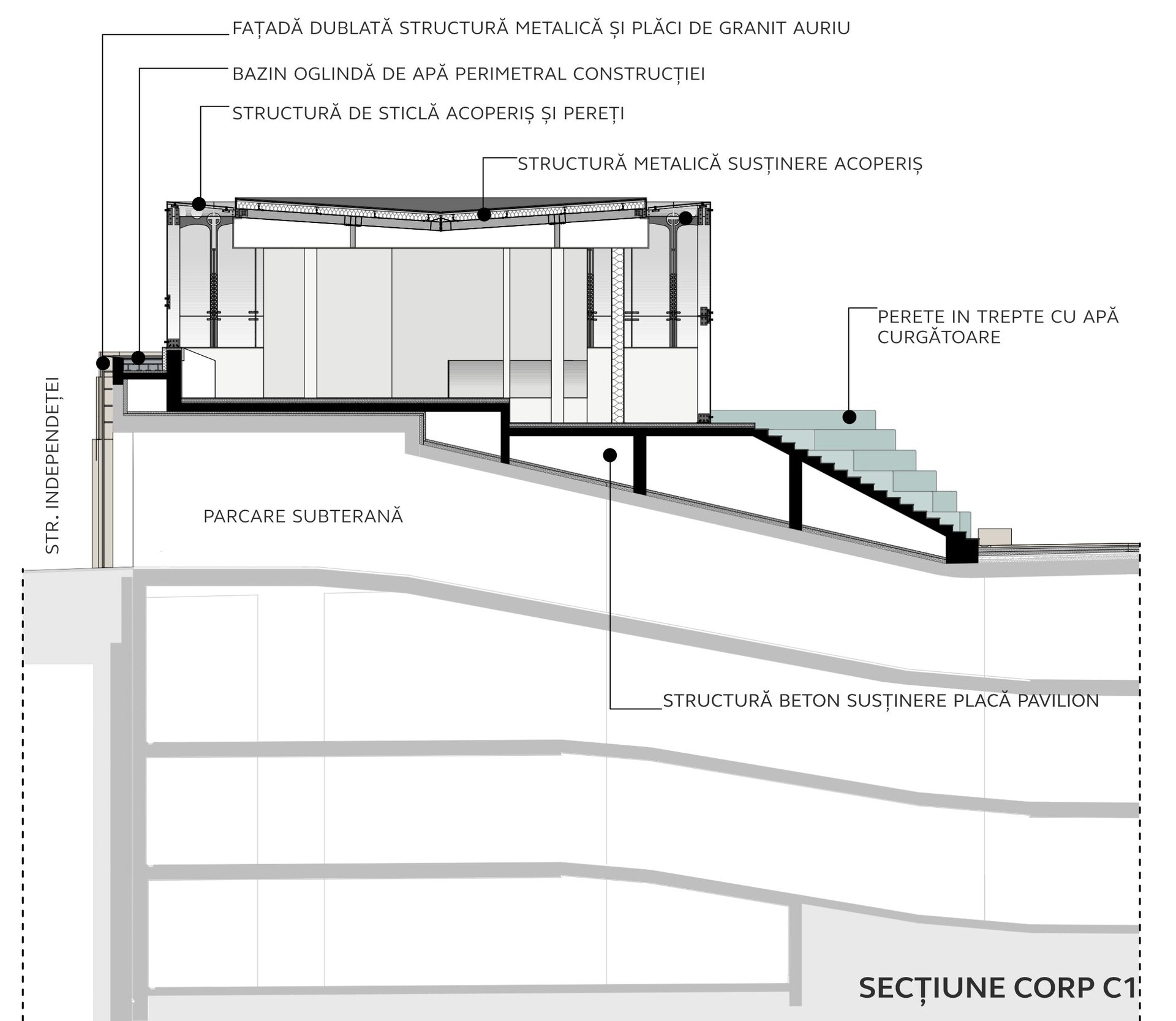 Primul palier, cel de bază, este conceput în directă legătură şi condiţionare cu amplasamentul deja construit al parcării subterane. În acest sens, am anvelopat volumul existent cu o suprafaţă opacă din piatră (granit auriu), ale cărei module au fost montate pe o structură individuală metalică.
