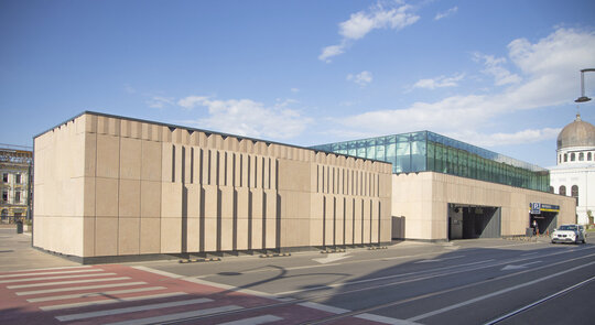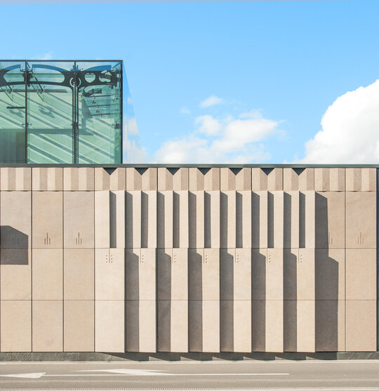 Învelişul din piatră este alcătuit din module decorate cu simboluri florale, puternic stilizate în manieră Secession.