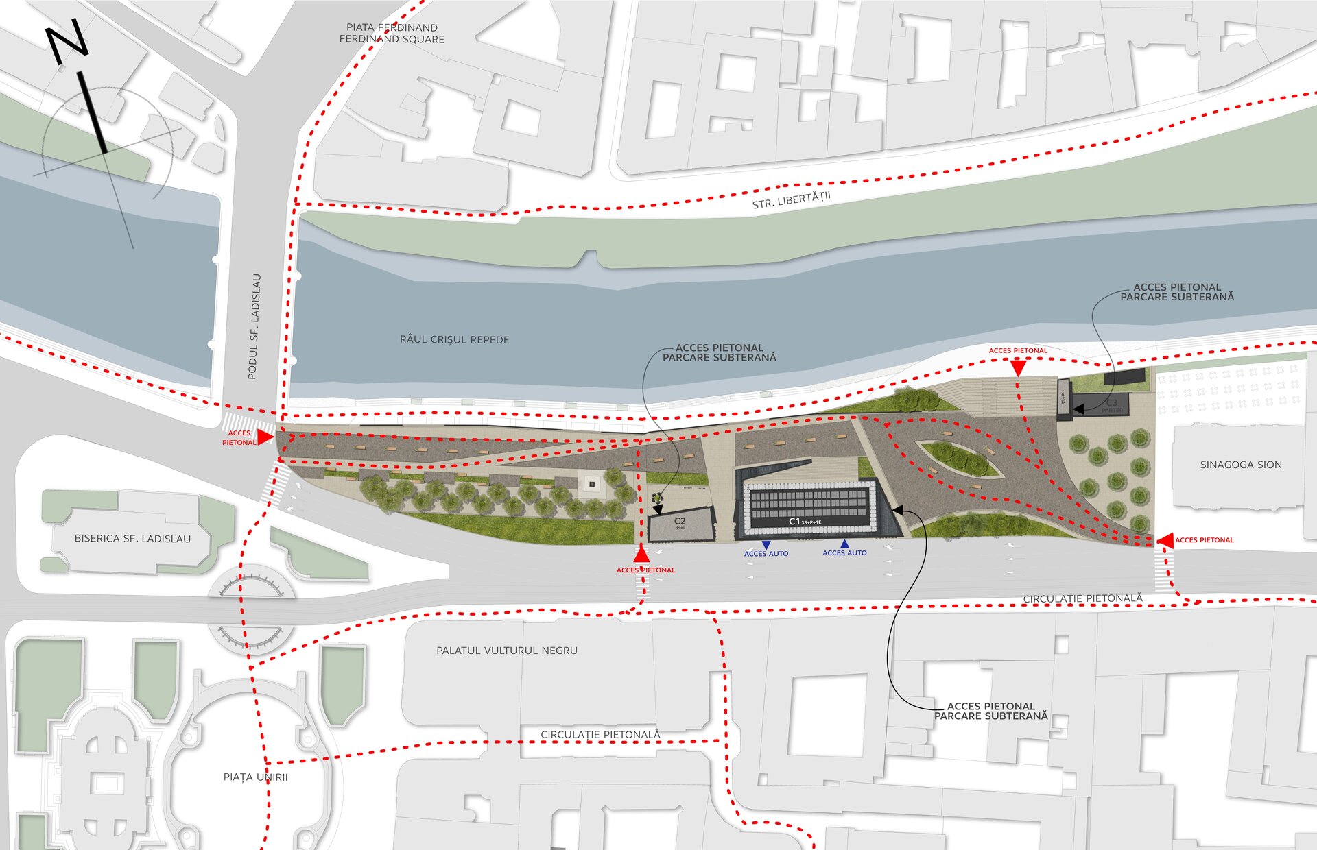 Fluxul pietonal se desfăşoară pe partea protejată a esplanadei, definită de piaţetă şi de zonele de promenadă. Zonele de circulaţie şi acces sunt trasate prin intermediul spaţiilor verzi.