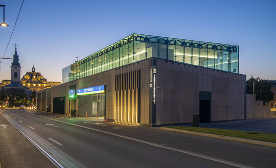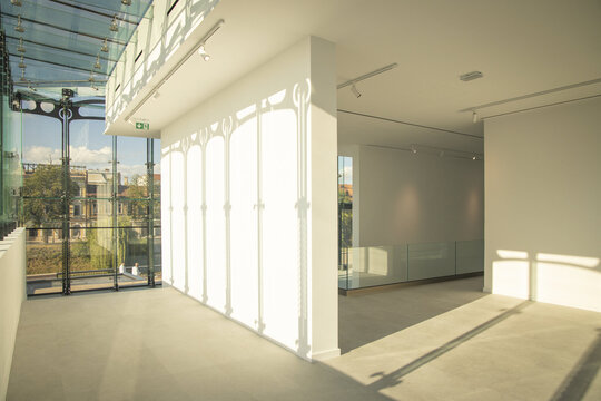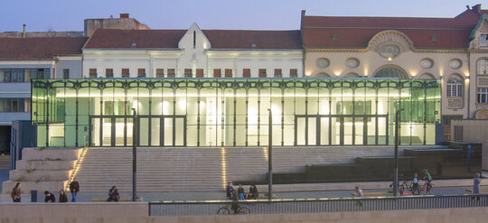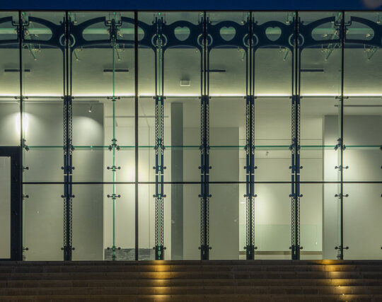 Suprafaţa vitrată este proiectată să aibă o dublă expresivitate, una diurnă, şi alta nocturnă. Pe timp de zi, suprafaţa vitrată verzuie şi bazinul de apă reflectă ca o oglindă toate elementele din jur şi pare că se dizolvă în mediul înconjurător, nefiind un obstacol vizual iar pe timp de noapte volumul de sticlă prinde viață prin iluminatul perimetral al tavanului și corpurile de iluminat ale galeriei.
