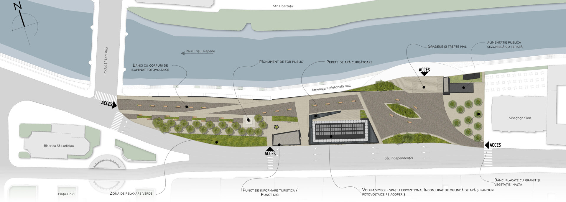 Ghidajele de circulaţie sunt sugerate cu mijloace optice, prin texturarea pavimentului şi prin indicatorii de lumină. În acest fel, proiectul nostru se racordează firesc la proiectul deja existent, potenţând valenţele arhitecturale ale sitului: pasaj, for public, punct de belvedere şi spaţiu contemplativ, adăugând zonei istorice și elemente de sustenabilitate cum ar fi panourile fotovoltaice, sistemul de încălzire și răcire alimentat de panourile fotovoltaice, stâlpii de iluminat fotovoltaici și stâlpii inteligenți cu camere video.