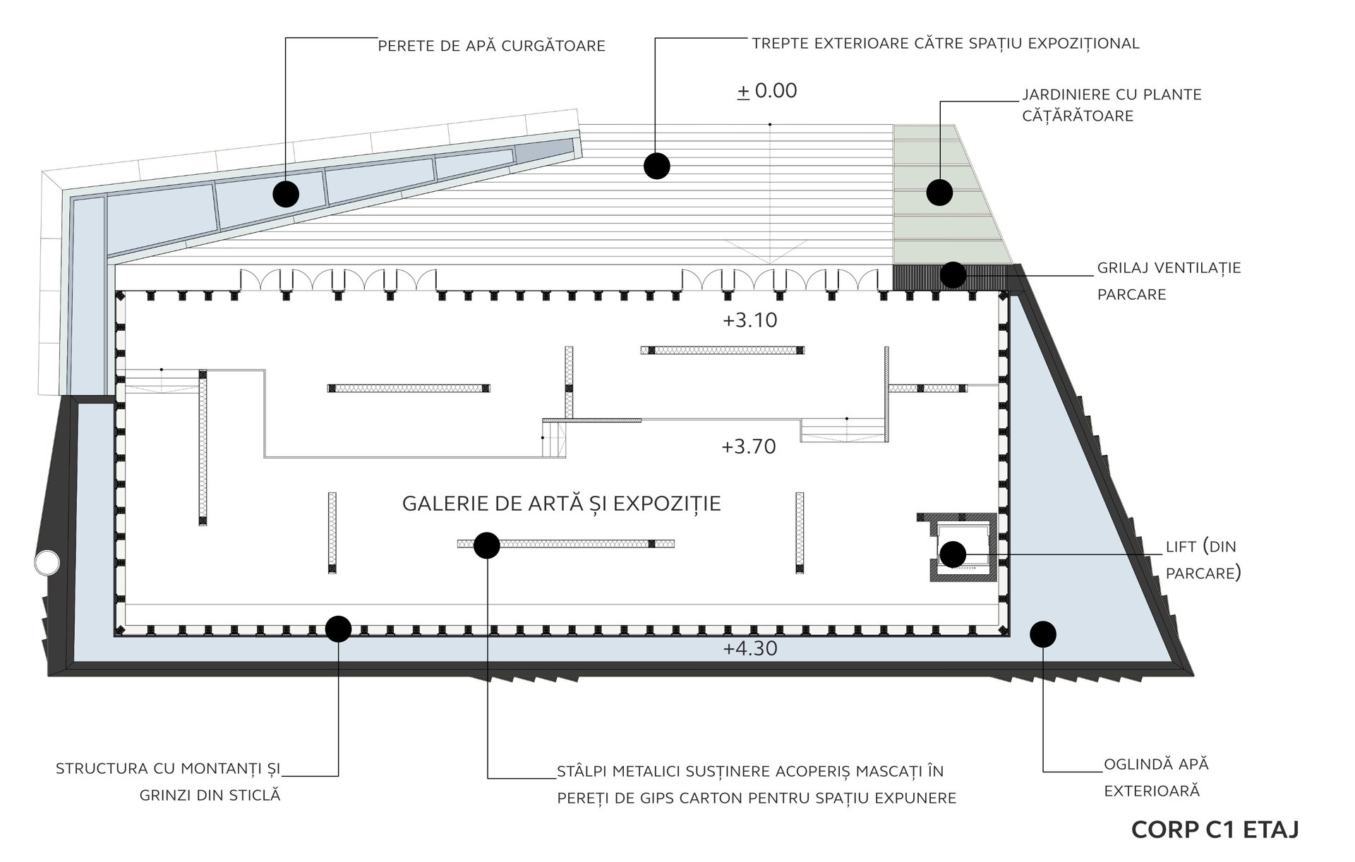 Al doilea palier, volumul din sticlă proiectat deasupra clădirii existente, ce va adăposti o galerie de artă. Acest volum din sticlă transparentă constituie, în fapt, elementul simbolic esenţial al ansamblului.