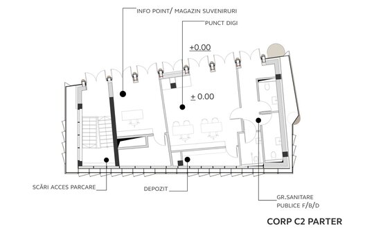 Din zona pietonală accesul se face prin treptele ce sunt flancate în dreapta de o amplă cădere de apă pe principiul vaselor comunicante, iar în stânga, de gradene cu vegetaţie ce coboară în cascadă pe peretele lateral al clădirii.