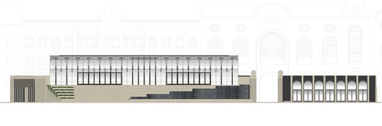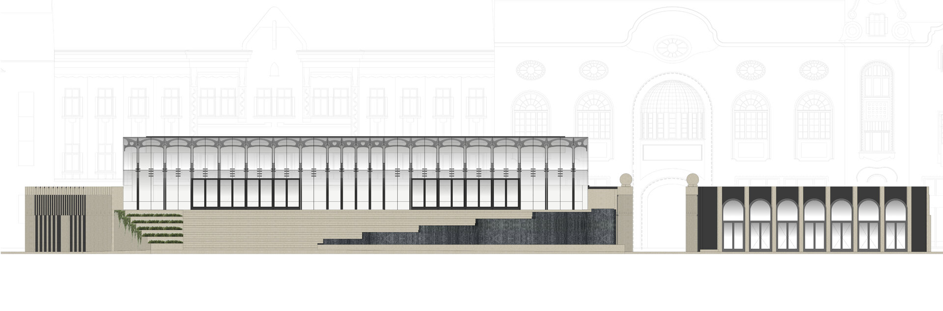 Închiderile cu sticlă sunt montate pe o structură de rezistență din sticlă retrasă din planul soclului de piatră. Pe suprafaţa rezultată prin retragere am amplasat un mic bazin cu apă pentru a genera o reflexie pe trei laturi a spaţiului expoziţional. Pe structura de sticlă s-au montat elemente metalice decorate în spirit Art Nouveau cu elemente florale, inimi şi boabe de fasole, dar şi cu elemente geometrice de tip Secession. Volumul vitrat este pus în relaţie stilistică directă cu pasajul de sticlă şi cu cupola Palatului Vulturul Negru.