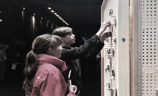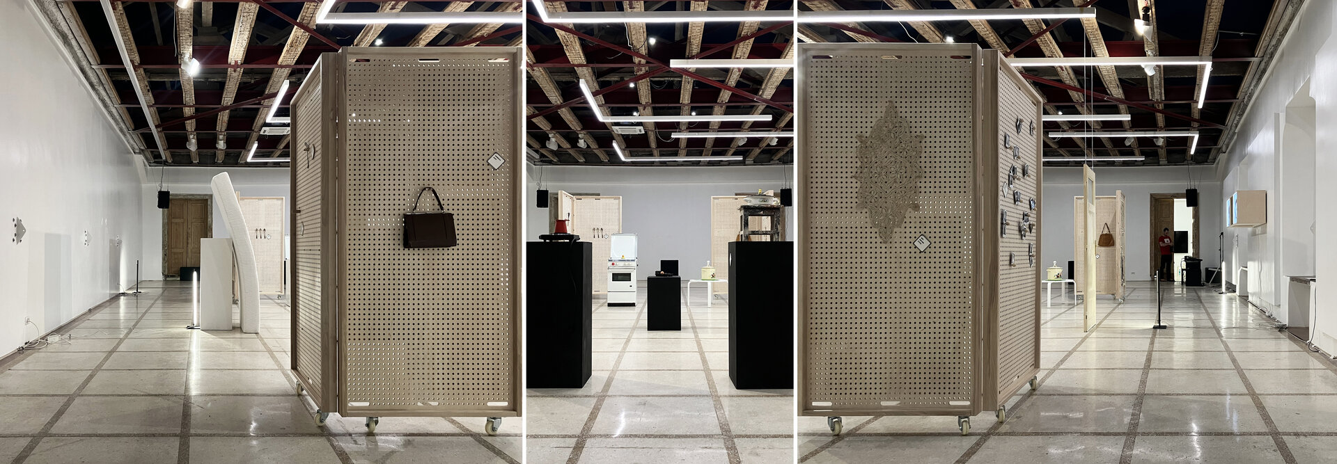 Paravan perforat de (inter)acțiune în tandem. Perete articulat pe roți, atractor de ziare, linguri, genți, binocluri și-o măsea.