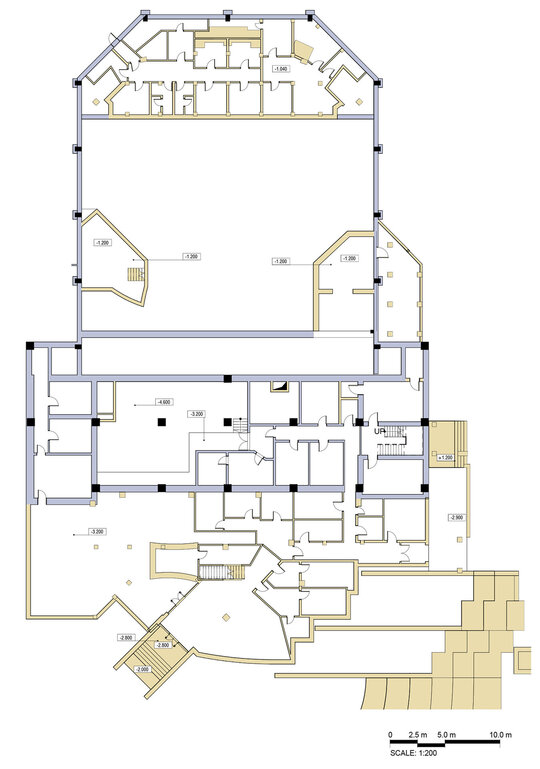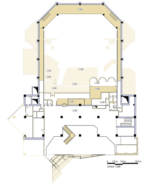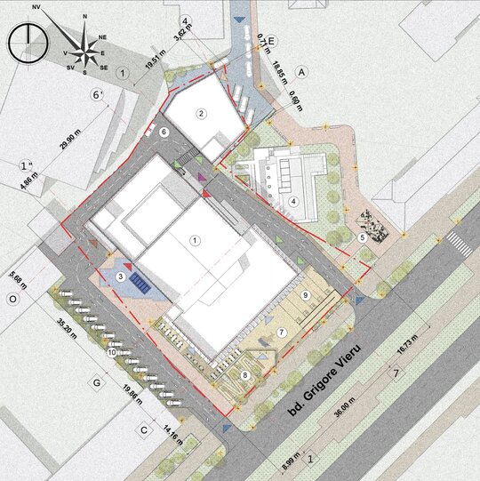 Intervenția arhitecturală răspunde problemelor existente: fațade degradate, spații interioare nefuncționale, lipsa accesibilității, iluminare insuficientă și neconformitatea cu standardele tehnice actuale. Pentru conservarea și punerea în valoare a monumentelor istorice, fațadele clădirilor istorice au fost restaurate, iar în zona Bisericii Sf. Mihail și Gavriil am propus un vitraliu în pavaj, care permite vizualizarea fundațiilor originale și oferă o legătură vizuală între trecut și prezent. Zona muzeului bisericesc a fost reconstruită ca spațiu pietonal complet accesibil, iar beciurile subterane au fost transformate într-un mic muzeu cu panouri informative despre istoria sitului, creând astfel un traseu educativ pentru vizitatori. În ansamblu, zona exterioară a fost organizată cu atenție la patrimoniu, pentru a păstra identitatea istorică și a integra armonios clădirile noi cu cele existente.