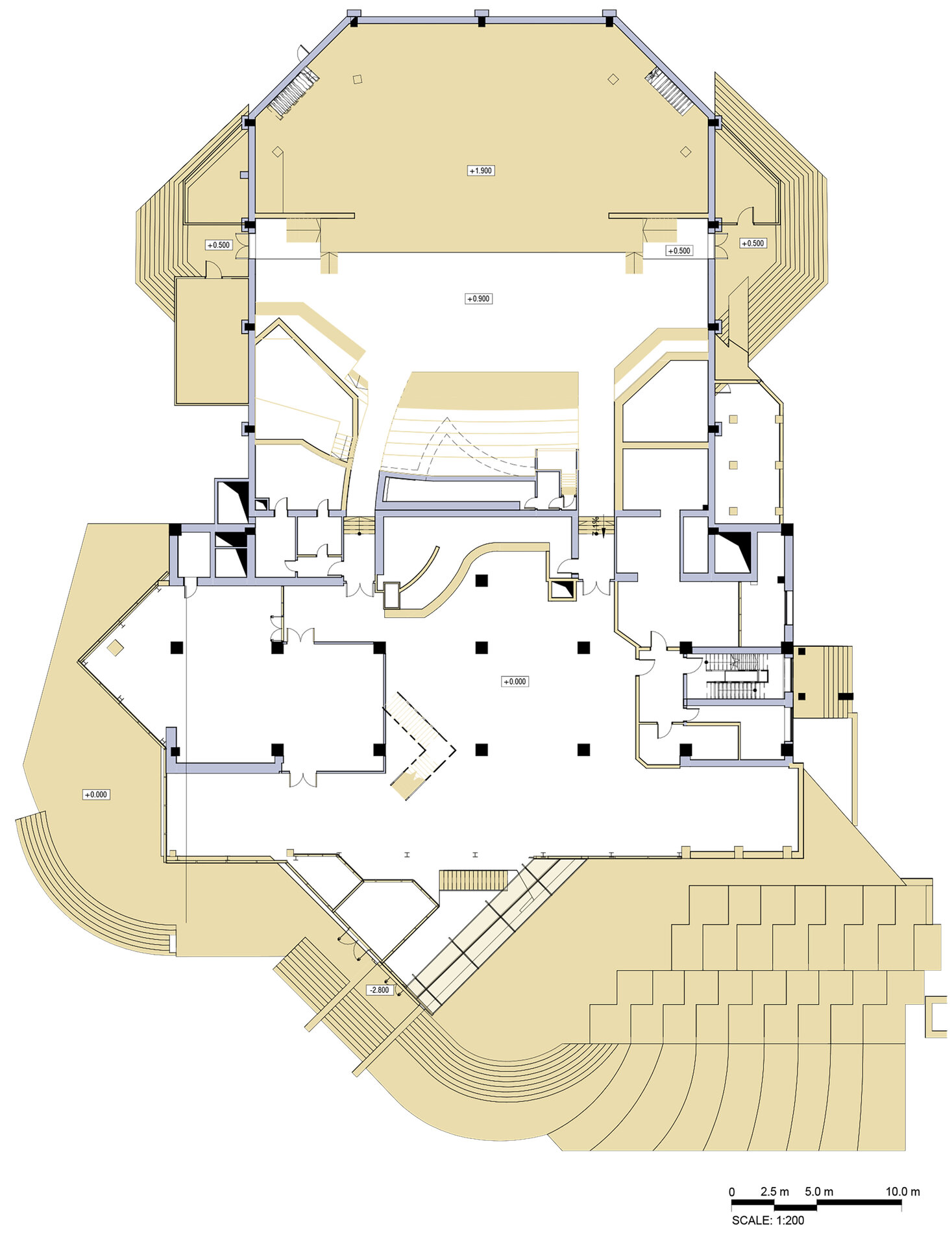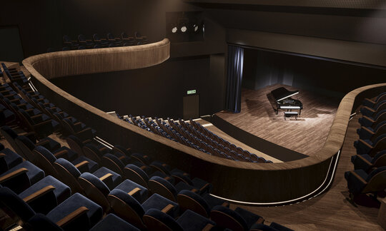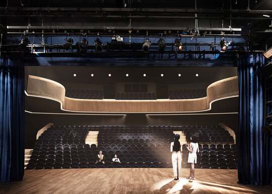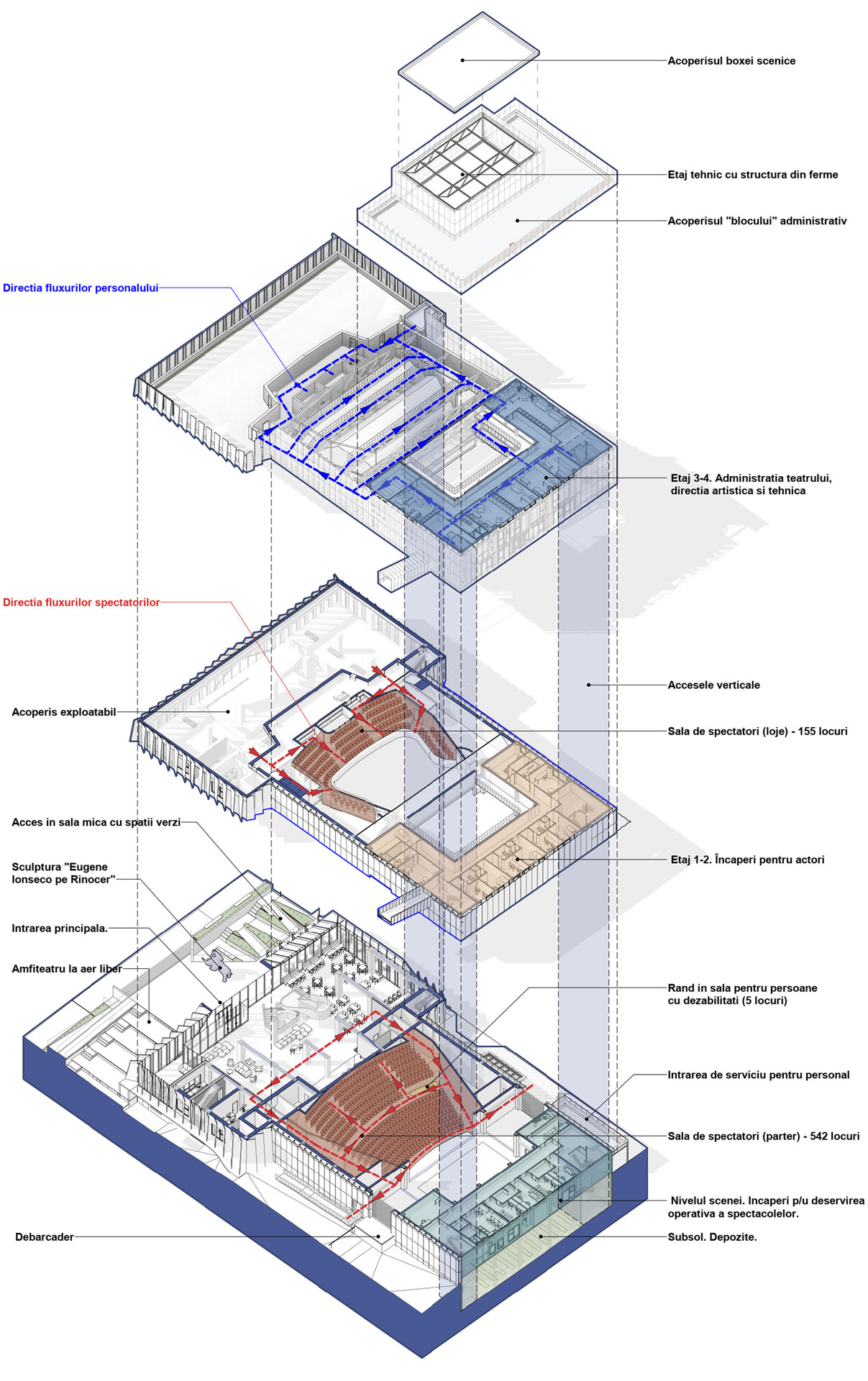 Funcțional, teatrul este organizat pe nivele bine definite: demisol – sala mică de 137 locuri, complet autonomă; parter – sala principală cu 407 locuri, foaier, cafenea și loje pentru 155 de spectatori; etaje – spații administrative, tehnice și de repetiții. În partea din spate, boxa scenică respectă standardele internaționale pentru spectacole complexe, iar blocul de producere, desfășurat pe cinci nivele, include parcare subterană, ateliere și spații dedicate artiștilor invitați.