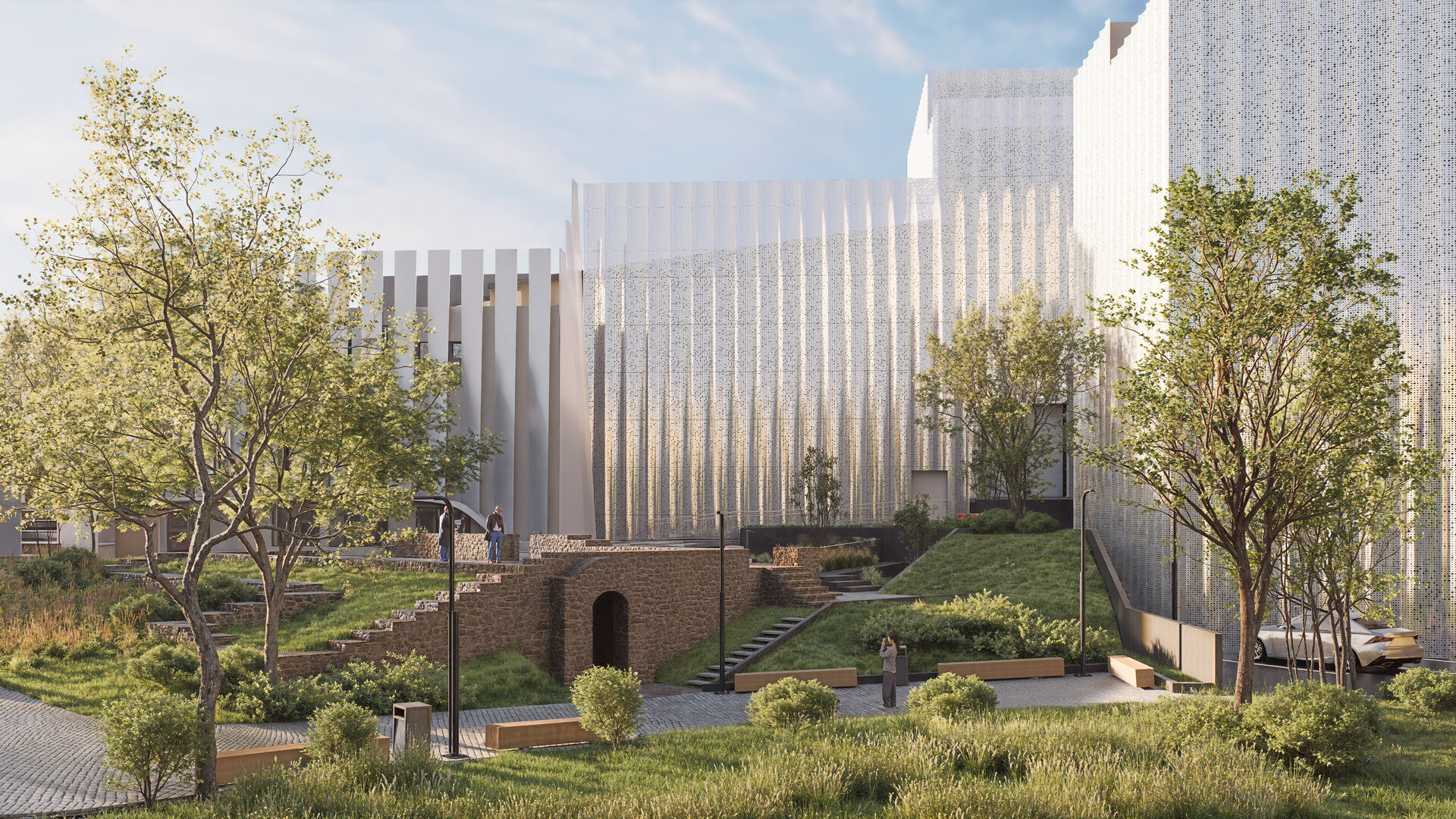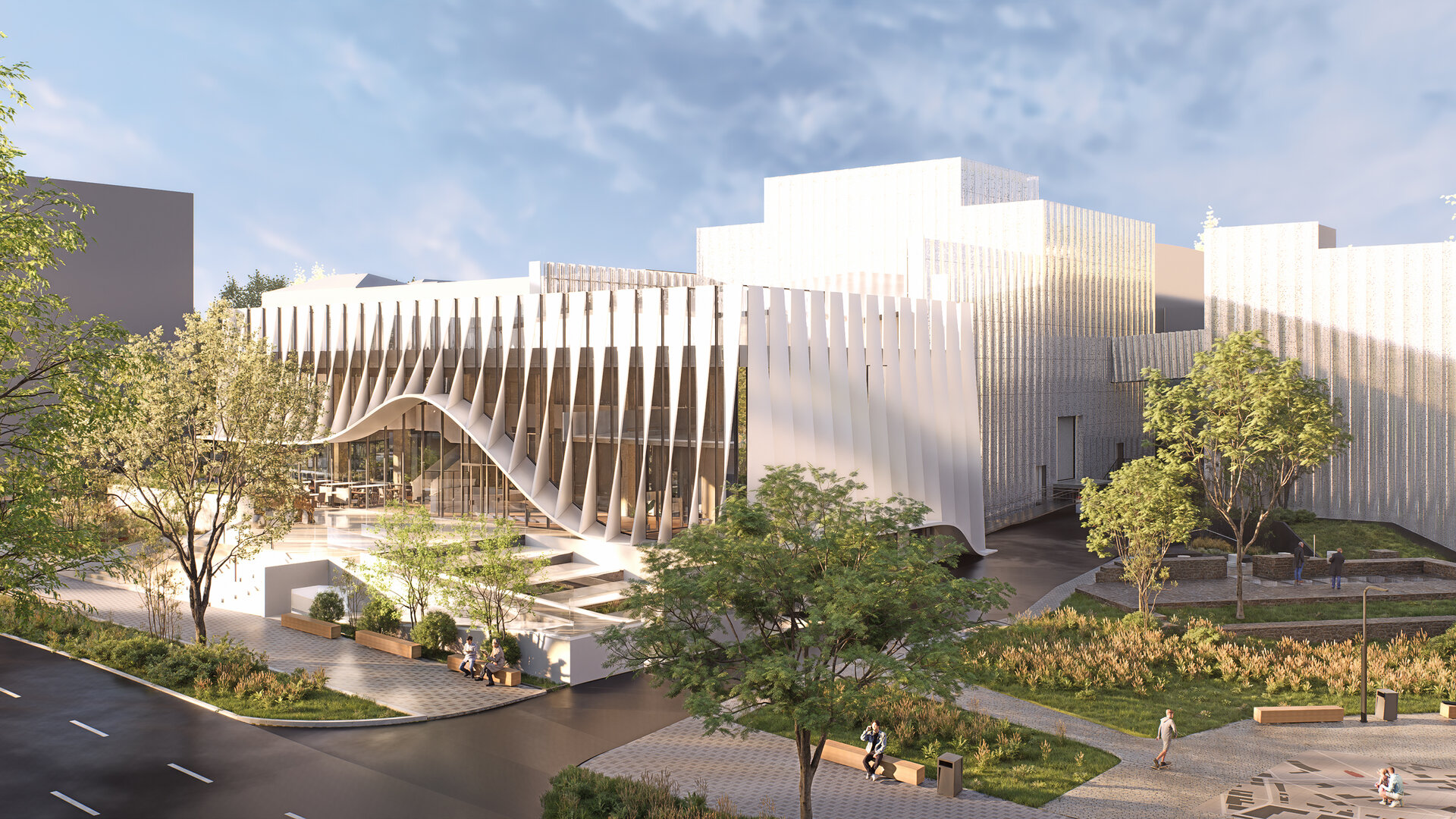 Spațiul public este animat și conectat la comunitate printr-o sculptură simbolică a lui Eugene Ionesco călare pe rinocer, marcă identitară și element de recunoaștere culturală pentru public. Traseele pietonale, zonele verzi și iluminatul ambiental au fost gândite pentru a crea un mediu sigur, accesibil și prietenos, care încurajează interacțiunea și vizitele regulate ale publicului.