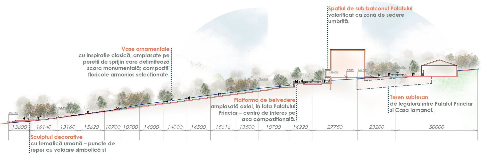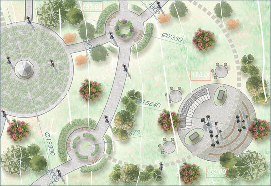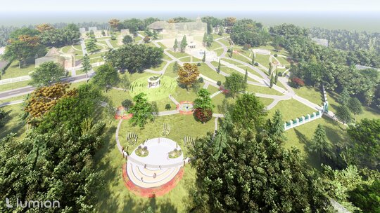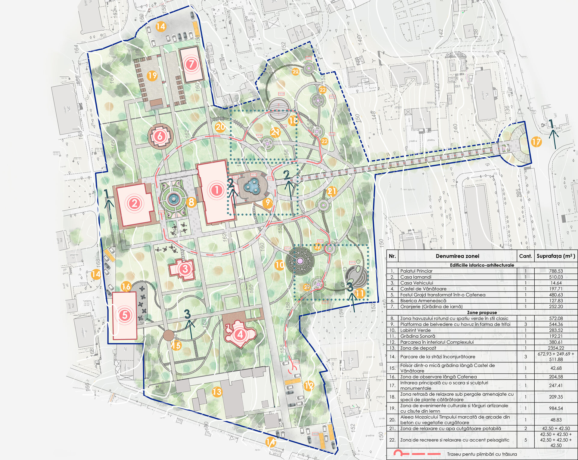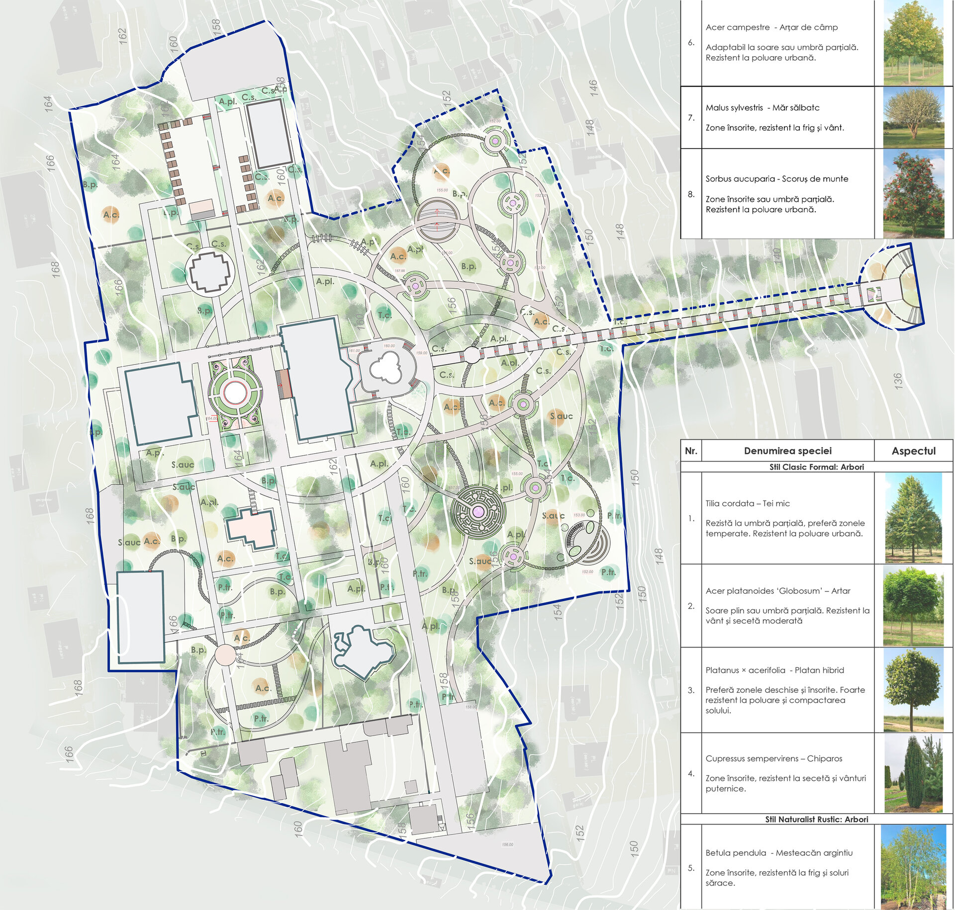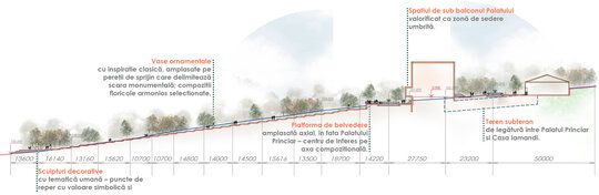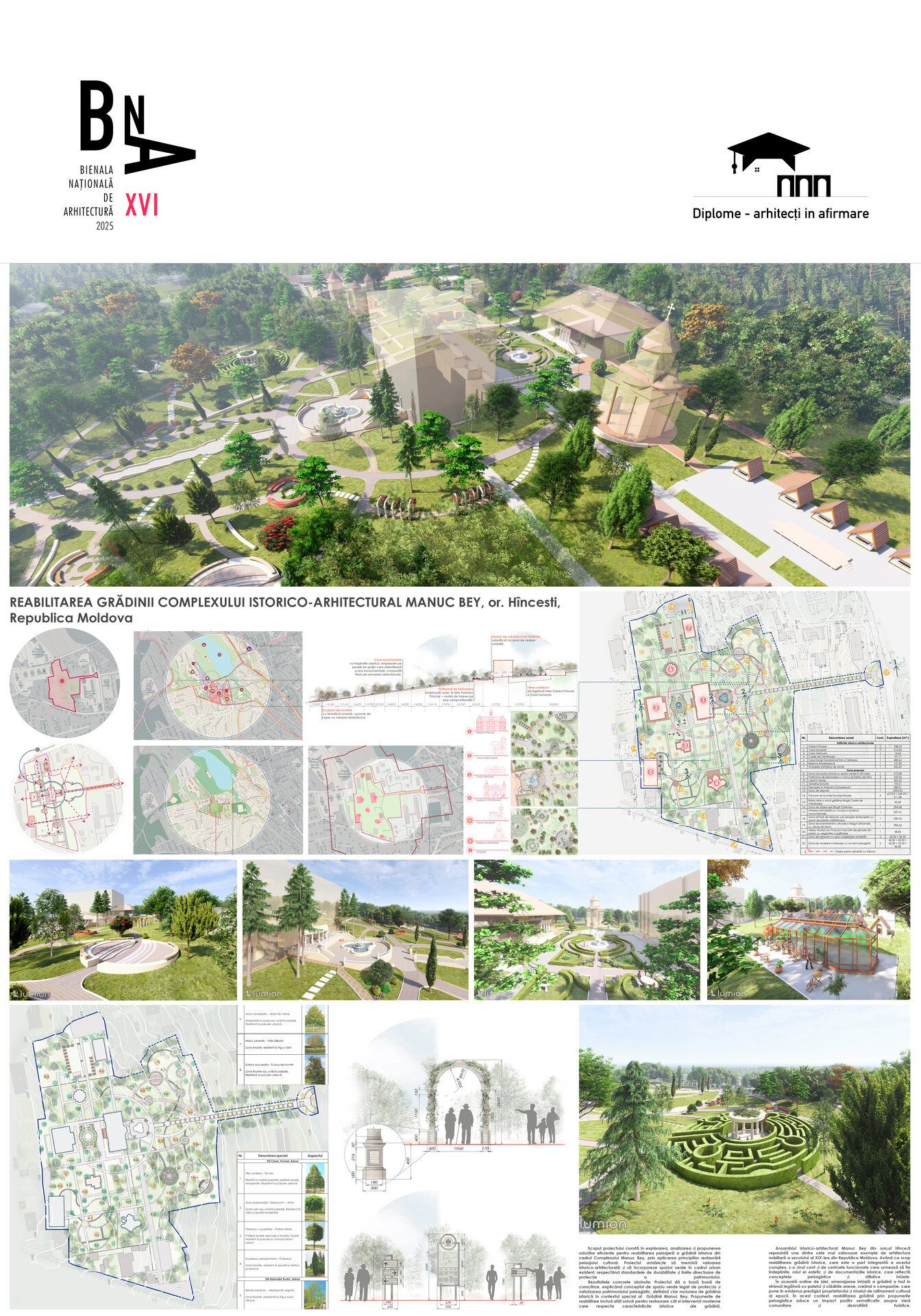 Reabilitarea propusă păstrează atmosfera de epocă și o reinterpretează pentru generațiile actuale, oferind vizitatorilor o experiență unică de conectare între istorie, natură și viața urbană. Conceptul general îmbină două stiluri aparent contrastante – formal, clasic și peisager-rustic – într-o rețea coerentă de axe, trasee și zone funcționale. Propunerea include inventarierea și protejarea vegetației valoroase, reconfigurarea aleilor pentru a crea perspective către clădirile complexului, amenajarea unor zone tematice – de promenadă, repaus și evenimente culturale – precum și introducerea infrastructurii verzi sustenabile (plantări adaptate, mobilier urban discret, soluții ecologice de drenaj). Astfel, grădina este transformată într-un spațiu cultural și recreativ modern, care respectă patrimoniul și răspunde nevoilor comunității actuale. Conceptul propus este repetarea conexiunilor neuronale, utilizat ca metaforă pentru crearea de alei sinuoase. În cadrul reabilitării grădina a fost tratată ca un sistem viu, în care toate zonele tematice-platforme de belvedere, Labirintul verde, cafeneaua în aer liber, Grădina sonoră, aleea Mozaicului Timpului - sunt conectate logic prin perspective coerente. Aceste conexiuni simbolizează transmiterea memoriei și a sensului istoric, creând o rețea peisagistică care stimulează explorarea și înțelegerea locului de către vizitatori. Una dintre propunerile centrale este introducerea unui traseu de plimbare cu trăsura, care parcurge zonele-cheie ale grădinii, oferind vizitatorilor o experiență unică, cu accente istorice. În același timp, traseul evidențiază zonele atractive din punct de vedere vizual și simbolic, precum havuzurile istorice care au fost reintegrate în pozițiile originale, labirintul verde cu scop recreativ, grădina sonoră cu instalații muzicale interactive și cafeneaua în aer liber.