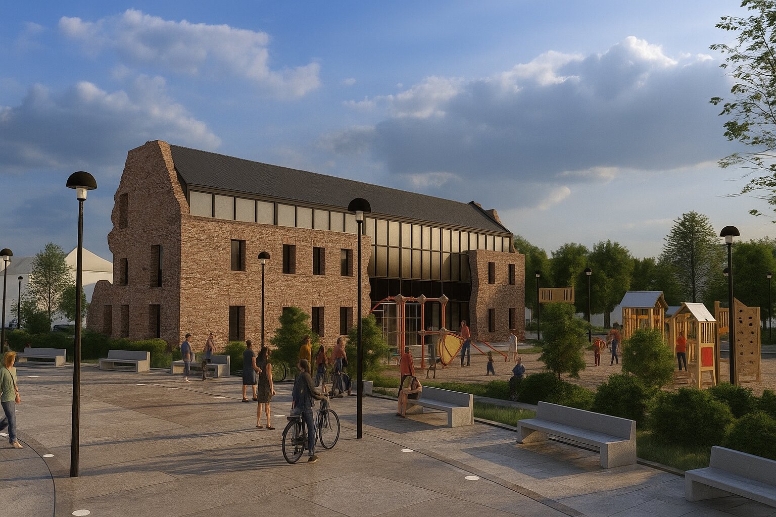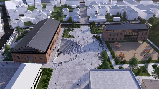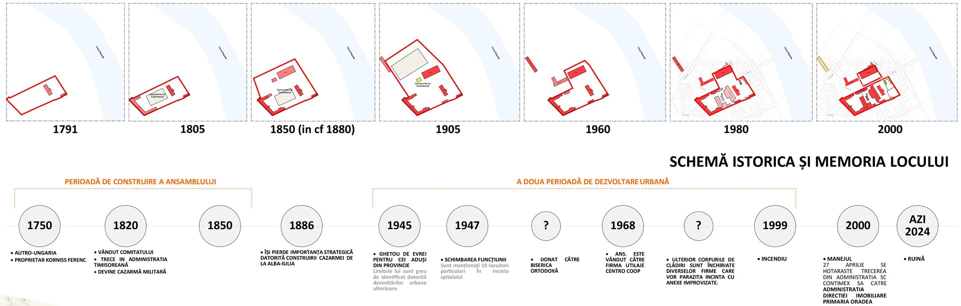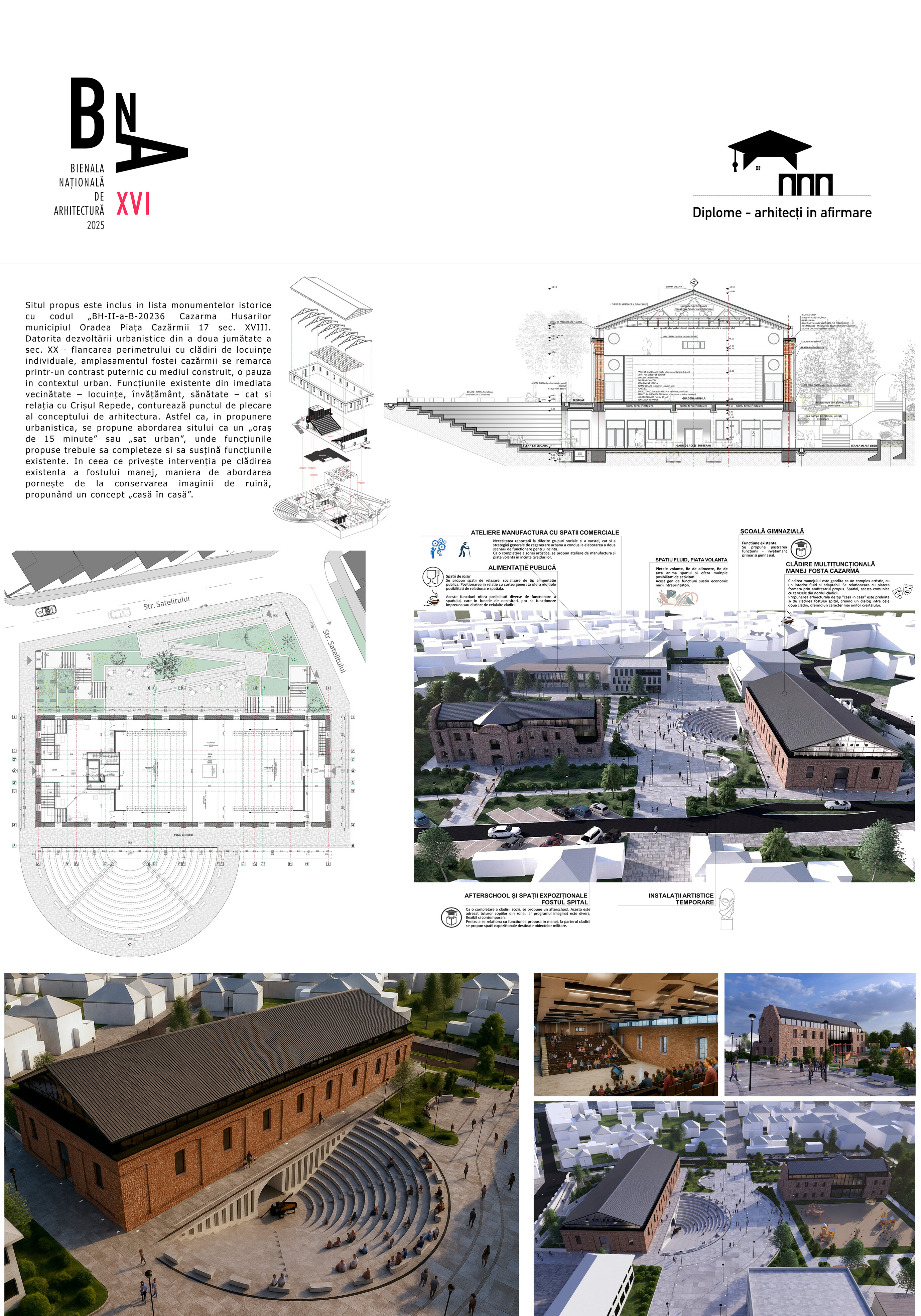 Situl propus este inclus in lista monumentelor istorice cu codul „BH-II-a-B-20236 Cazarma Husarilor municipiul Oradea Piața Cazărmii 17 sec. XVIII. Datorita dezvoltării urbanistice din a doua jumătate a sec. XX - flancarea perimetrului cu clădiri de locuințe individuale, amplasamentul fostei cazărmii se remarca printr-un contrast puternic cu mediul construit, o pauza in contextul urban. Funcțiunile existente din imediata vecinătate – locuințe, învățământ, sănătate – cat si relația cu Crișul Repede, conturează punctul de plecare al conceptului de arhitectura. Astfel ca, in propunere urbanistica, se propune abordarea sitului ca un „oraș de 15 minute” sau „sat urban”, unde funcțiunile propuse trebuie sa completeze si sa susțină funcțiunile existente. In ceea ce privește intervenția pe clădirea existenta a fostului manej, maniera de abordarea pornește de la conservarea imaginii de ruină, propunând un concept „casă în casă”.