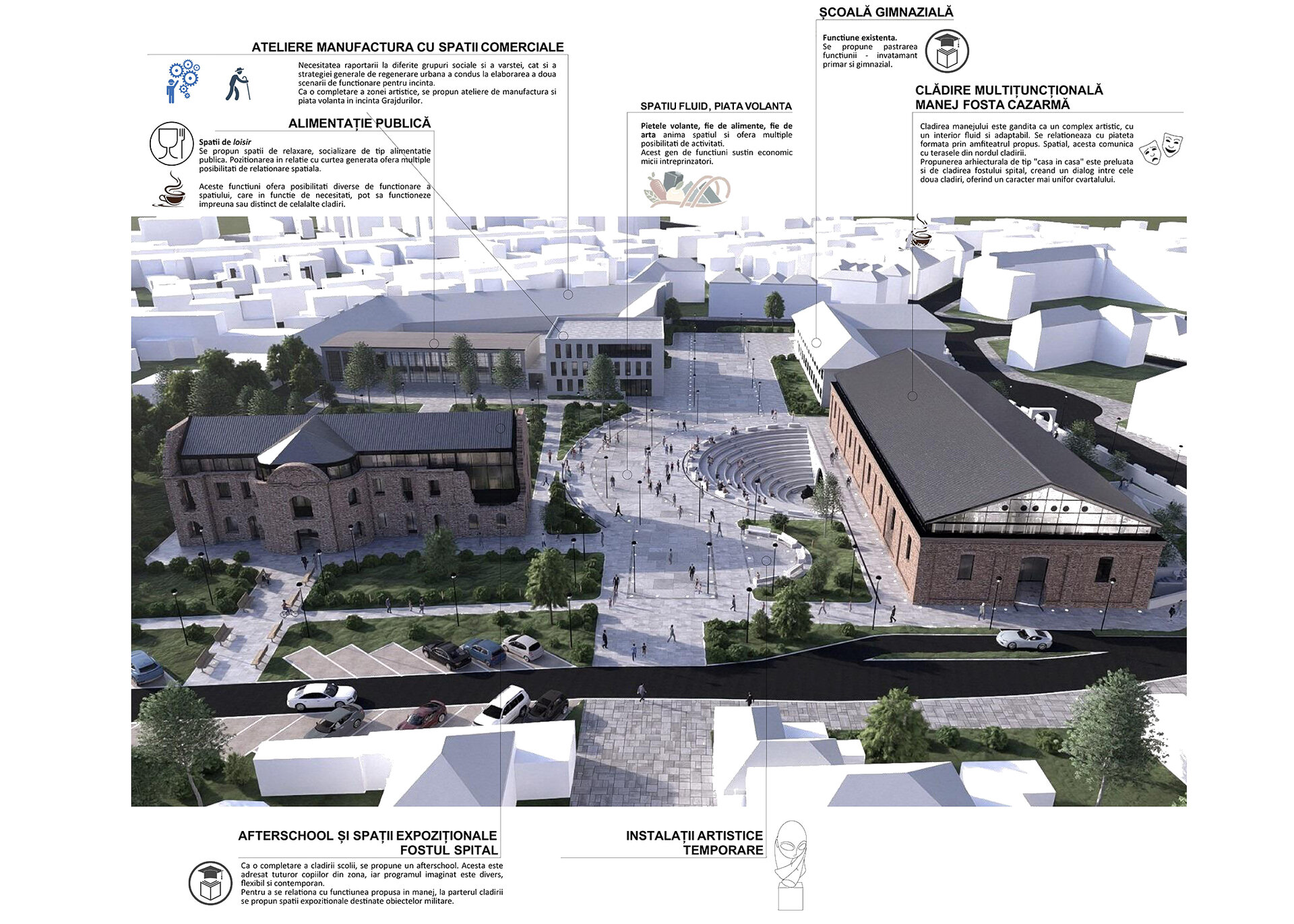 Propunerea arhitecturală mizează pe potentarea imaginii istorice prezente, aceea de ruina stabilizată. Se propune inserarea unor volume clare, simple in interiorul celor două corpuri istorice – clădirea fostului spital si manejul. Se propune acelasi gen de interventie pe ambele clădiri pentru a crea o relatie vizuala si spatiala asupra lor, oferind un caracter mai uniform la nivel intregii incinte.