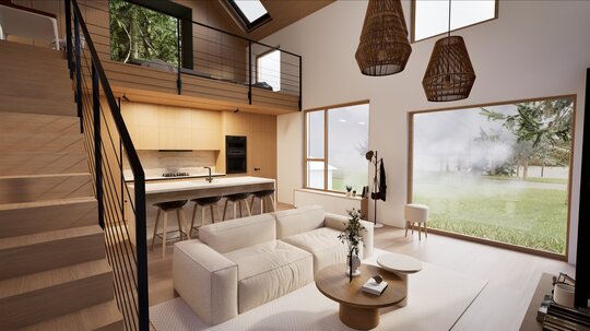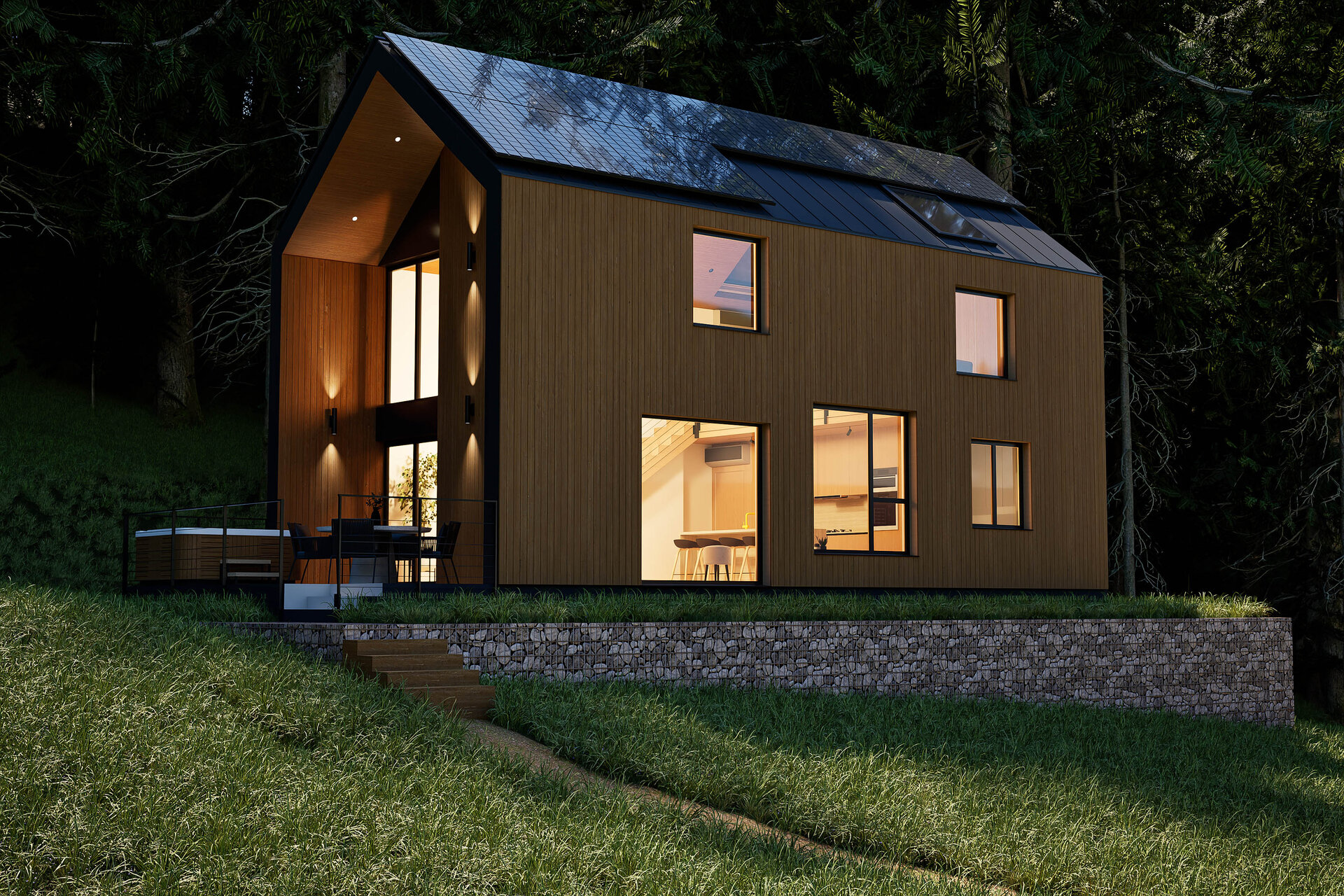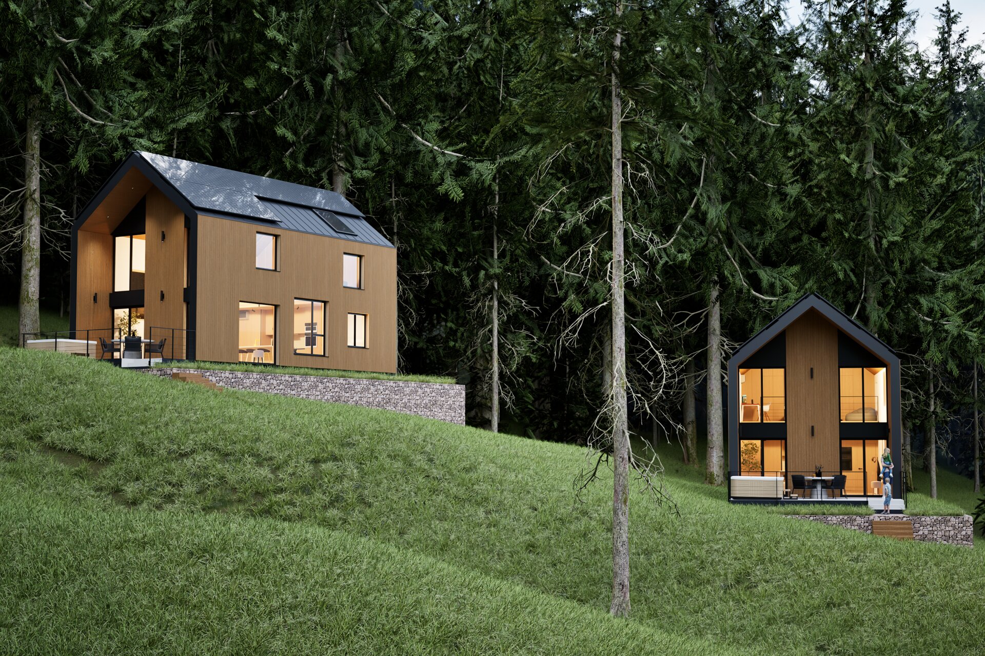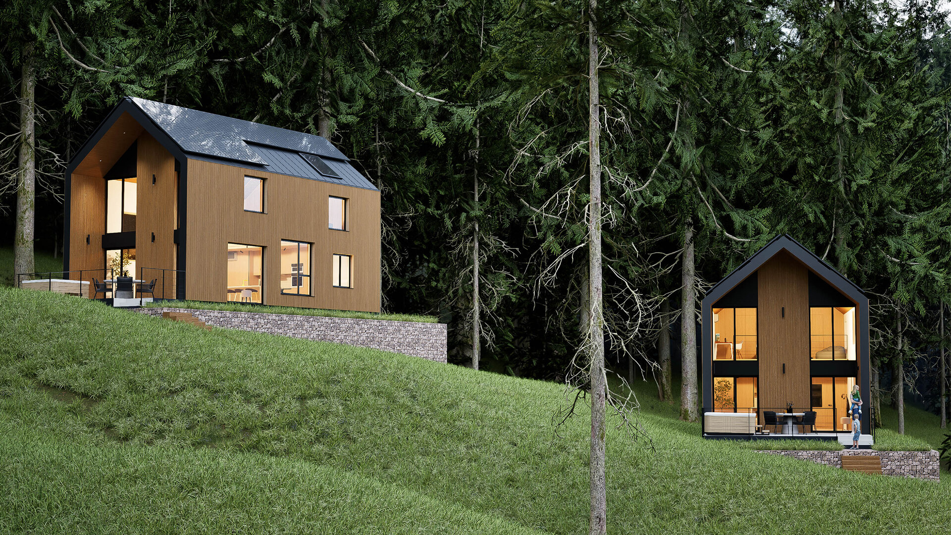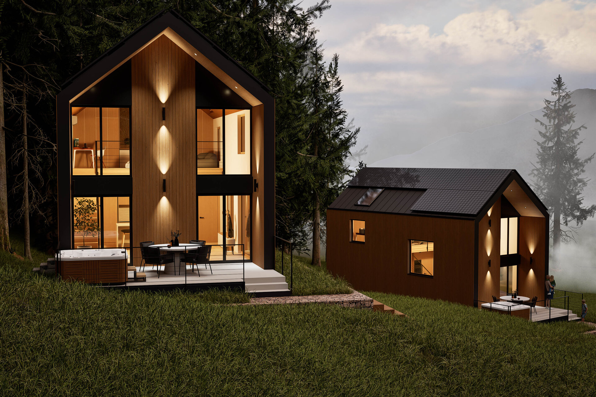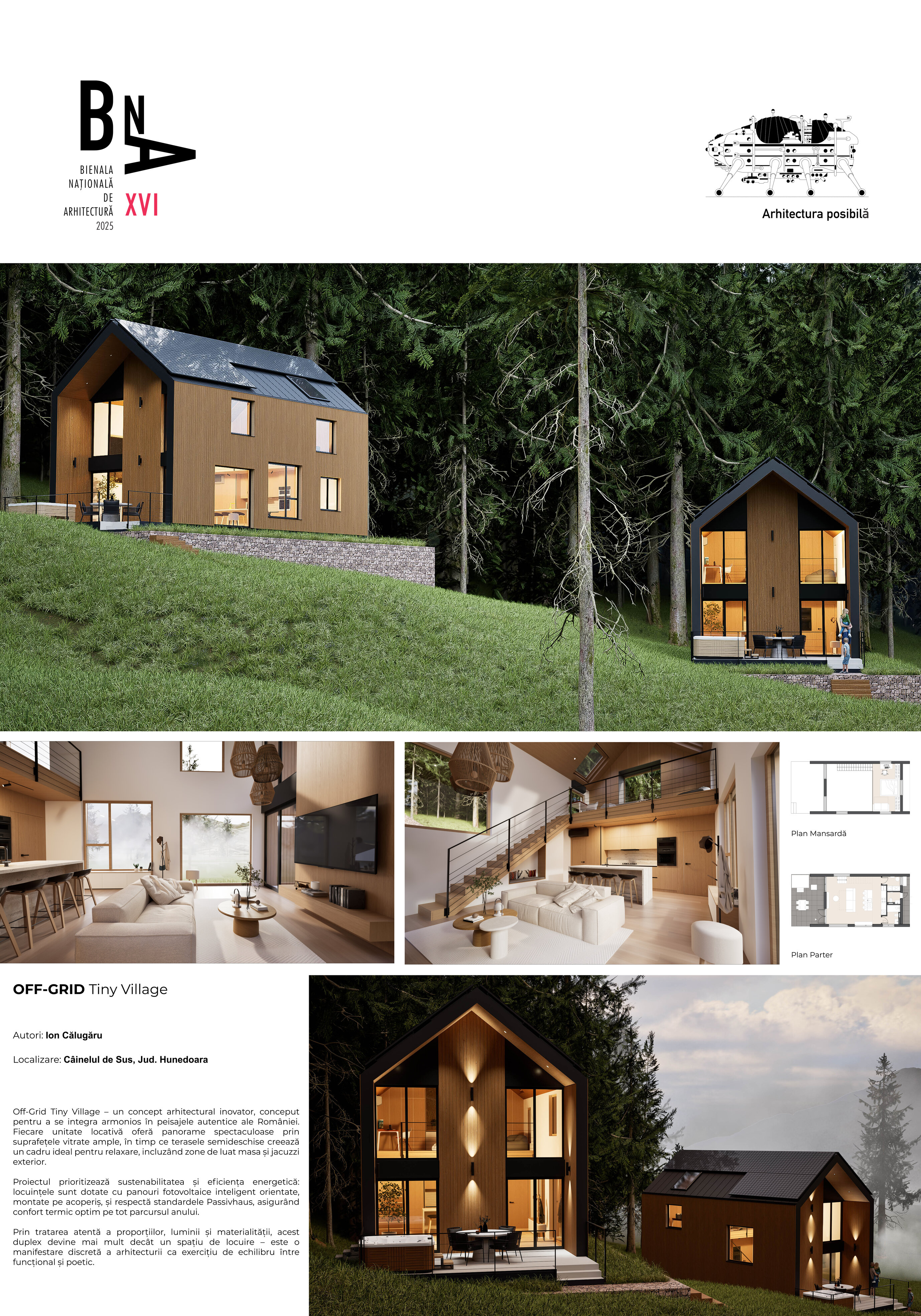 Off-Grid Tiny Village – un concept arhitectural inovator, conceput pentru a se integra armonios în peisajele autentice ale României. Fiecare unitate locativă oferă panorame spectaculoase prin suprafețele vitrate ample, în timp ce terasele semideschise creează un cadru ideal pentru relaxare, incluzând zone de luat masa și jacuzzi exterior.