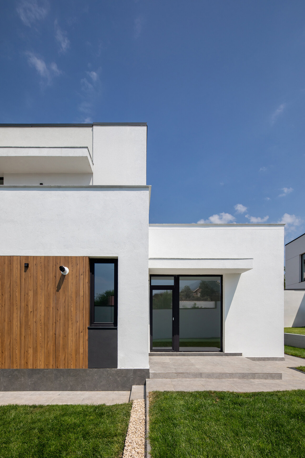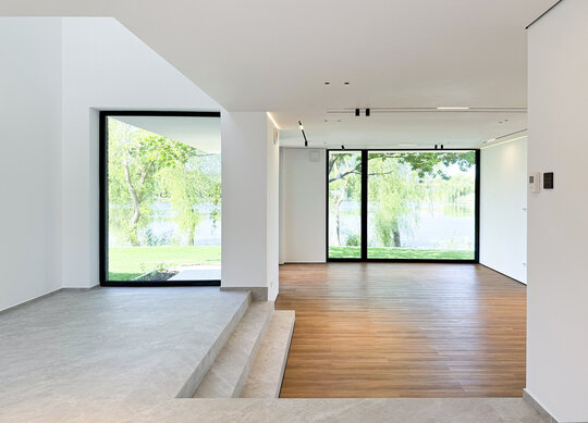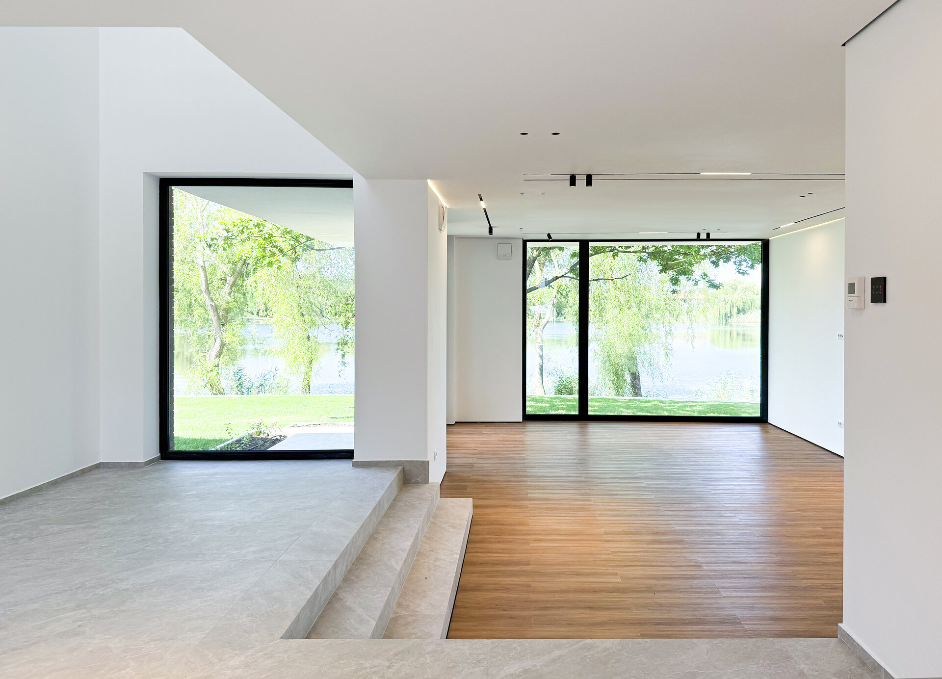 Volumetria parterului este articulată prin extensii orientate către cele patru puncte cardinale, rezultând o planimetrie neuniformă, aproape tentaculară. Aceste proeminențe sunt determinate de dorința de a capta perspective spre lac din toate funcțiunile principale. Am încercat sa surprindem aceste perspective unice prin cadrarea lor in diferite “rame”, de la porticul auto ce filtrează accesul către lac, la ferestrele ample poziționate strategic.