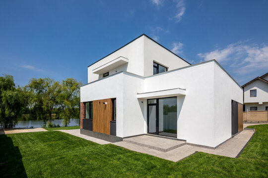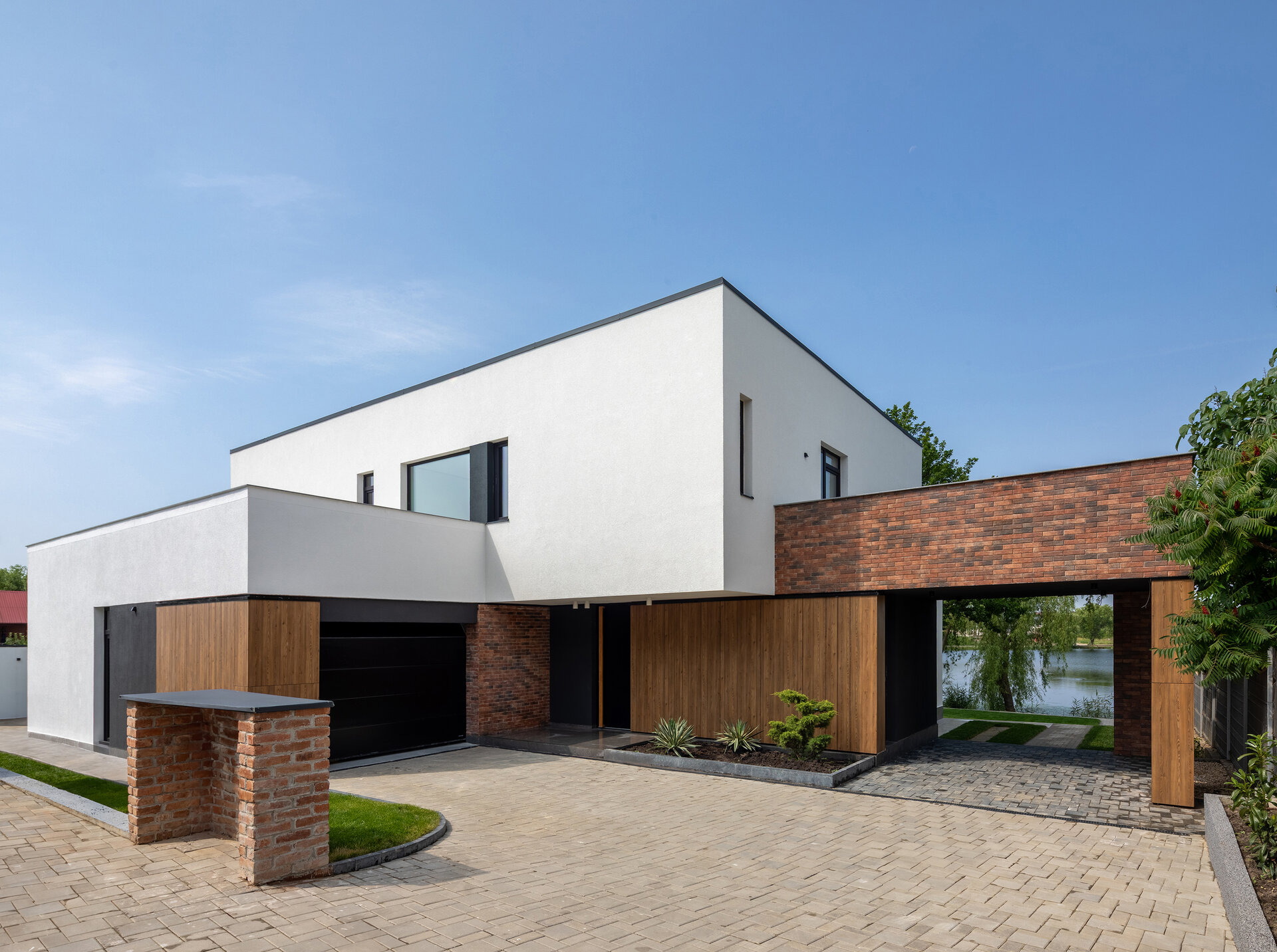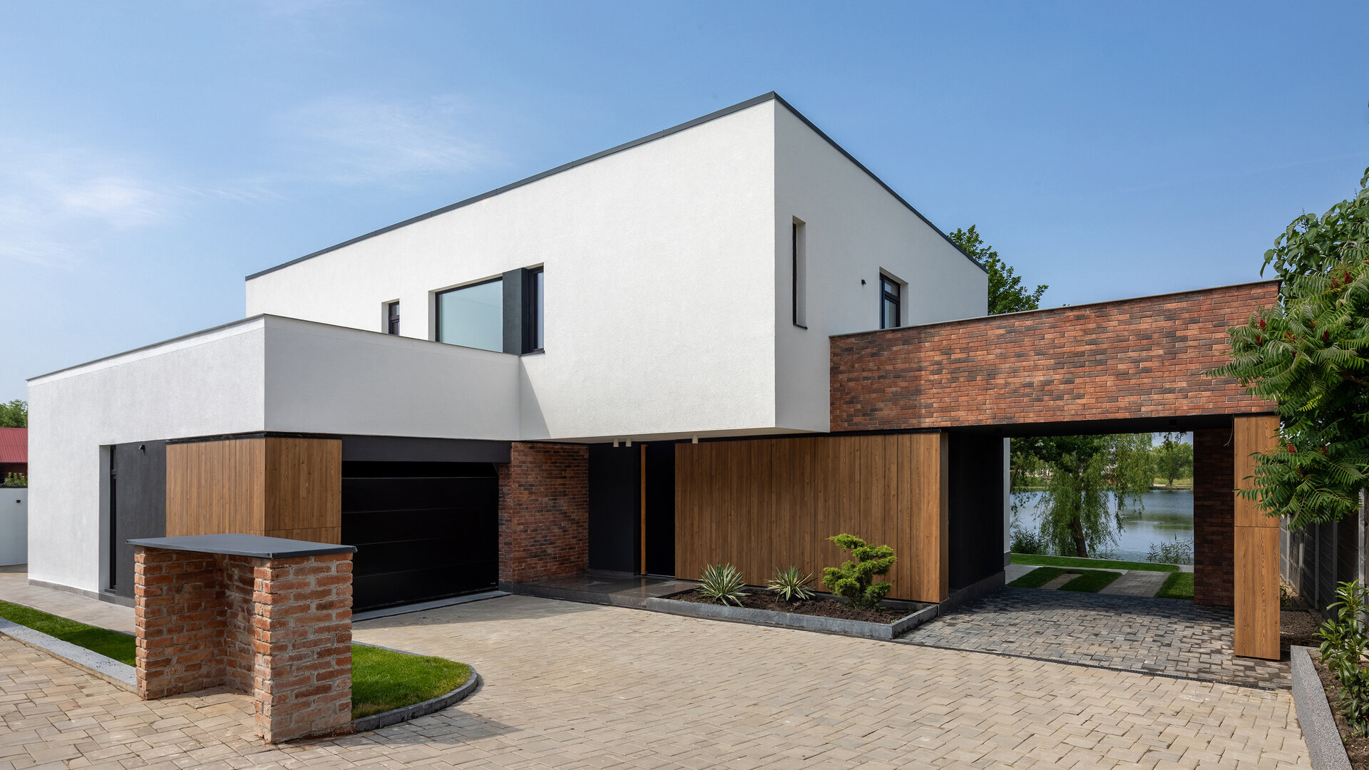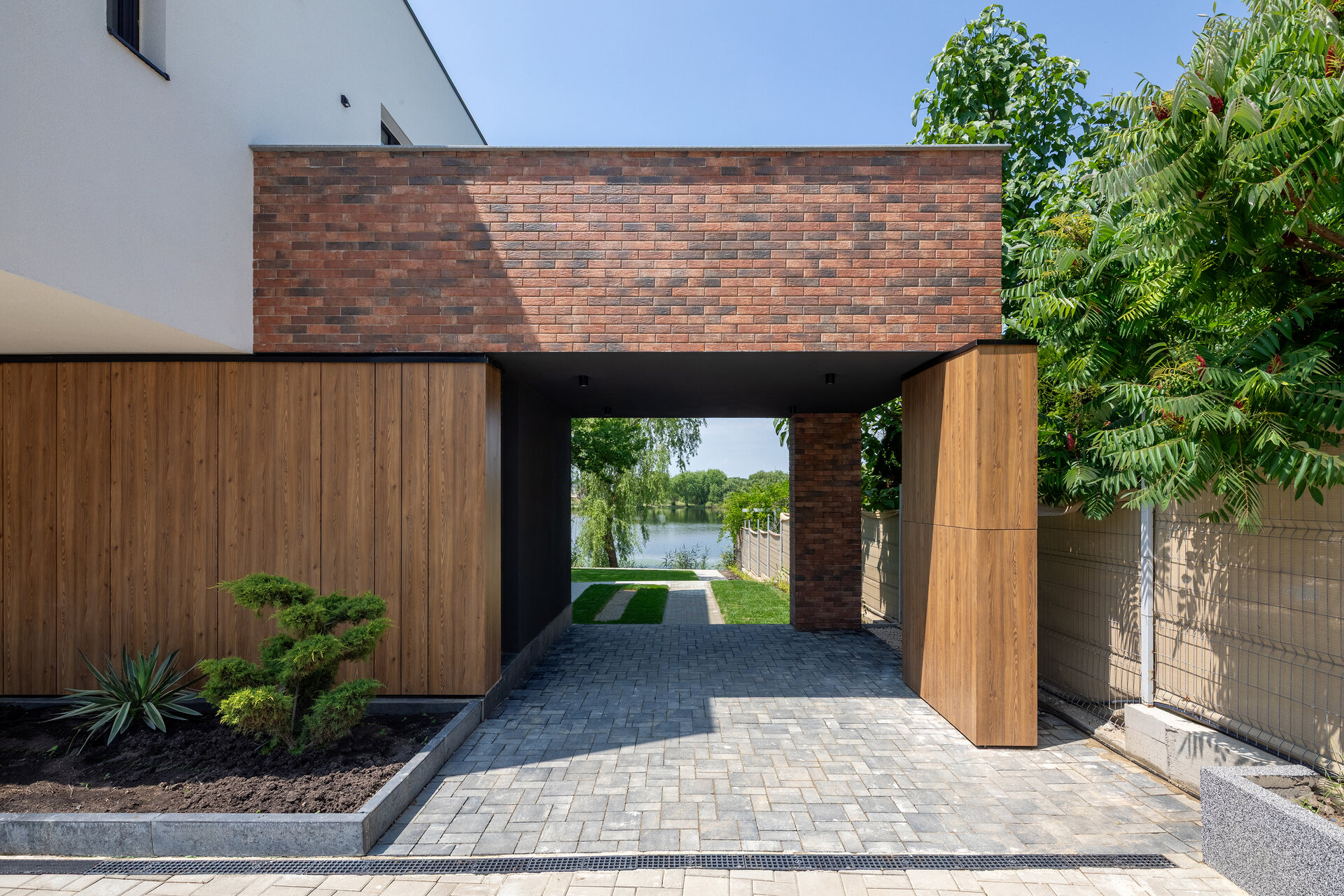 Volumetria parterului este articulată prin extensii orientate către cele patru puncte cardinale, rezultând o planimetrie neuniformă, aproape tentaculară. Aceste proeminențe sunt determinate de dorința de a capta perspective spre lac din toate funcțiunile principale. Am încercat sa surprindem aceste perspective unice prin cadrarea lor in diferite “rame”, de la porticul auto ce filtrează accesul către lac, la ferestrele ample poziționate strategic.