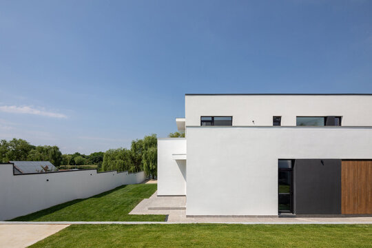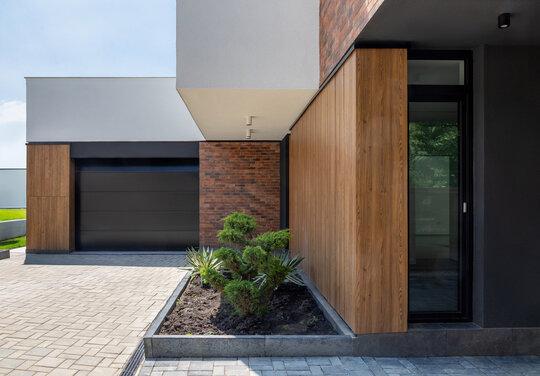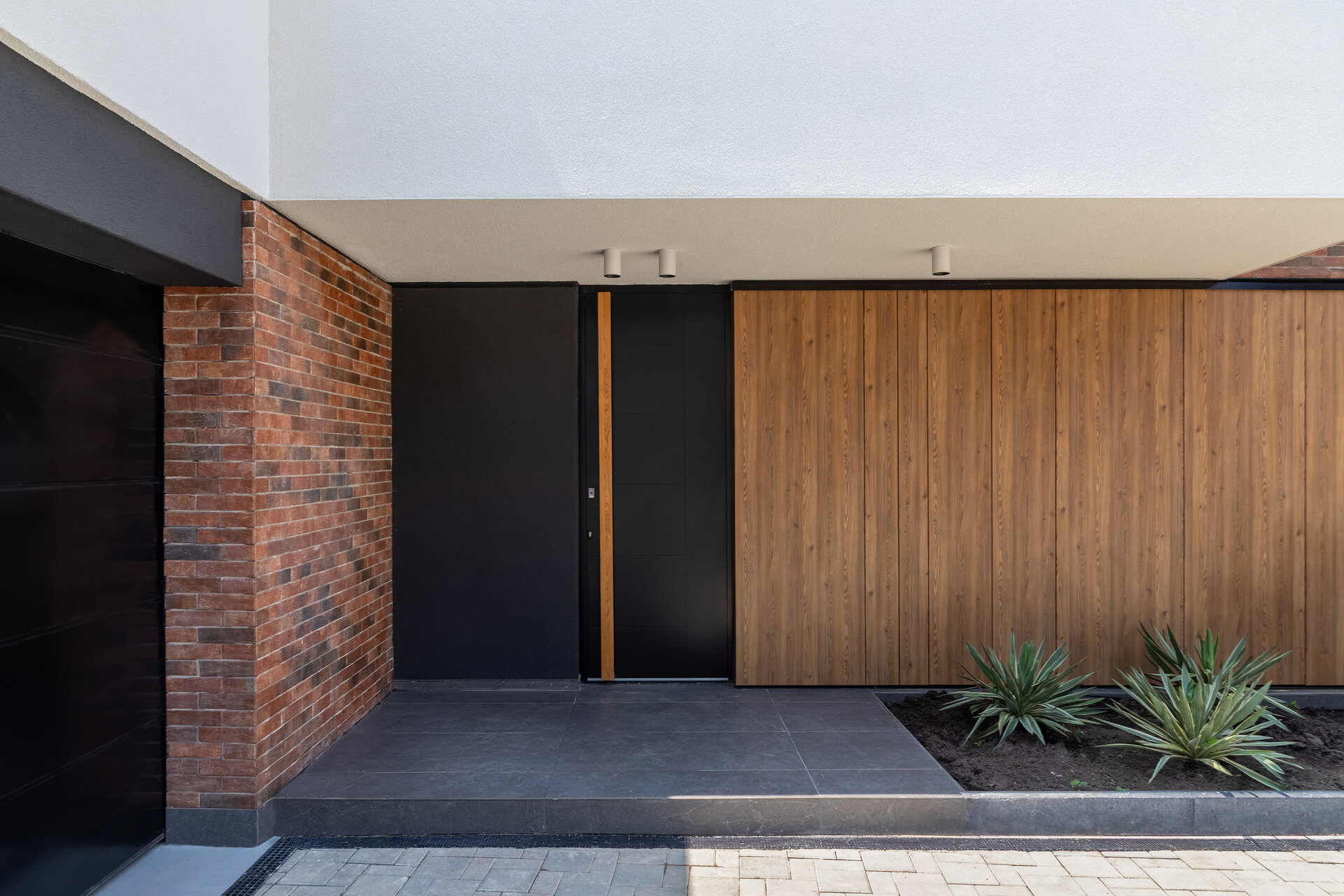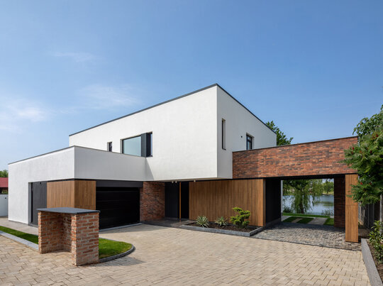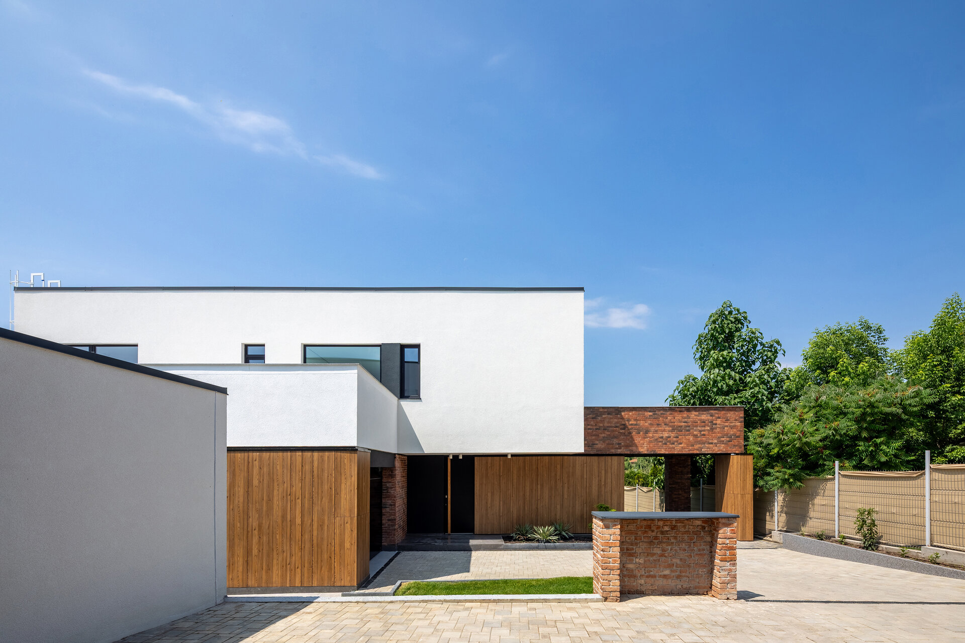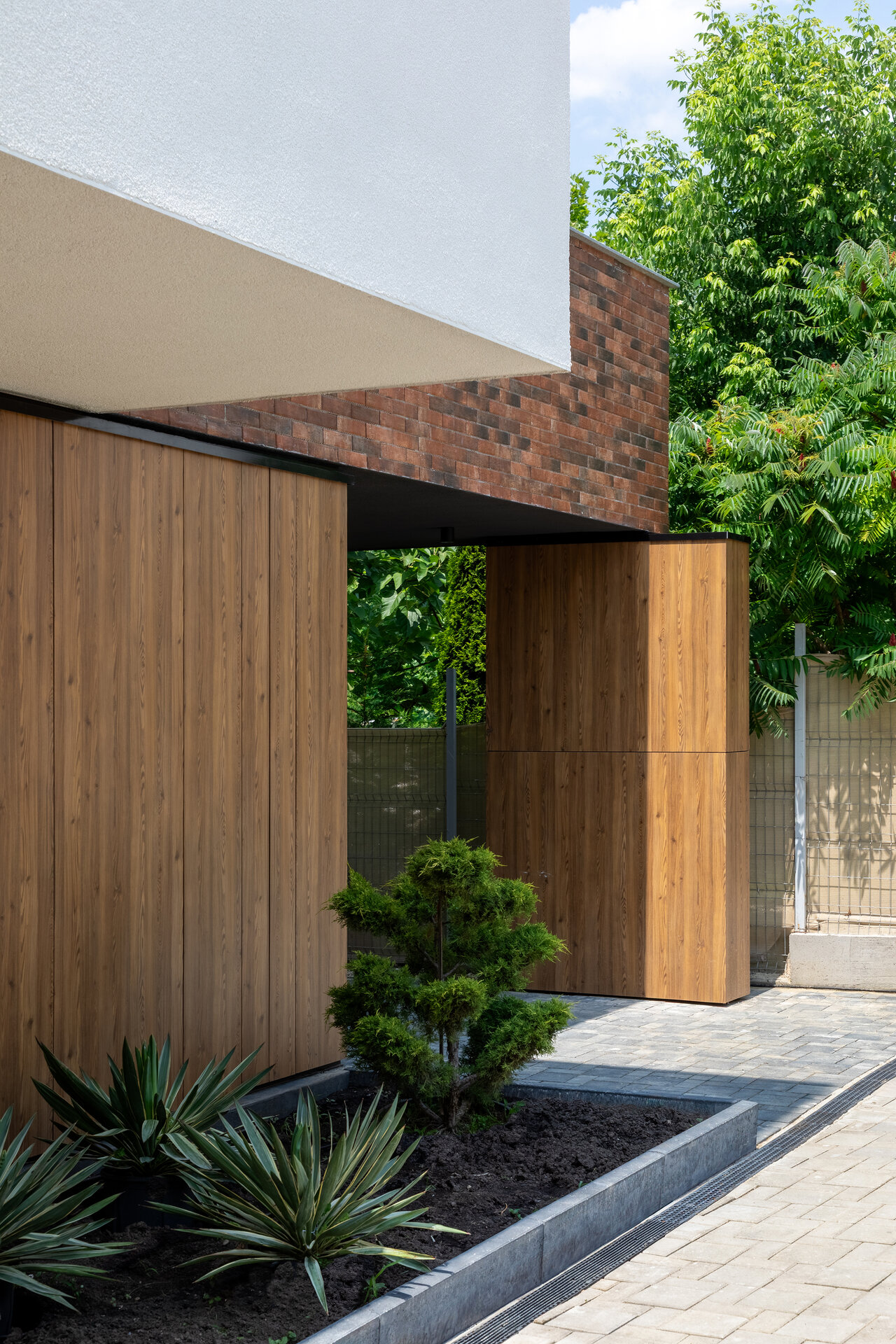 Fațada este placată cu panouri din lemn de stejar, ca o prelungire a acestui element natural în arhitectură. Parte din cărămida folosită a fost recuperată dintr-o anexă gospodărească existentă anterior pe teren