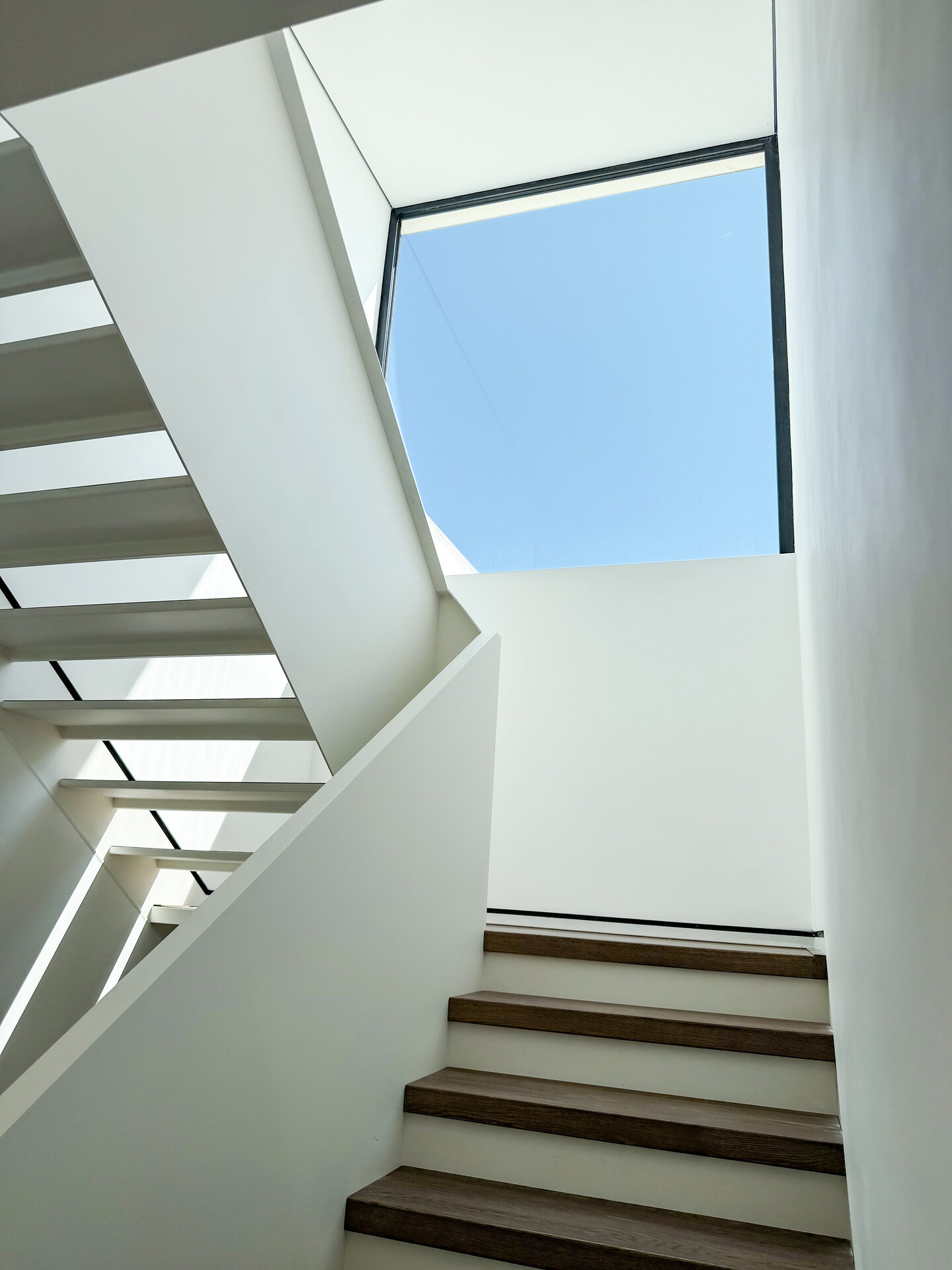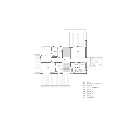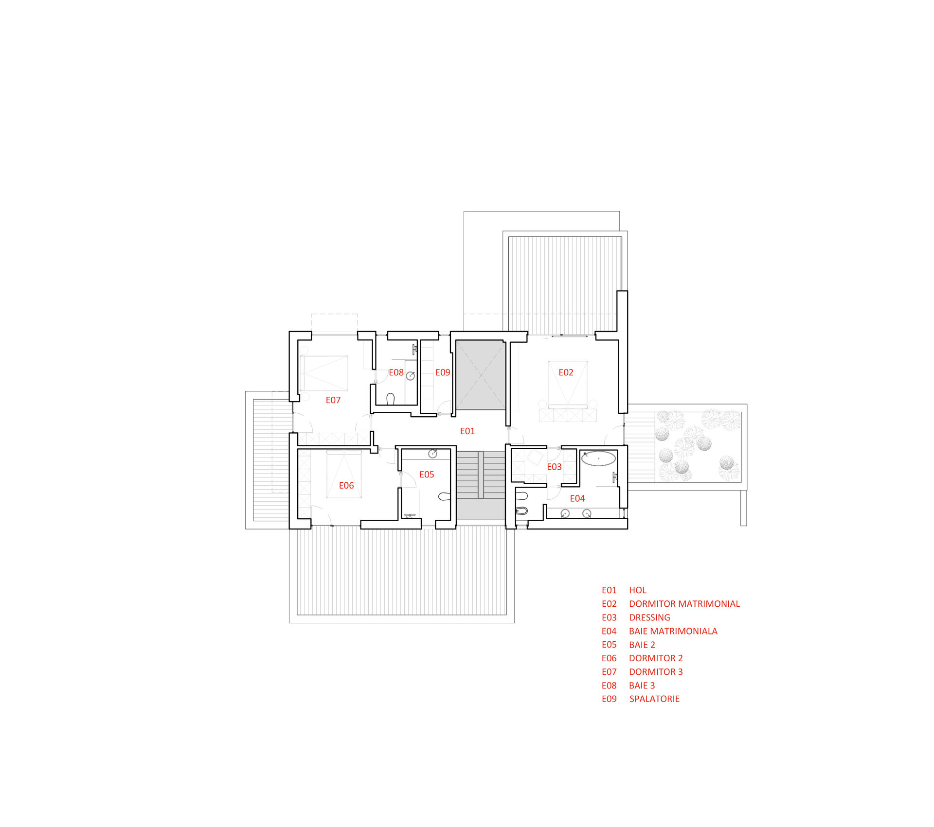 Etajul este dedicat zonei de noapte, unde pasarela de peste dining are rolul secundar de a separa aparatul dormitorului matrimonial de restul zonei de noapte, pentru un plus de intimitate. Toate dormitoarele au deschidere către terase individuale, gândite ca extensii naturale ale spațiilor interioare.